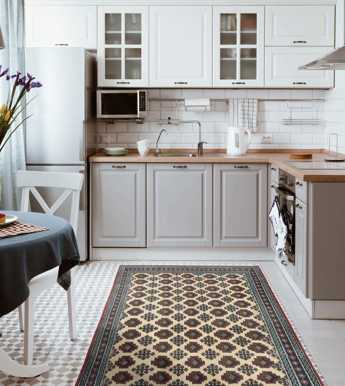 Il y a beaucoup de raisons pour un tapis de cuisine. D'une part, il y a le facteur bien-être. Les tapis créent une atmosphère particulièrement chaleureuse. Ils donnent à l'environnement ce certain quelque chose. Les pièces simples peuvent devenir de véritables accroches grâce à un tapis de laine. Par exemple, un tapis persan au design excitant permet à une cuisine au design discret et blanc de briller d'une lumière à couper le souffle.