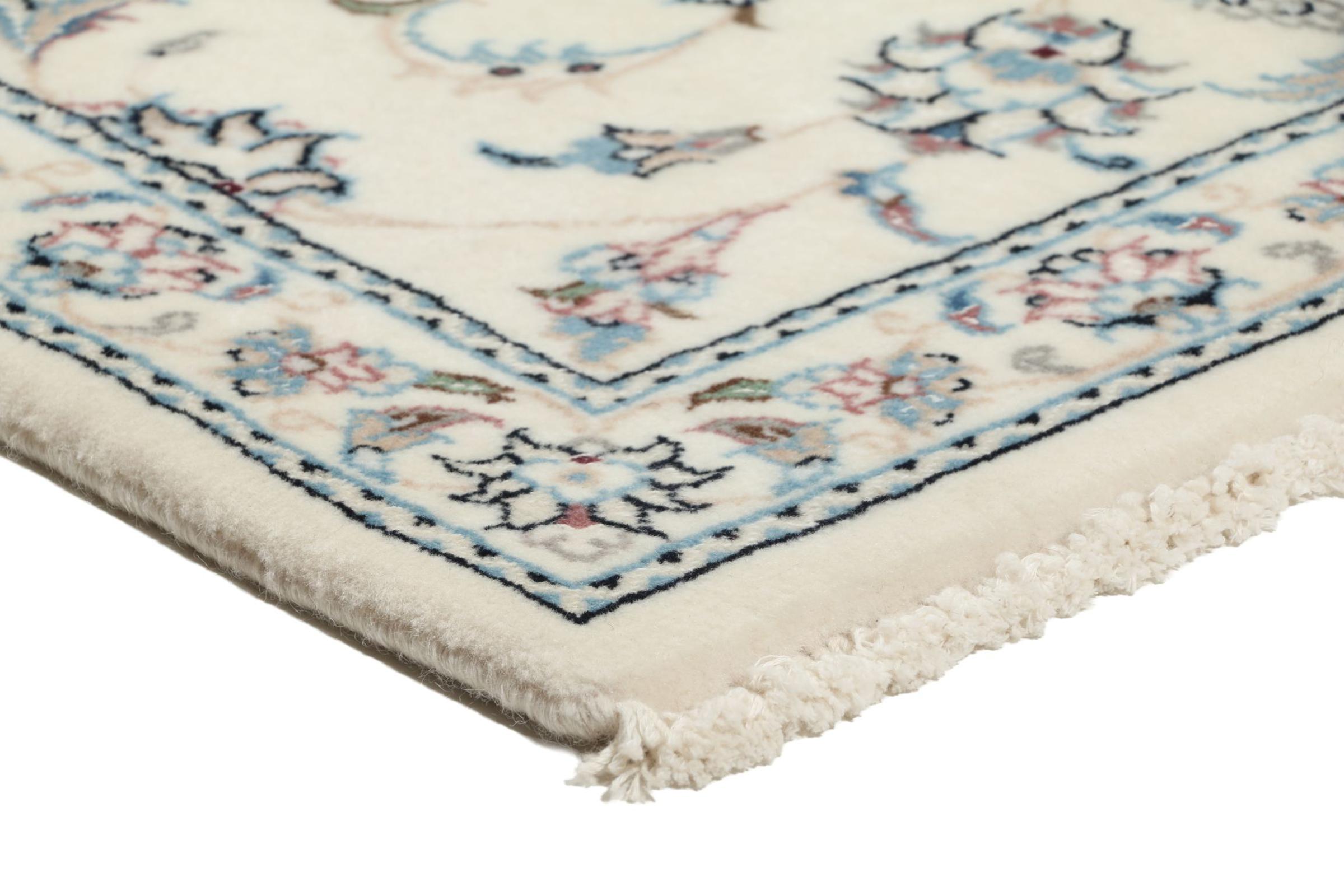Ce tapis Nain est classifié 9La. La bonne qualité et le splendide design oriental avec ses motifs curvilignes inspirent chacun d’entre nous. Ce tapis persan était noué a la main avec de la laine précieuse et de la soie naturelle à Nain, une ville située à l’extrémité ouest du désert Dasht-e-Kavir.