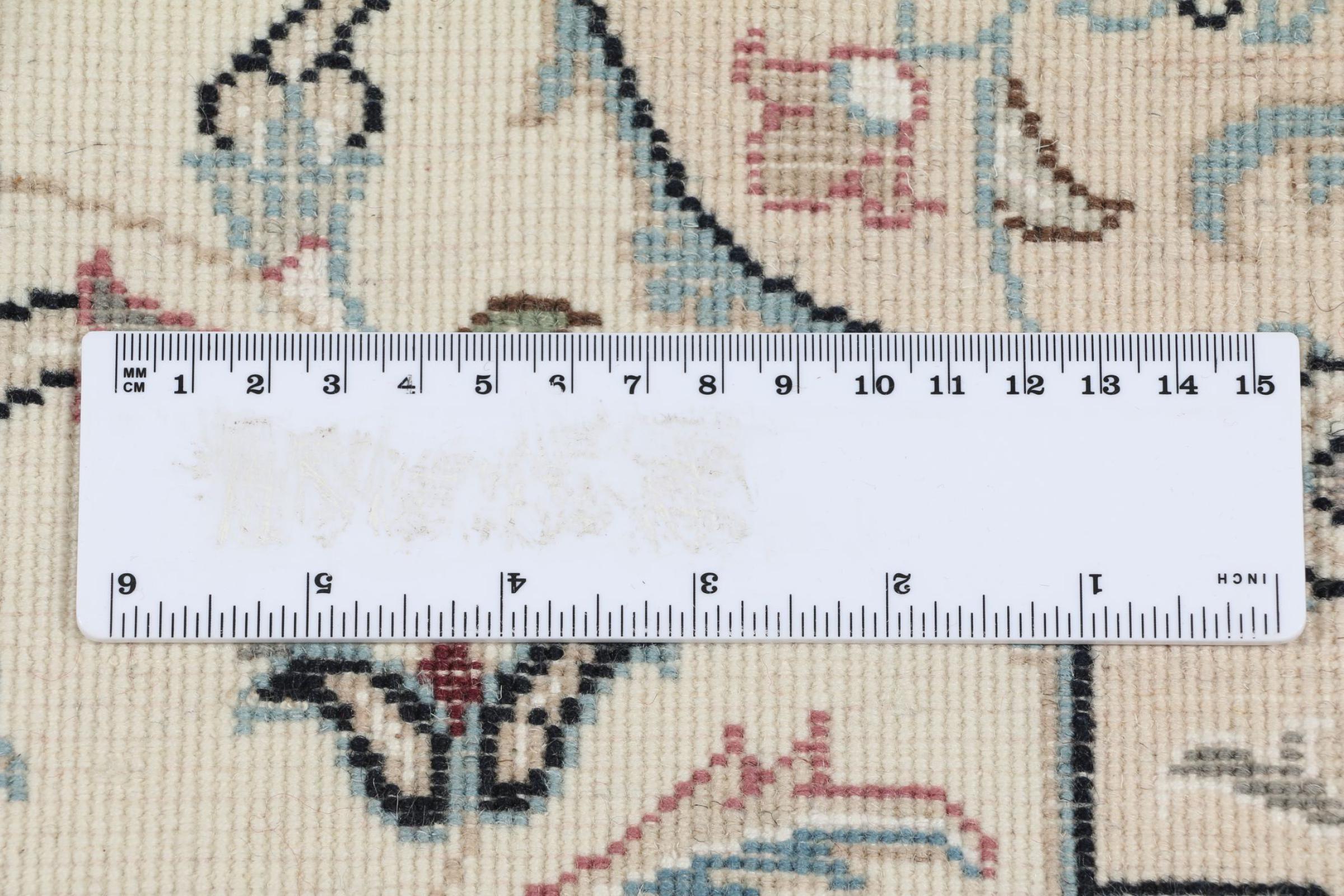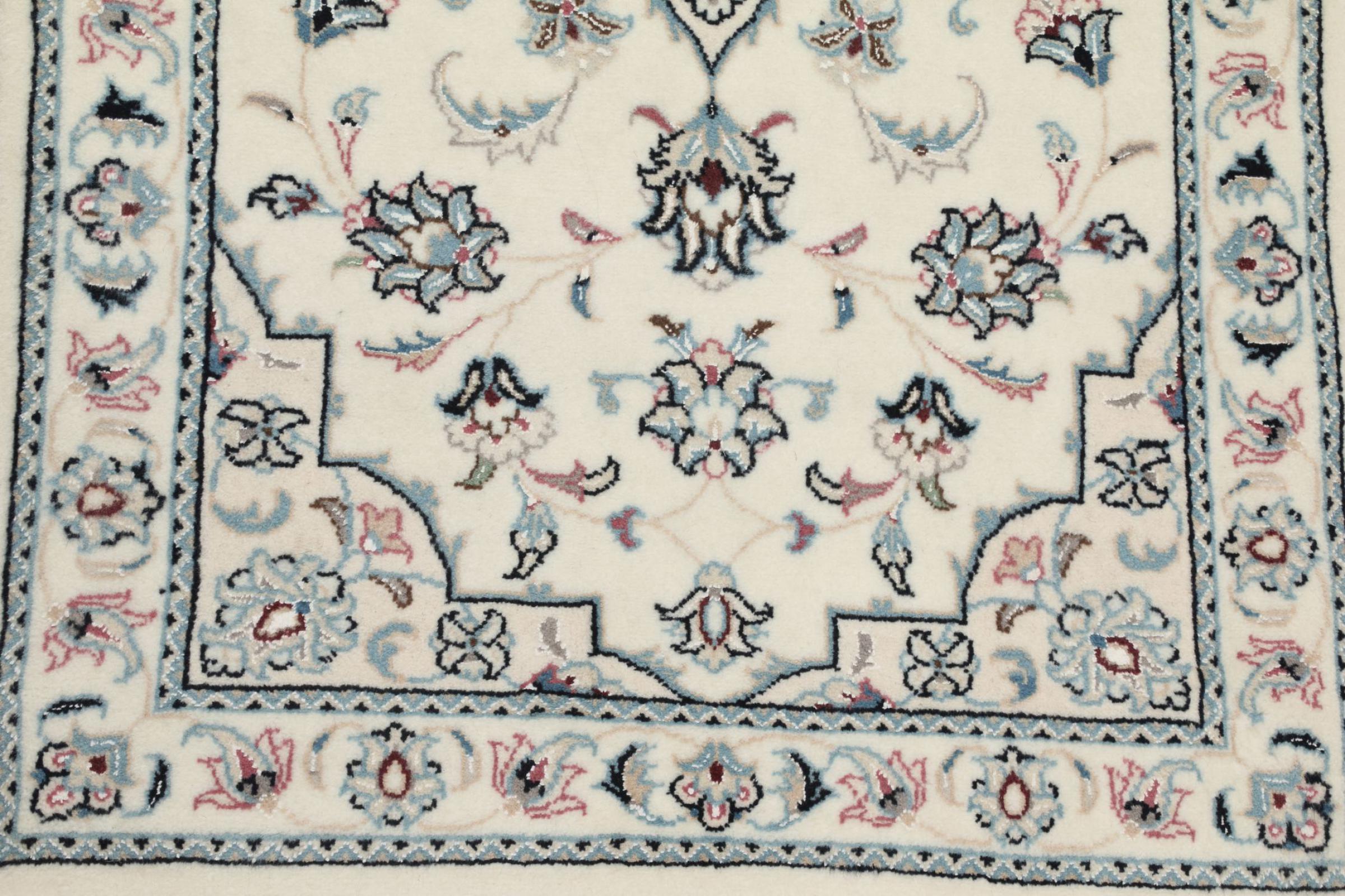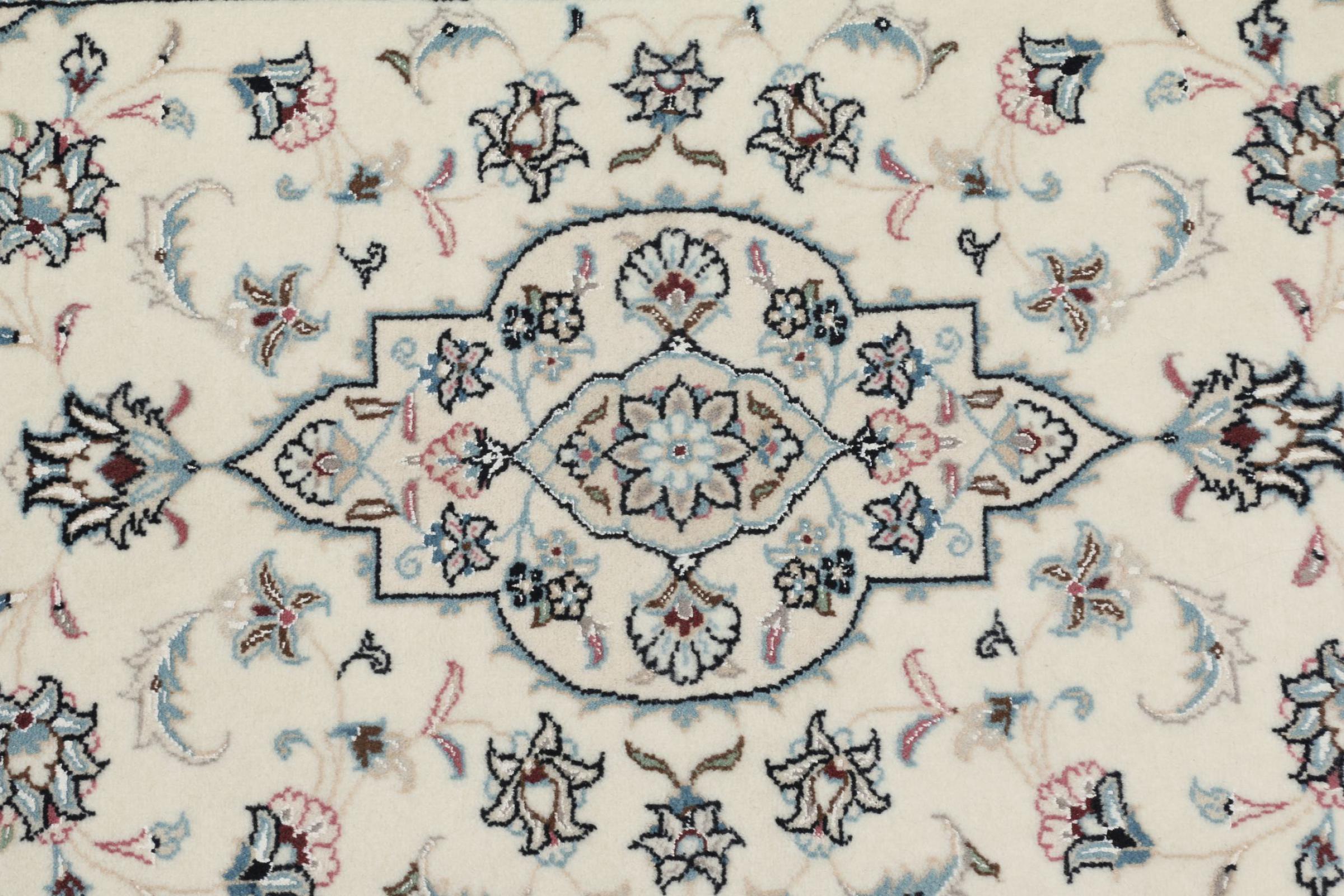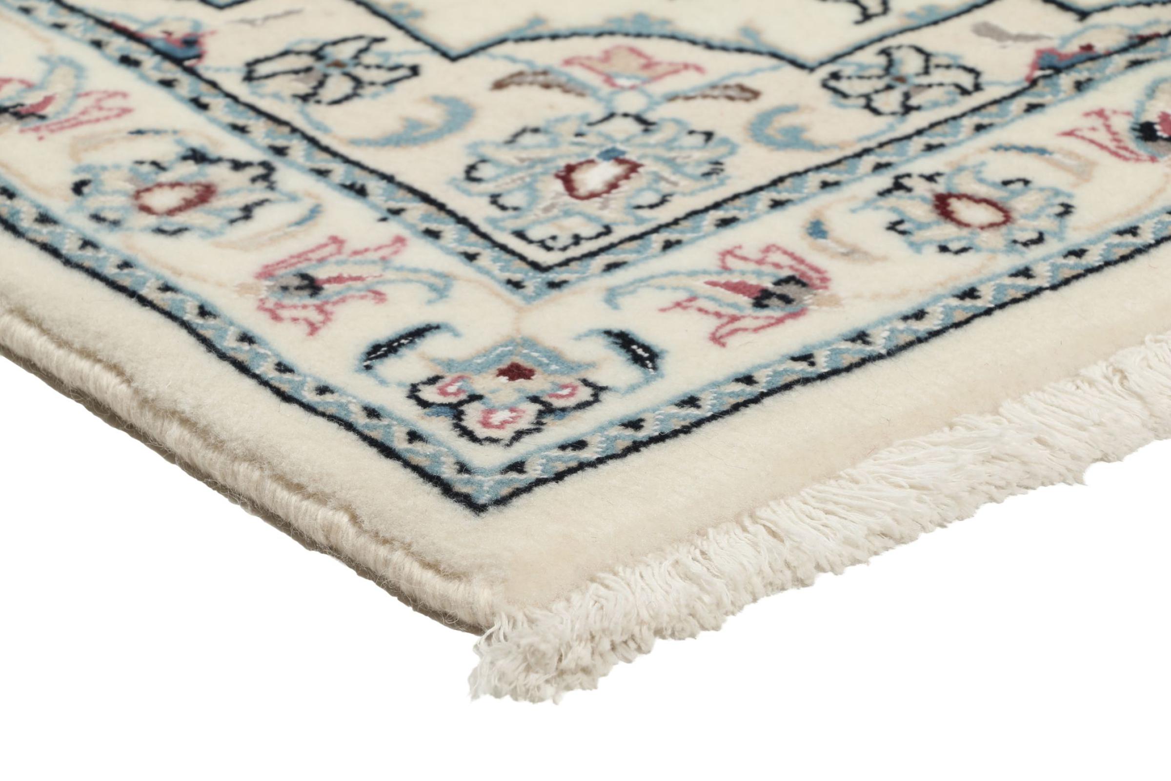 Ce tapis Nain est classifié 9La. La bonne qualité et le splendide design oriental avec ses motifs curvilignes inspirent chacun d’entre nous. Ce tapis persan était noué a la main avec de la laine précieuse et de la soie naturelle à Nain, une ville située à l’extrémité ouest du désert Dasht-e-Kavir.