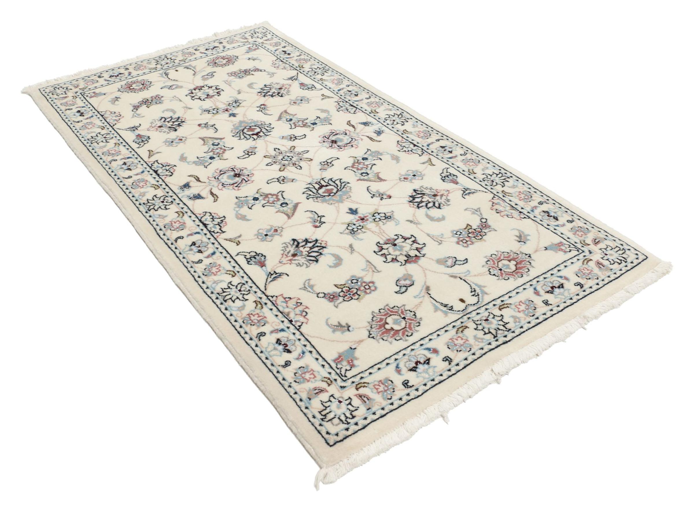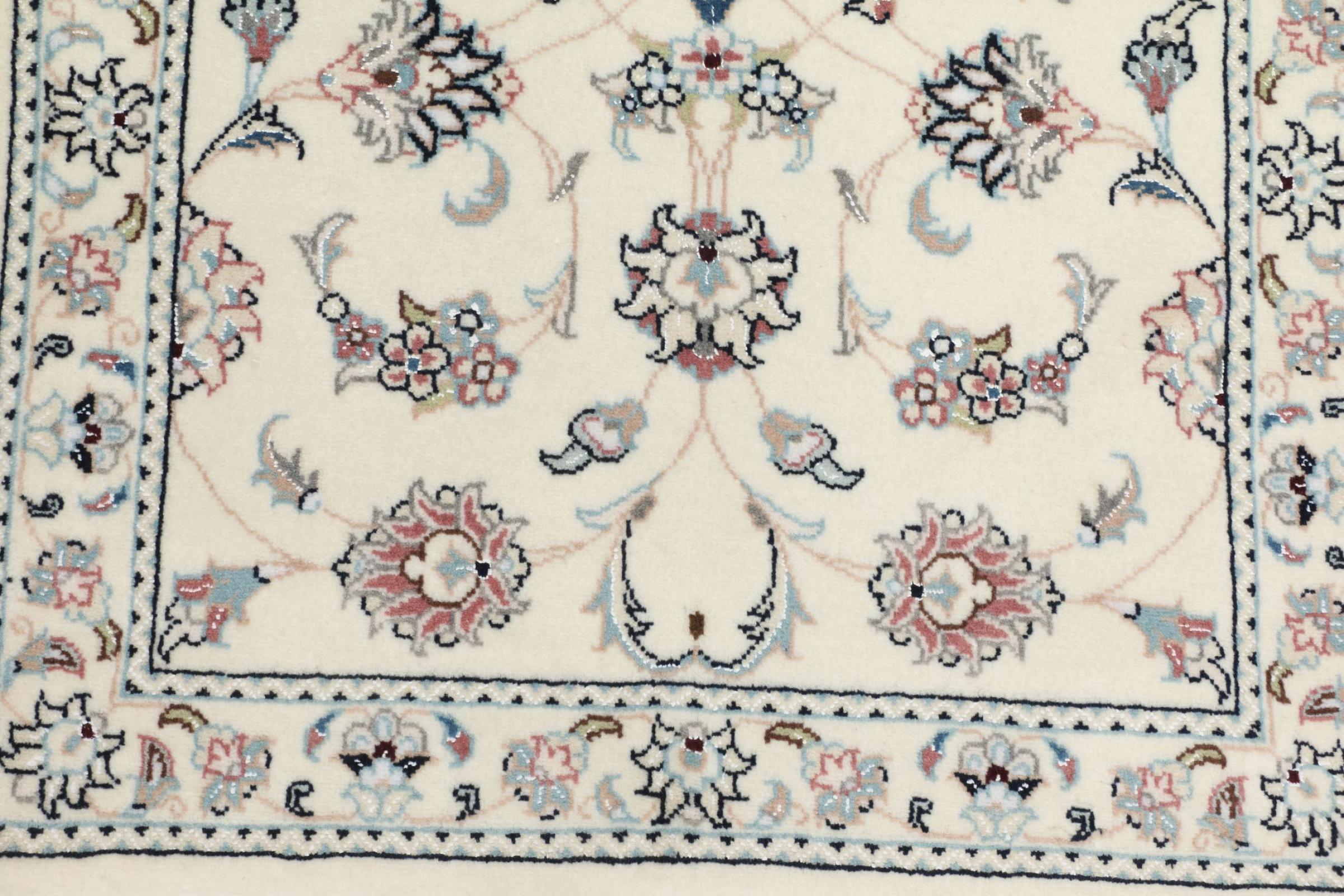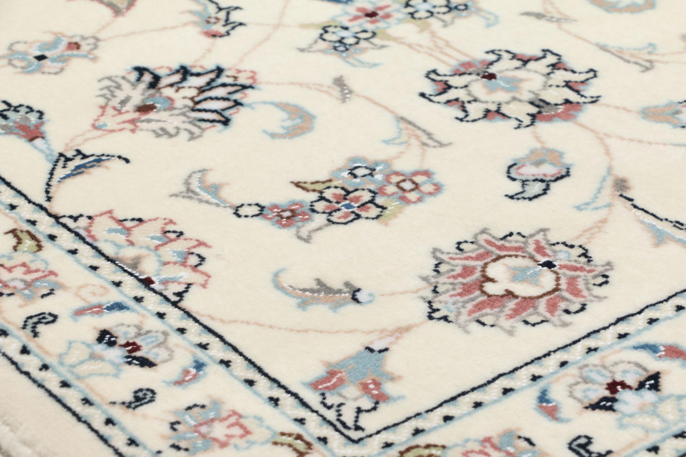 Ce tapis Nain est classifié 9La. La bonne qualité et le splendide design oriental avec ses motifs curvilignes inspirent chacun d’entre nous. Ce tapis persan était noué a la main avec de la laine précieuse et de la soie naturelle à Nain, une ville située à l’extrémité ouest du désert Dasht-e-Kavir.