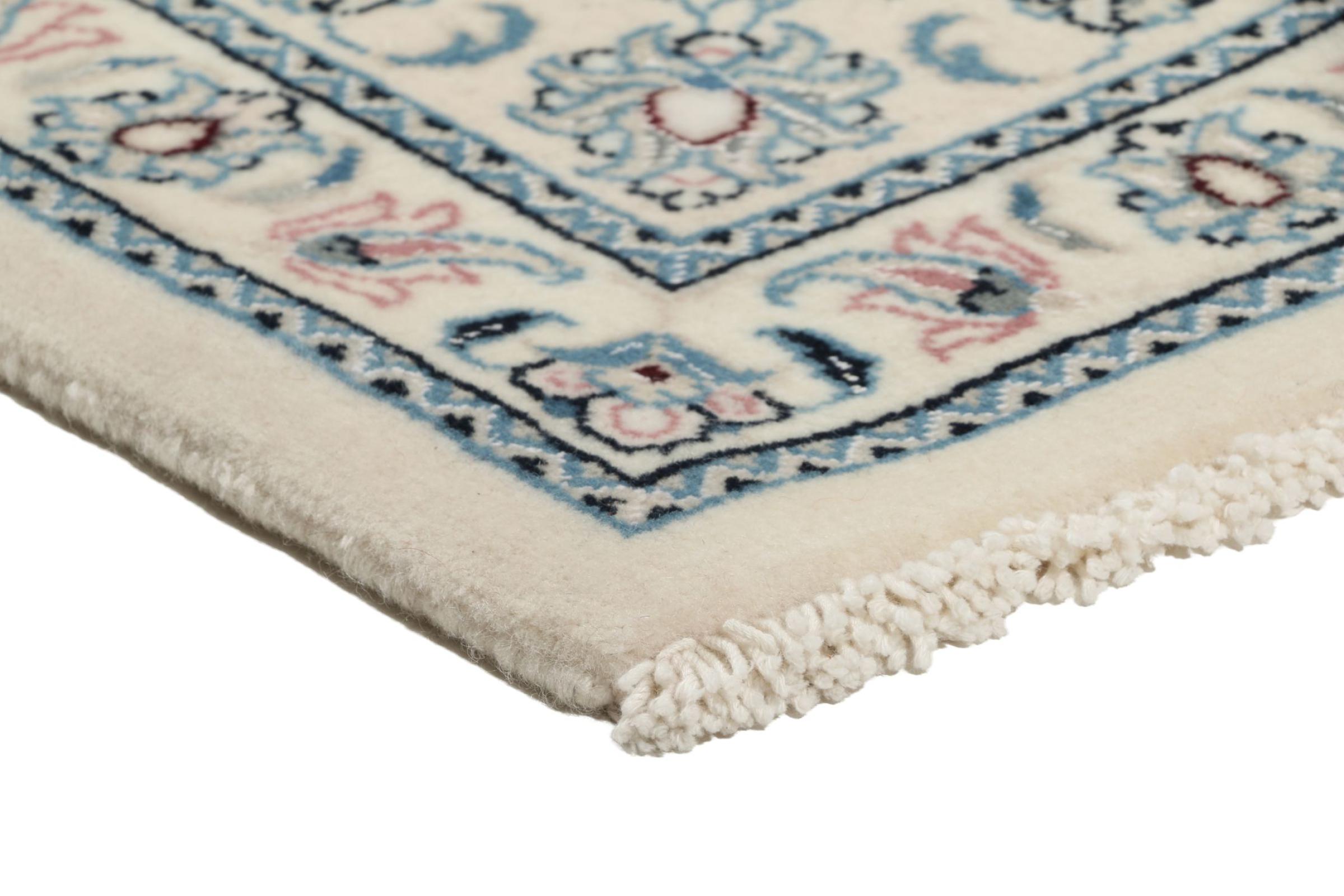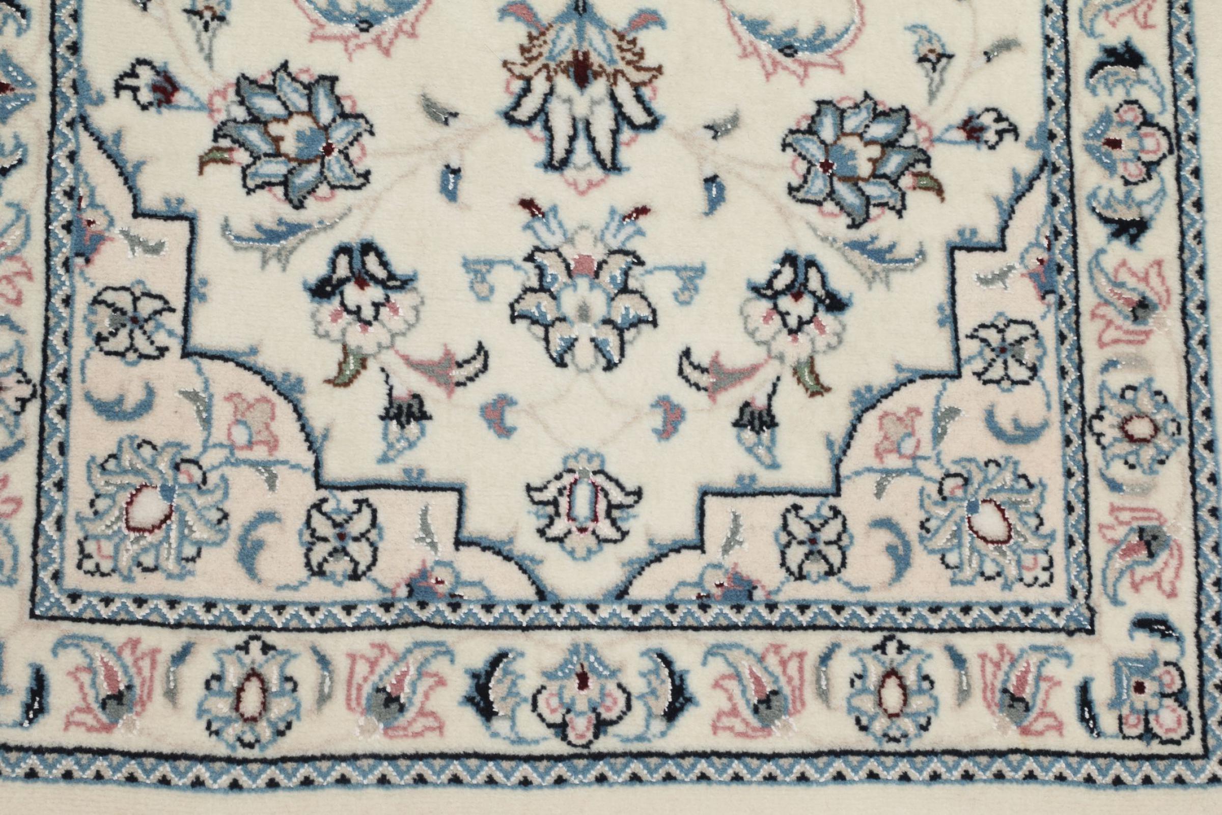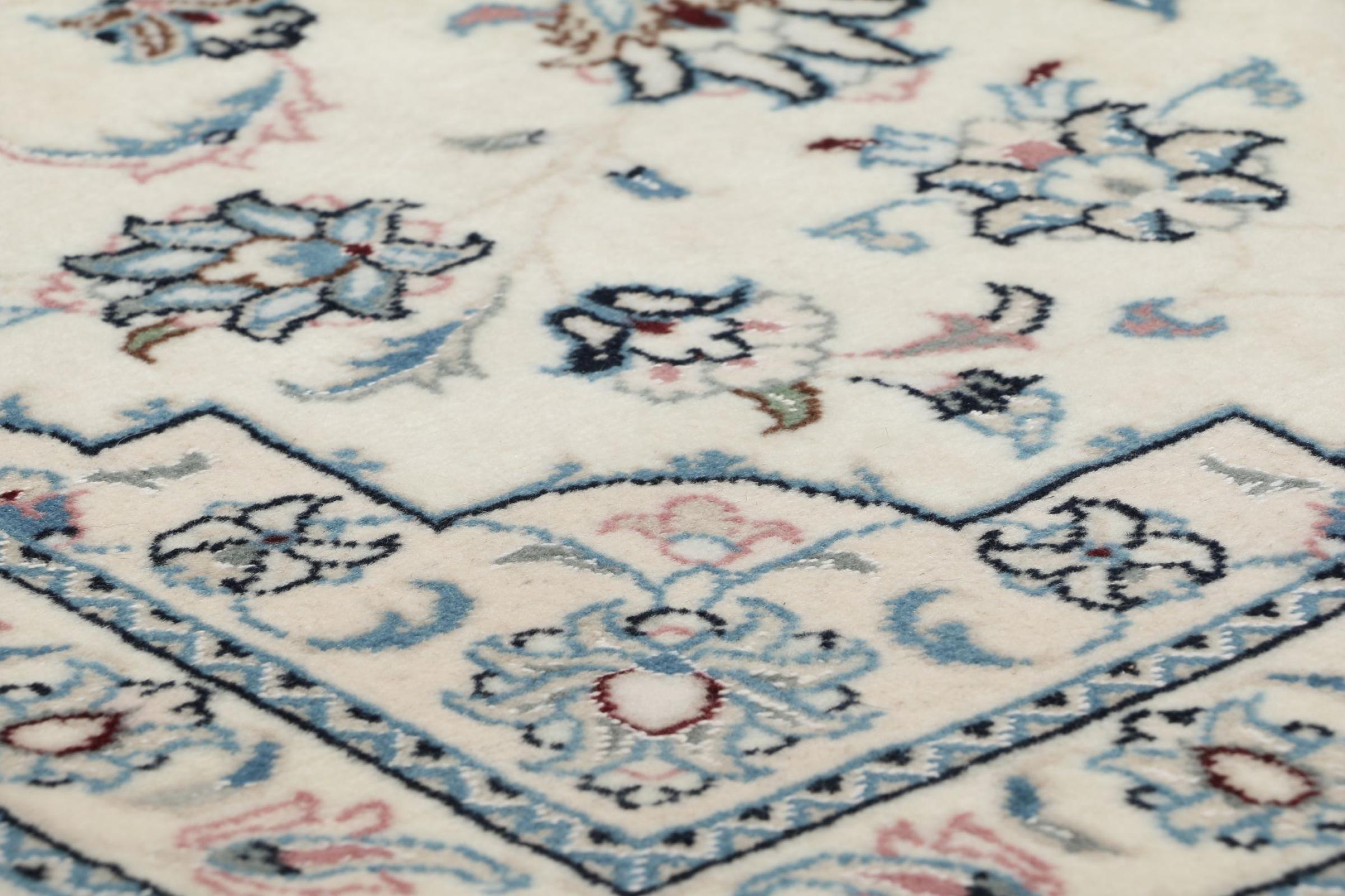 Ce tapis Nain est classifié 9La. La bonne qualité et le splendide design oriental avec ses motifs curvilignes inspirent chacun d’entre nous. Ce tapis persan était noué a la main avec de la laine précieuse et de la soie naturelle à Nain, une ville située à l’extrémité ouest du désert Dasht-e-Kavir.