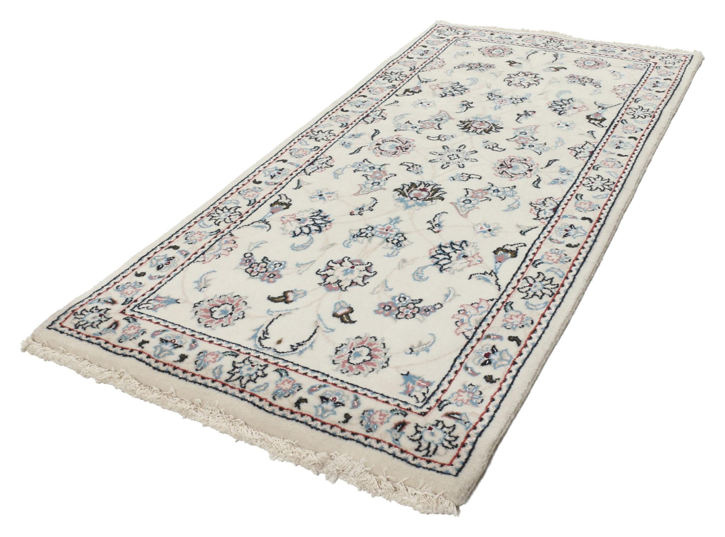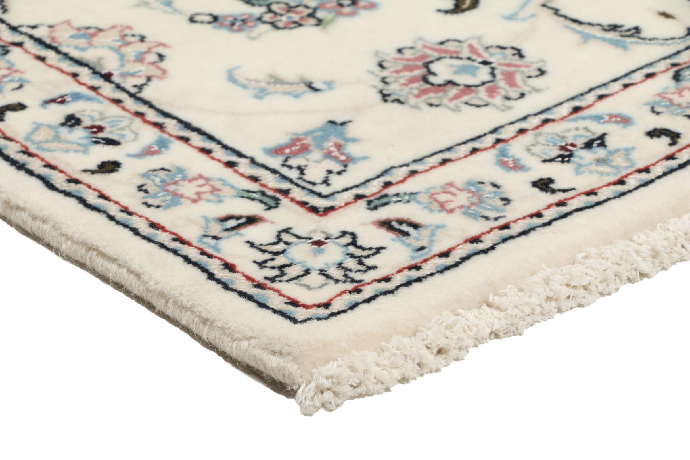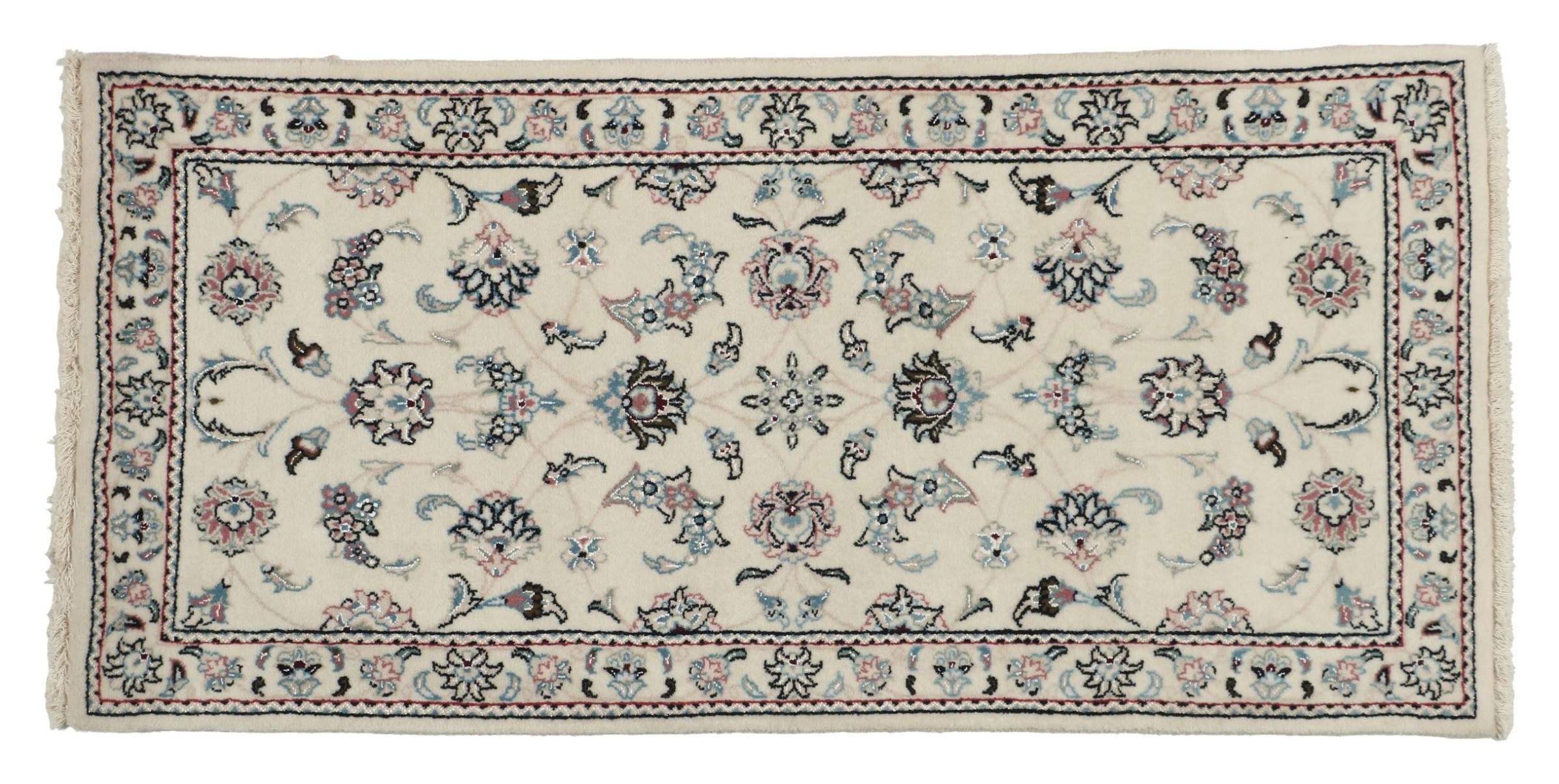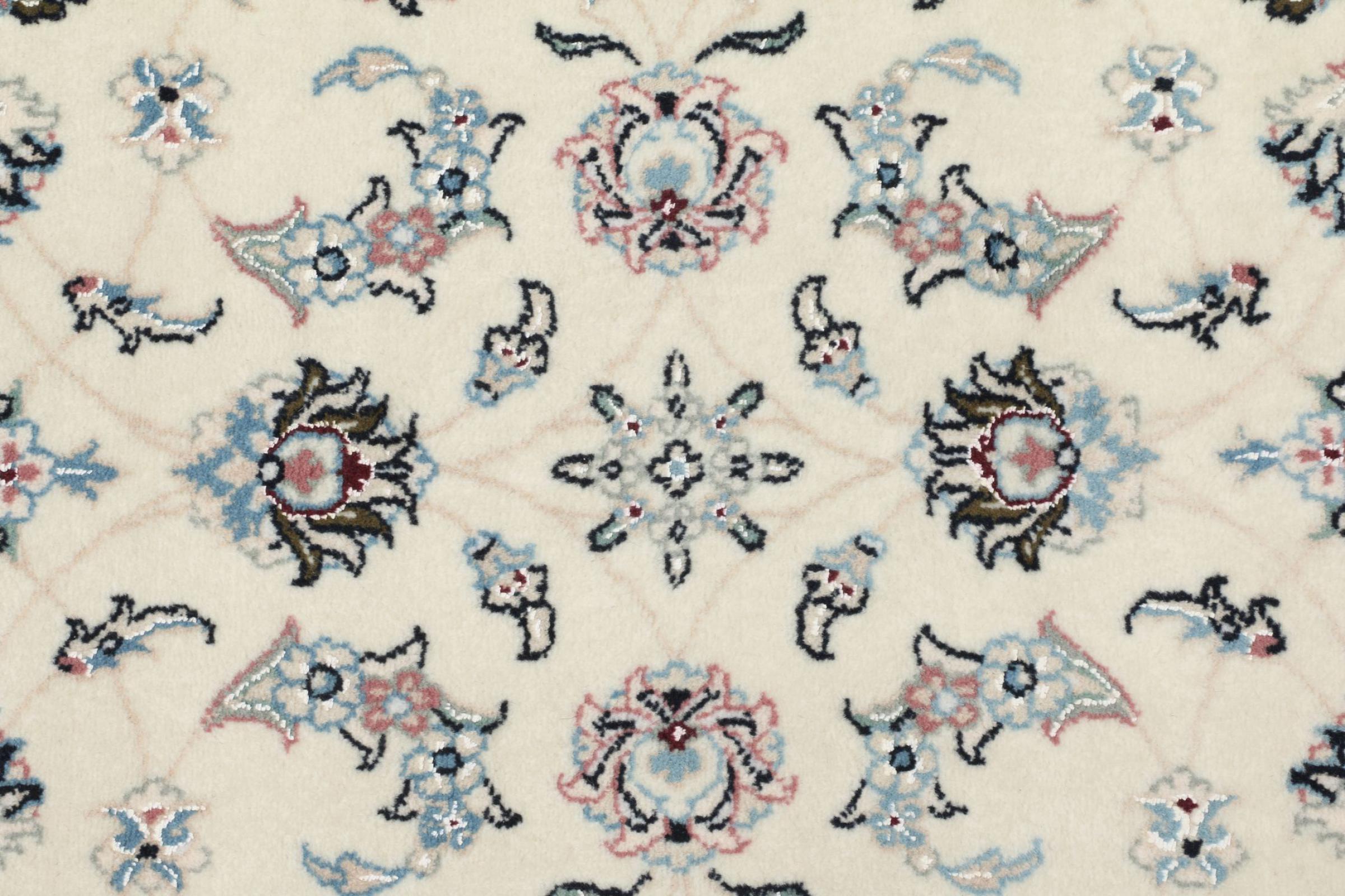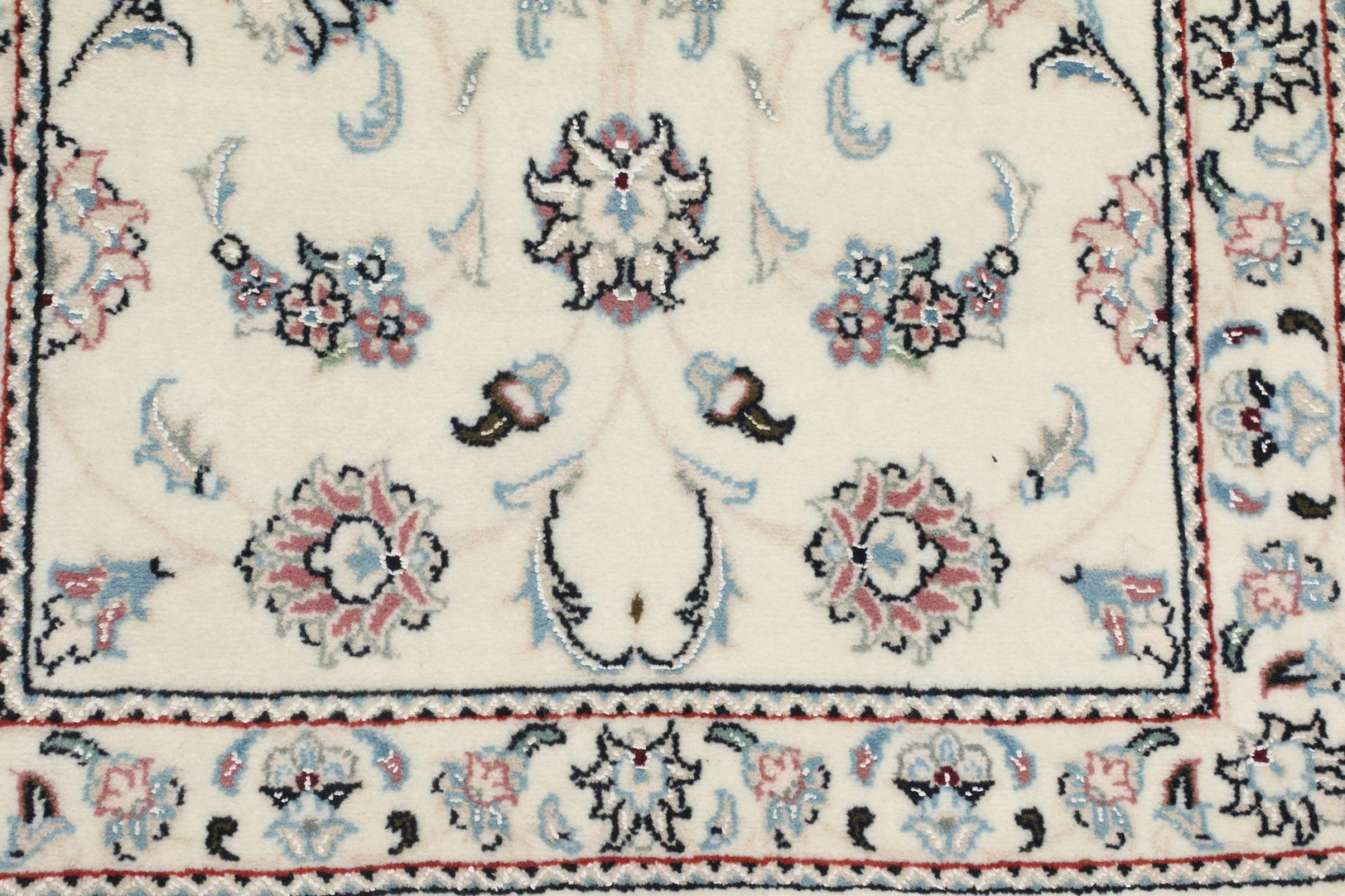 Ce tapis Nain est classifié 9La. La bonne qualité et le splendide design oriental avec ses motifs curvilignes inspirent chacun d’entre nous. Ce tapis persan était noué a la main avec de la laine précieuse et de la soie naturelle à Nain, une ville située à l’extrémité ouest du désert Dasht-e-Kavir.