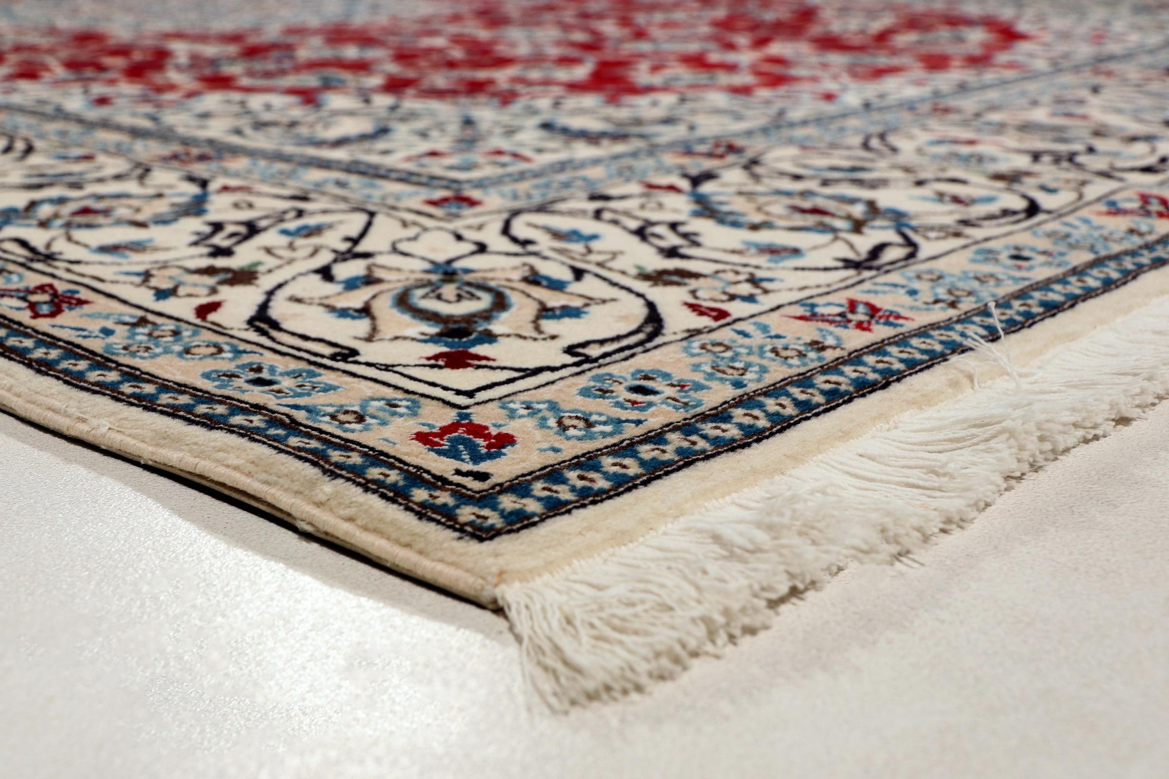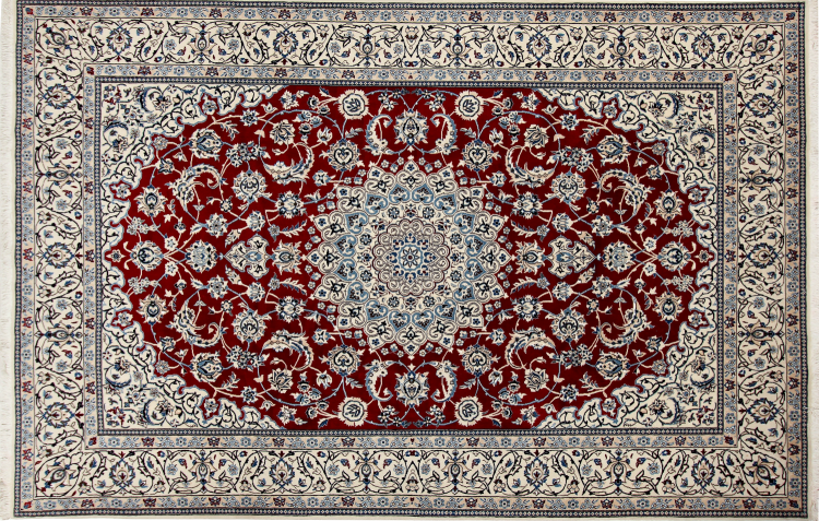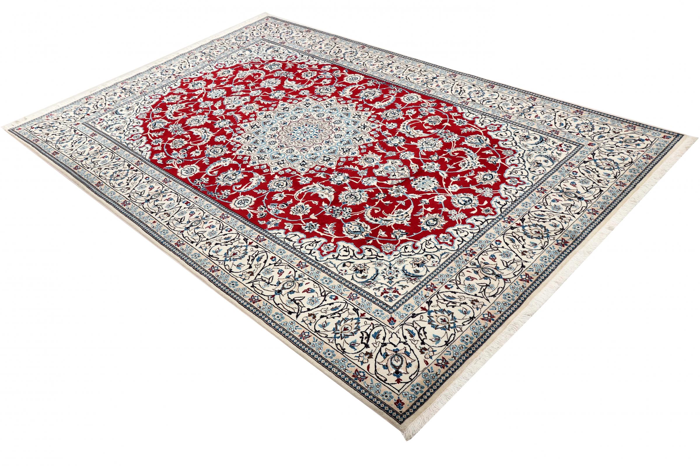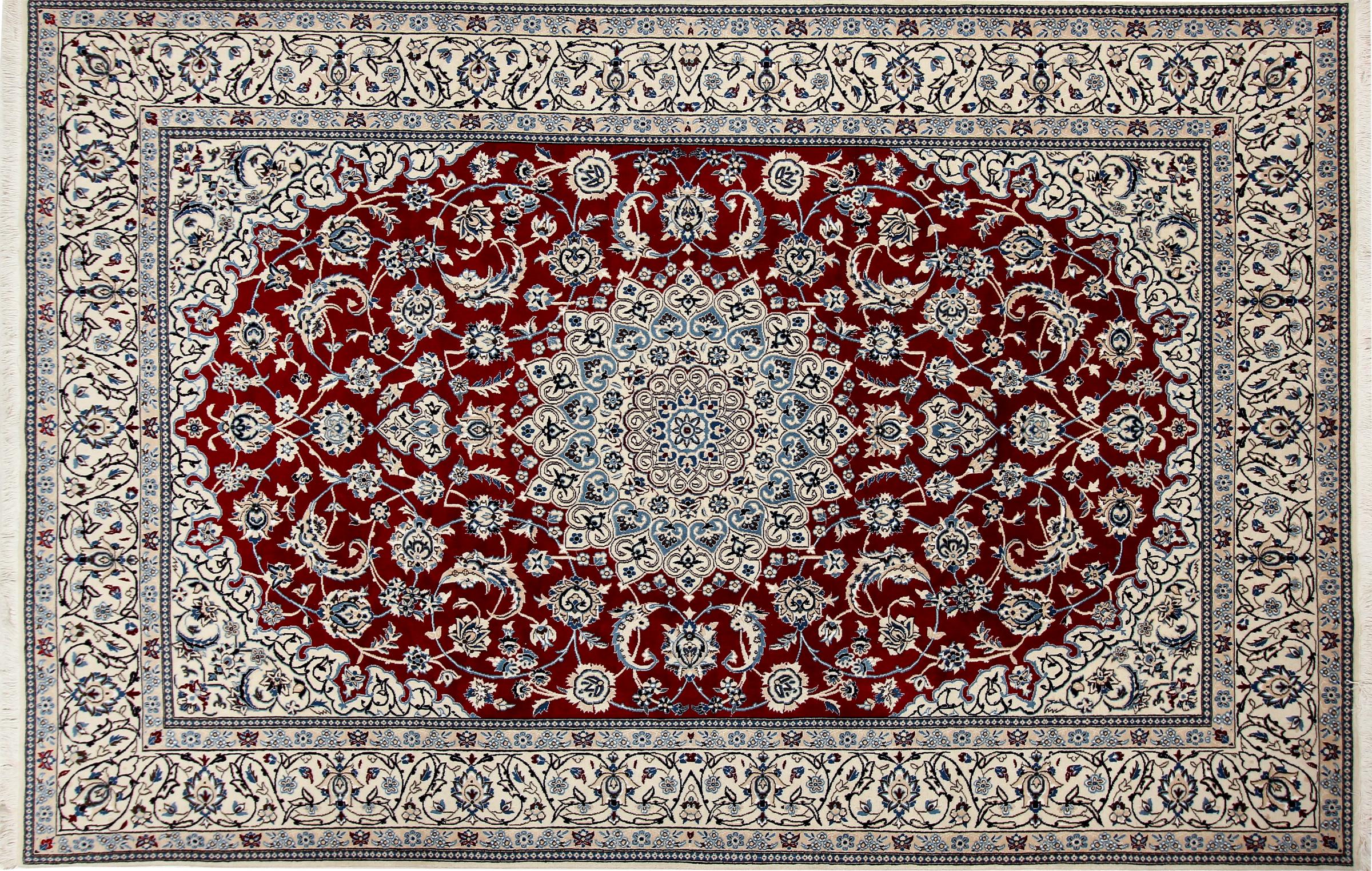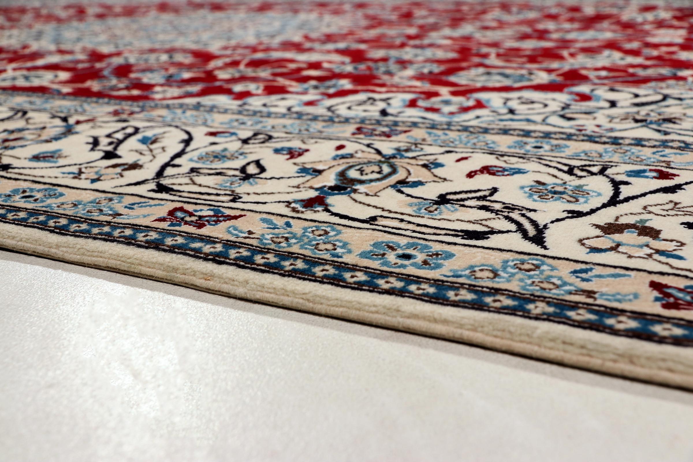 Ce tapis Nain est classifié 9La. La bonne qualité et le splendide design oriental avec ses motifs curvilignes inspirent chacun d’entre nous. Ce tapis persan était noué a la main avec de la laine précieuse et de la soie naturelle à Nain, une ville située à l’extrémité ouest du désert Dasht-e-Kavir.