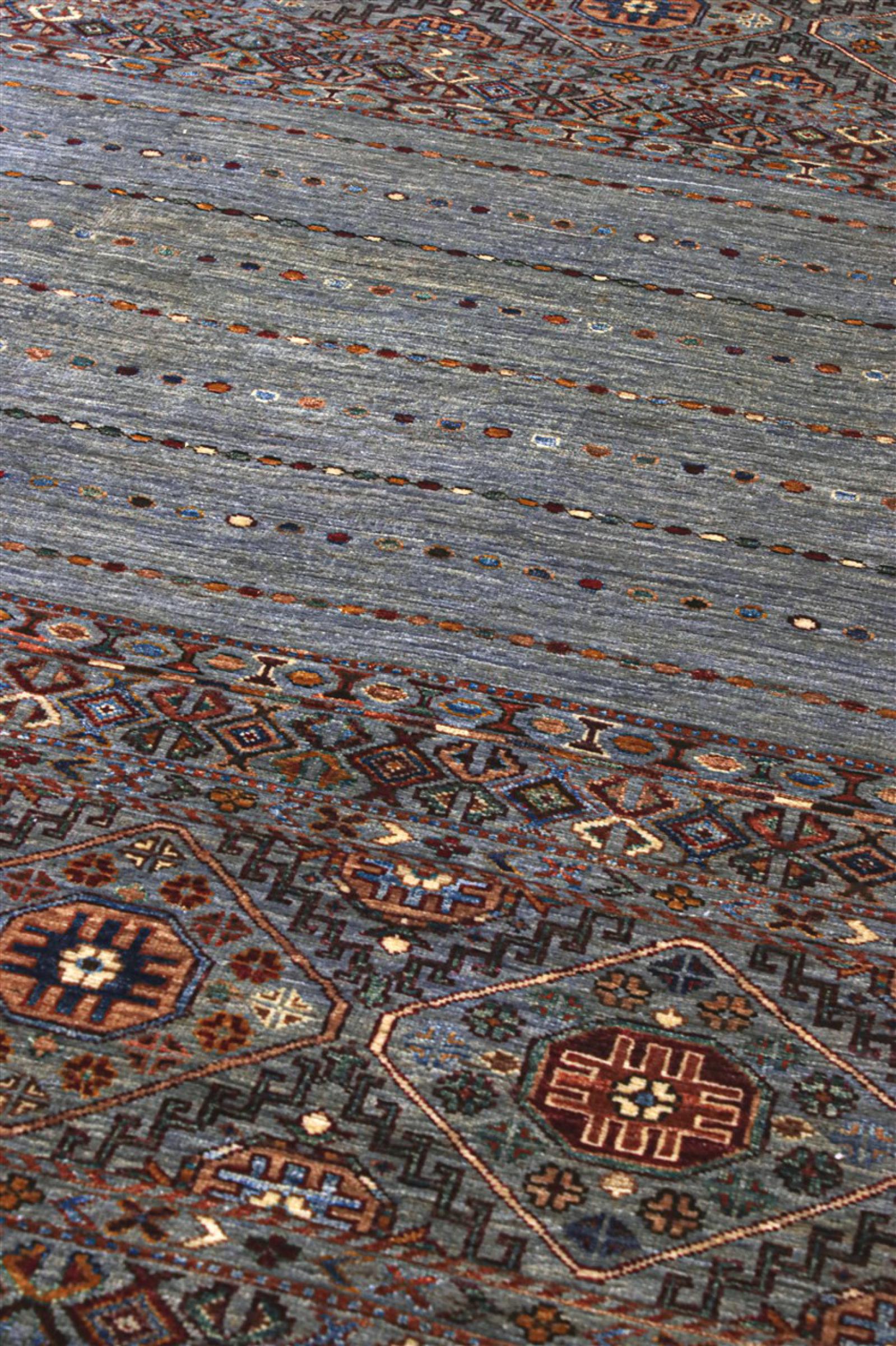 Ce tapis est fait de laine de mouton filée à la main de la plus haute qualité. En Iran (ancienne Perse), en Afghanistan et au Pakistan notamment, la laine est encore filée à la main avant que ne commence le nouage proprement dit du tapis. La laine a fait ses preuves en tant que matière naturelle et extrêmement résistante au fil des siècles. Il a notamment des propriétés antisalissures et d'isolation thermique. En même temps, la laine est incomparablement douce et a un éclat naturel.