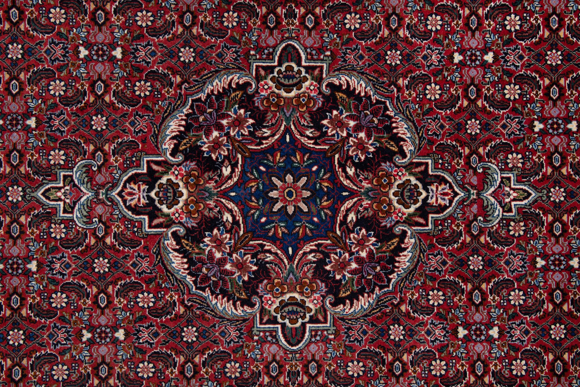 Ce tapis persan a été fabriqué dans une petite commune kurde à l’ouest de l’Iran. Les tapis Bidjar représentent la qualité. Son velours compact convainc de part sa densité importante et sa forte résistance. Vous pouvez en être certain : le tapis kurde est parfait. Et ce pour l’éternité.