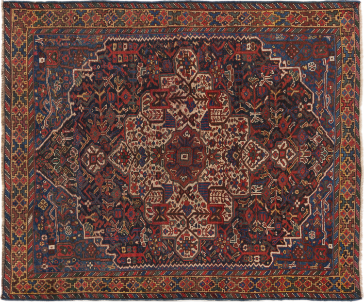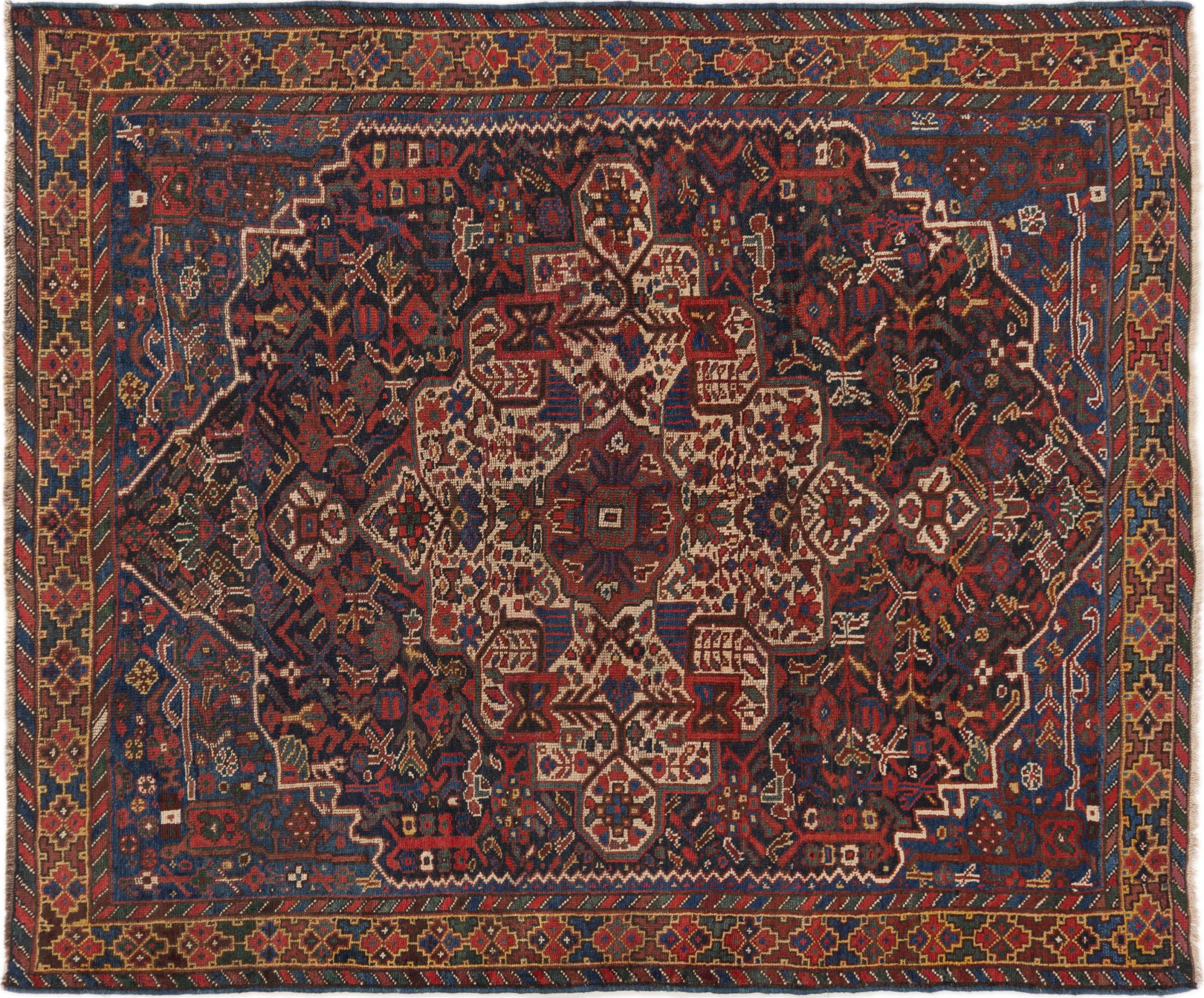 Réf. Article: 29902600909 Taille: 182x151 cm Épaisseur: ap. 12 mm Densité de nouage: 200 000 - 250 000 / m² Fabrication: Noué à la main Velours: Laine filée à la main Chaîne: Laine de mouton État du tapis / Conservation Perfect Origine: Persie / Iran Âge: Antique, over 80 ans Poids: ap. 10 kg Également connu sous Qashqai, Gaschgai, Gashghai, Kashgai Nombre en stock: Unique - Seulement 1 en stock