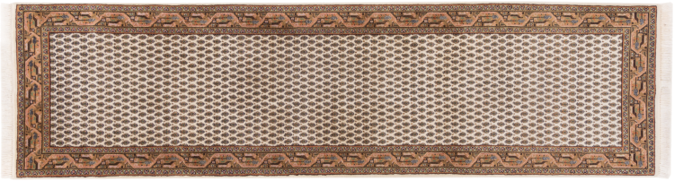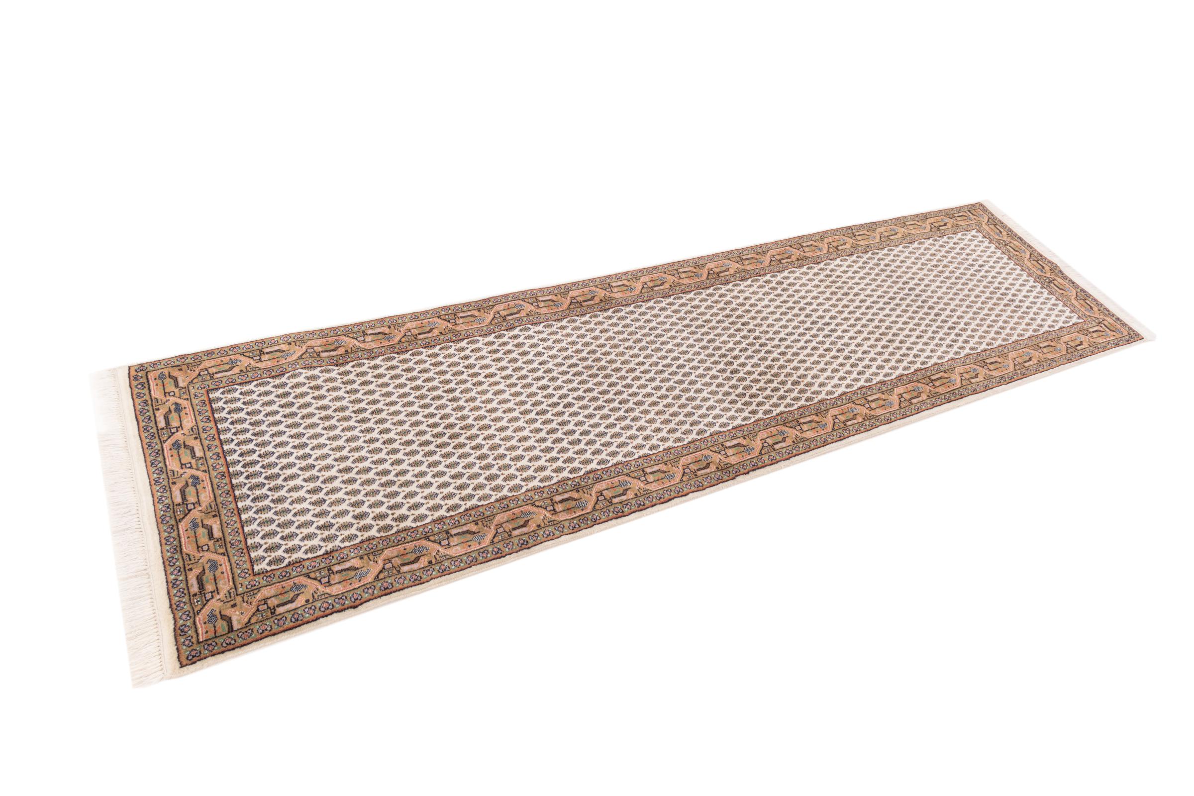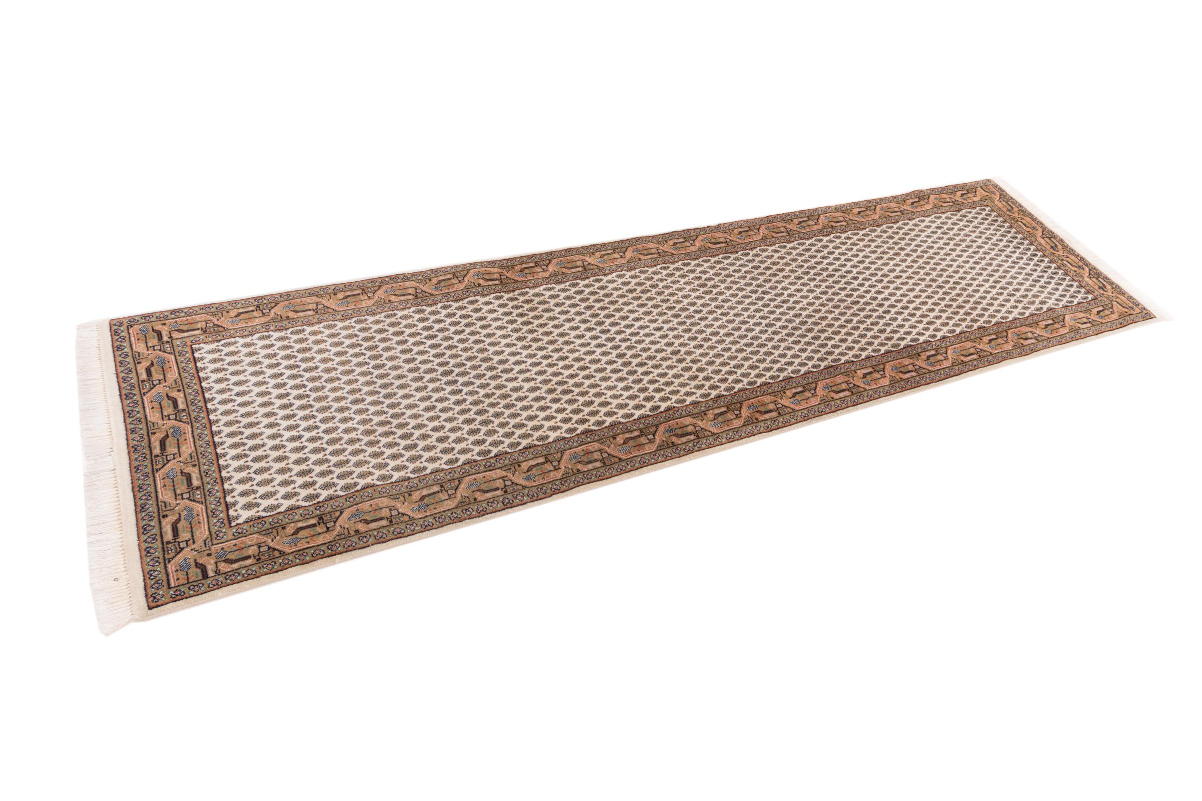 Réf. Article: 22441400104091 Taille: 296x81 cm Épaisseur: ap. 5 mm Densité de nouage: 128 000 - 160 000 / m² Fabrication: Noué à la main Velours: Laine de mouton Chaîne: Coton Origine: Inde Âge: 20-30 ans (Nouveau) Poids: ap. 7 kg Nombre en stock: Unique - Seulement 1 en stock