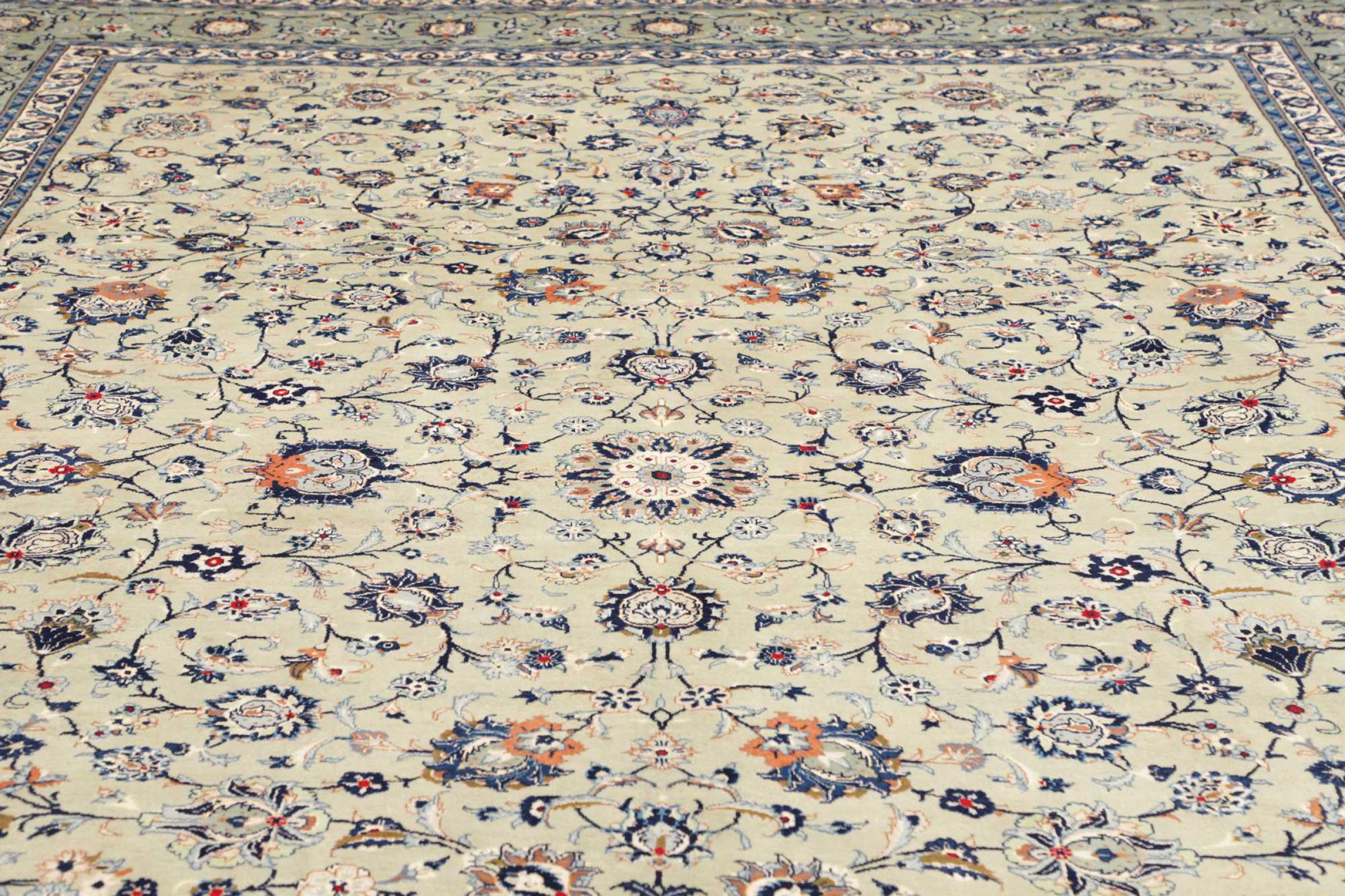 Réf. Article: 319075003102467 Taille: 409x306 cm Épaisseur: ap. 12 mm Densité de nouage: 128 000 - 160 000 / m² Fabrication: Noué à la main Velours: Laine filée à la main Chaîne: Coton Origine: Persie / Iran Âge: Nouveau Poids: ap. 44 kg Nombre en stock: Unique - Seulement 1 en stock