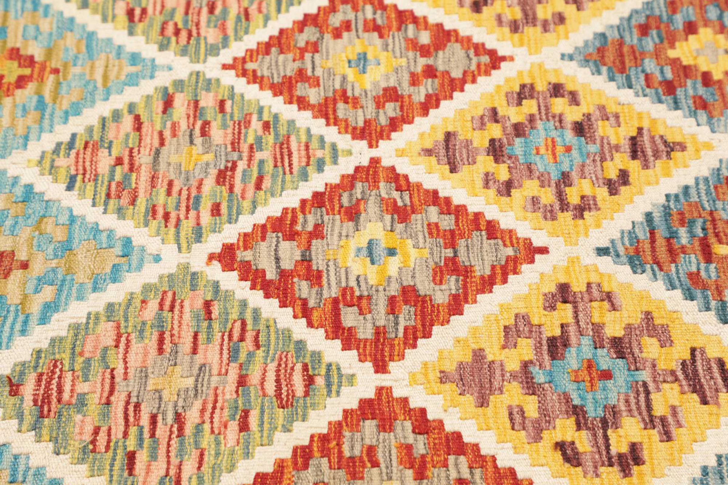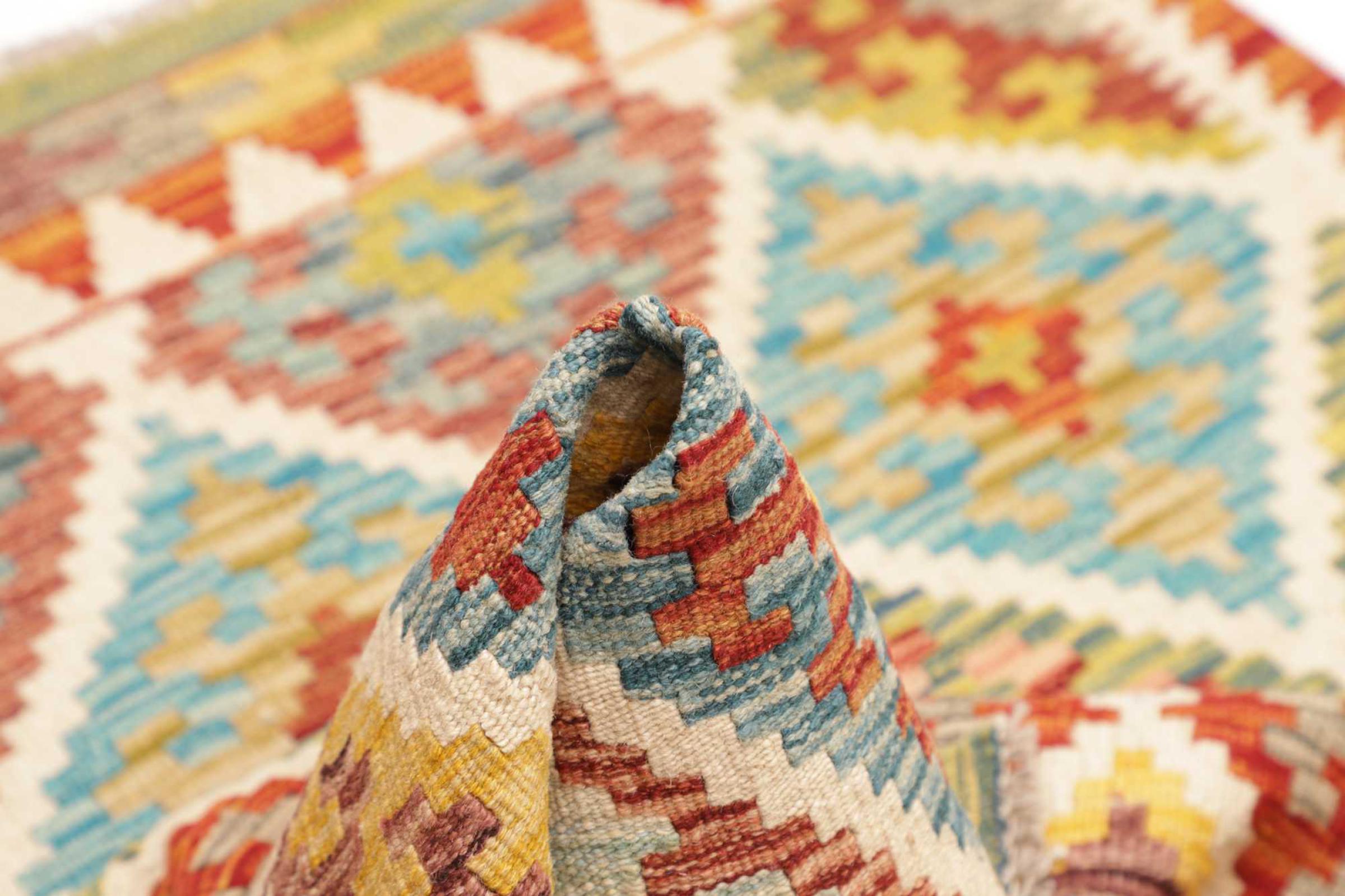 Ces tapis kilim présentent une différence décisive par rapport aux tapis noués à la main - ils sont tissés à la main. Ainsi, ils n'ont pas un haut velours de laine et sont souvent plus plats et plus rugueux que les tapis de laine à nœuds. Leur fabrication est moins élaborée et ils sont donc généralement beaucoup moins chers. Les tapis kilim sont également beaucoup plus légers et peuvent être posés par devant et par derrière. Les kilims tissés à la main proviennent de l'ancienne Perse et sont maintenant souvent fabriqués en Afghanistan. Ils ont des motifs assez simples et directs, qui sont dus à leur technique de tissage.
