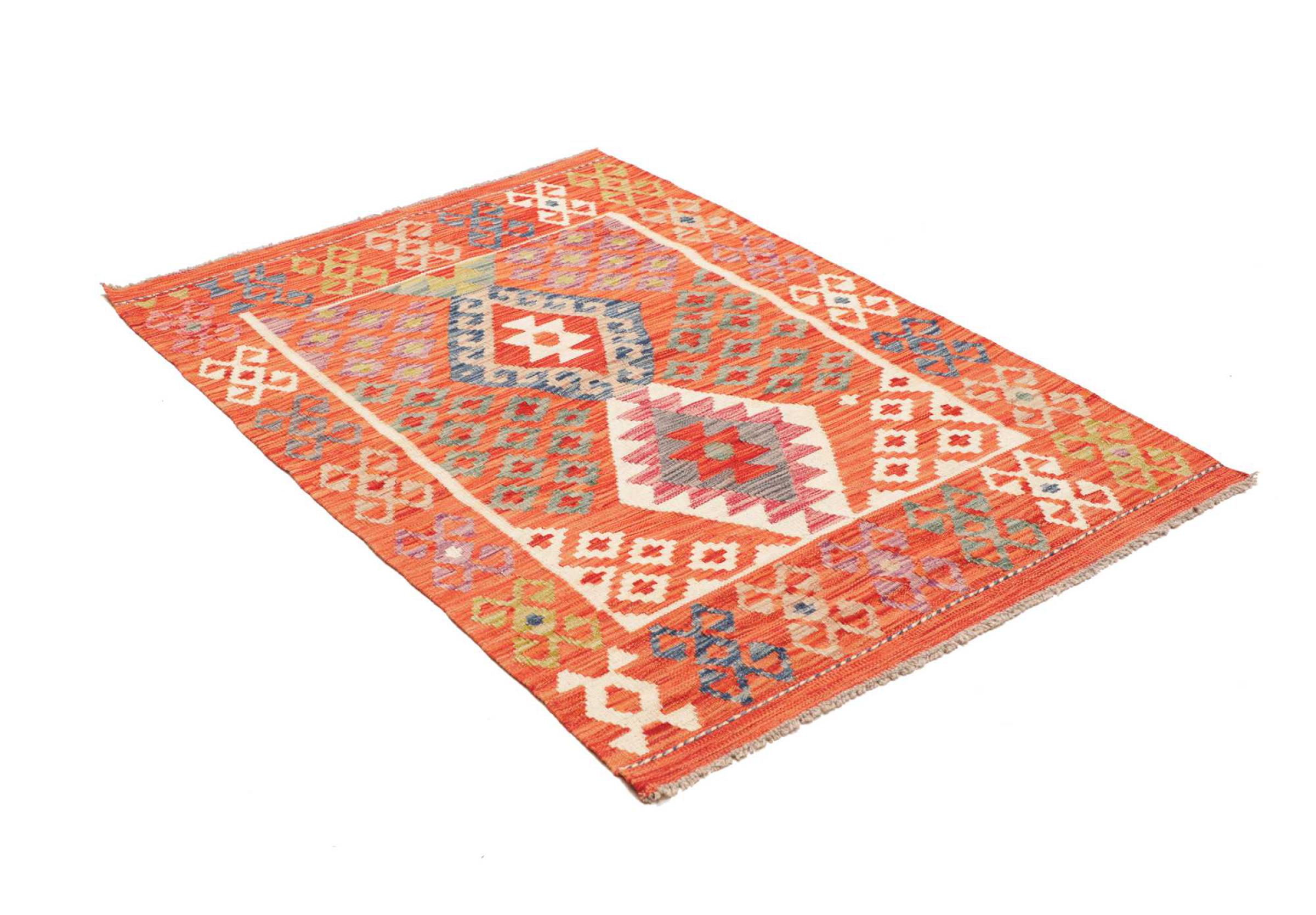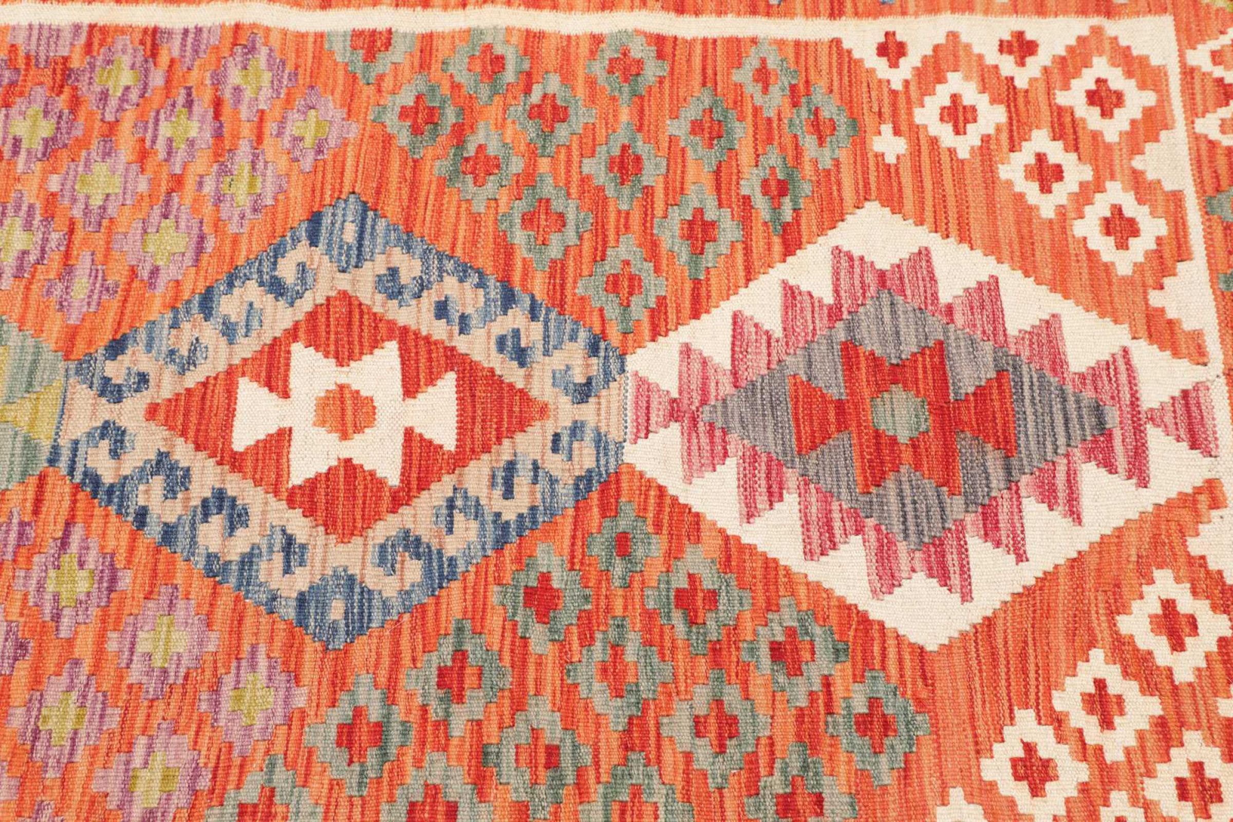 Ces tapis kilim présentent une différence décisive par rapport aux tapis noués à la main - ils sont tissés à la main. Ainsi, ils n'ont pas un haut velours de laine et sont souvent plus plats et plus rugueux que les tapis de laine à nœuds. Leur fabrication est moins élaborée et ils sont donc généralement beaucoup moins chers. Les tapis kilim sont également beaucoup plus légers et peuvent être posés par devant et par derrière. Les kilims tissés à la main proviennent de l'ancienne Perse et sont maintenant souvent fabriqués en Afghanistan. Ils ont des motifs assez simples et directs, qui sont dus à leur technique de tissage.
