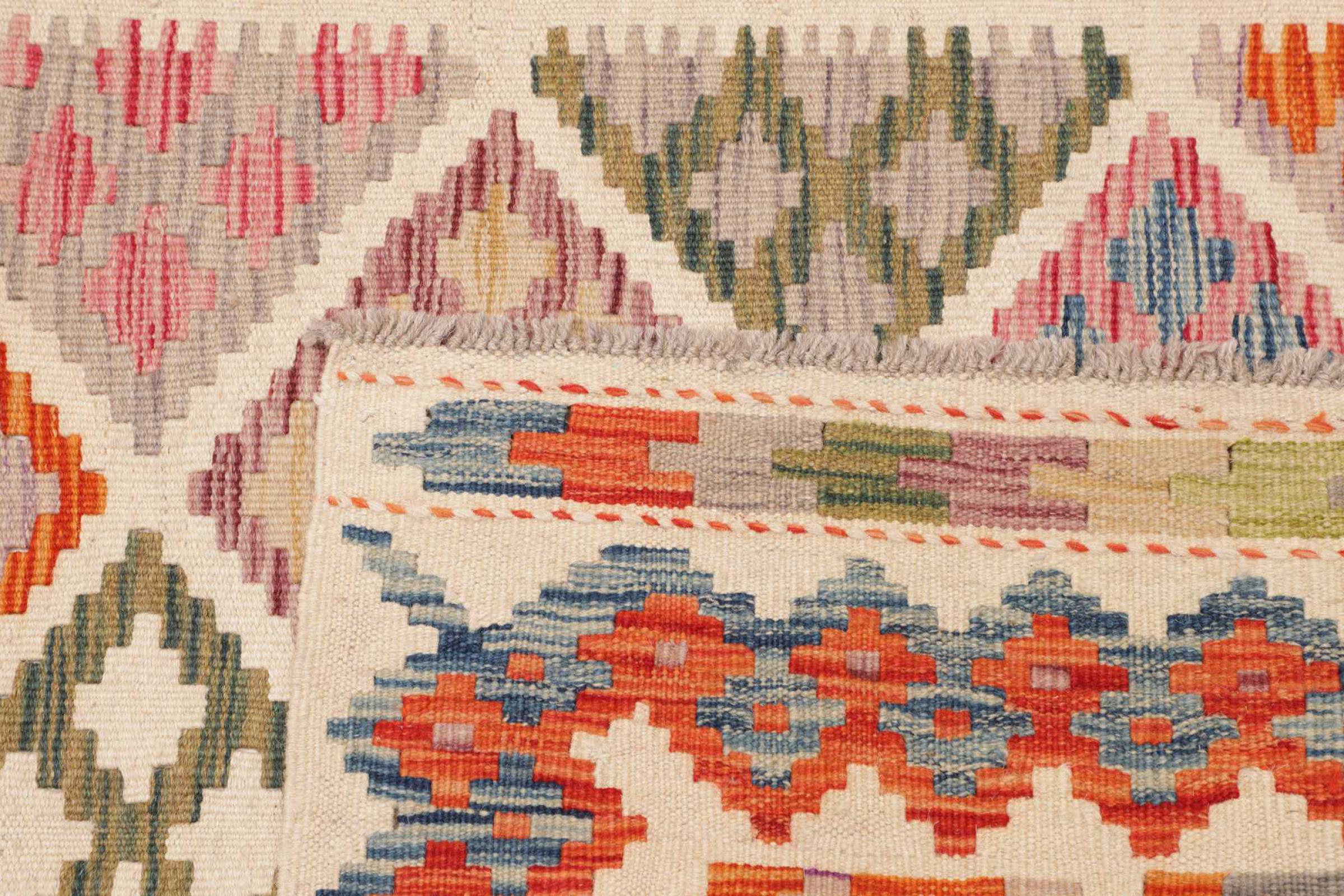 Ces tapis kilim présentent une différence décisive par rapport aux tapis noués à la main - ils sont tissés à la main. Ainsi, ils n'ont pas un haut velours de laine et sont souvent plus plats et plus rugueux que les tapis de laine à nœuds. Leur fabrication est moins élaborée et ils sont donc généralement beaucoup moins chers. Les tapis kilim sont également beaucoup plus légers et peuvent être posés par devant et par derrière. Les kilims tissés à la main proviennent de l'ancienne Perse et sont maintenant souvent fabriqués en Afghanistan. Ils ont des motifs assez simples et directs, qui sont dus à leur technique de tissage.