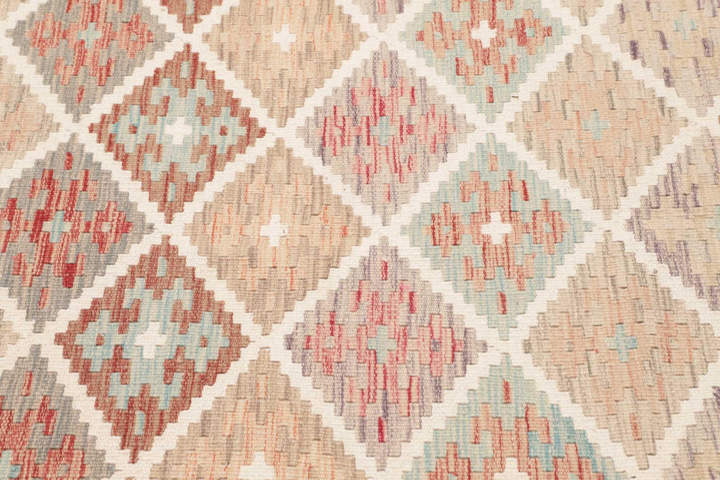 Ce tapis Afghan Kilim tissé main est une merveille, grâce à ses couleurs et à ses motifs caractéristiques. Il a été fabriqué en Afghanistan avec de la laine, et a bien sûr été fait à la main. Il est robuste et durable. Il est un véritable bénéfice pour votre maison.