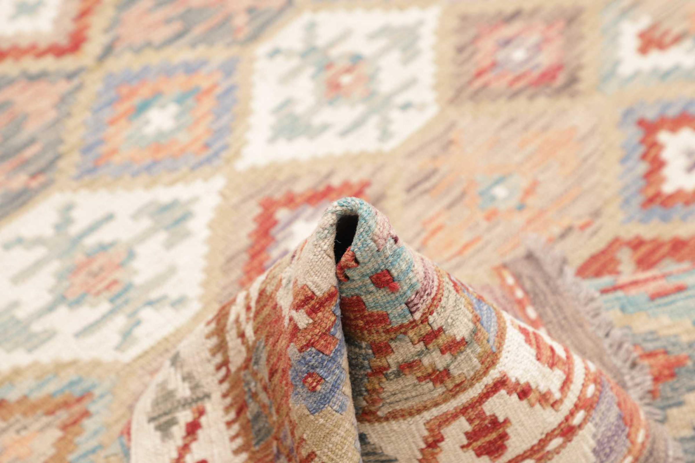 Ce tapis Afghan Kilim tissé main est une merveille, grâce à ses couleurs et à ses motifs caractéristiques. Il a été fabriqué en Afghanistan avec de la laine, et a bien sûr été fait à la main. Il est robuste et durable. Il est un véritable bénéfice pour votre maison.