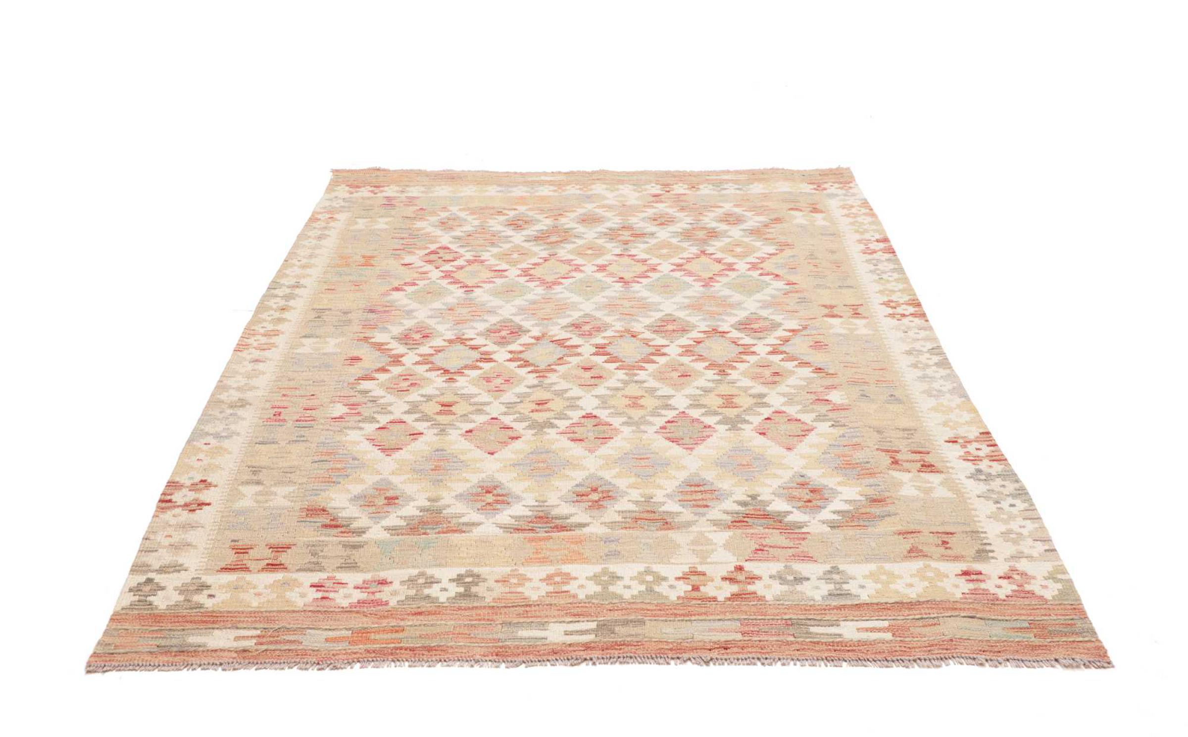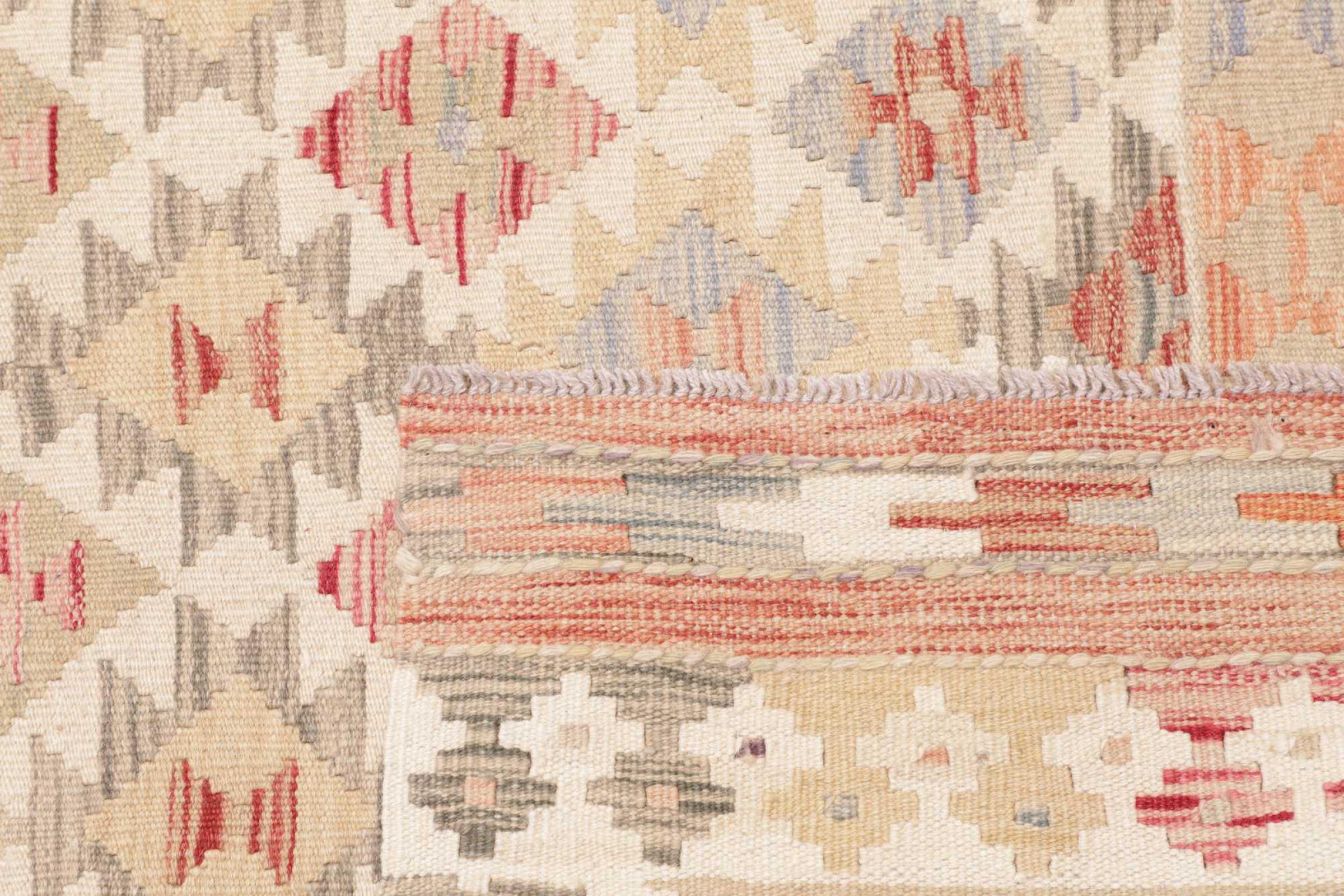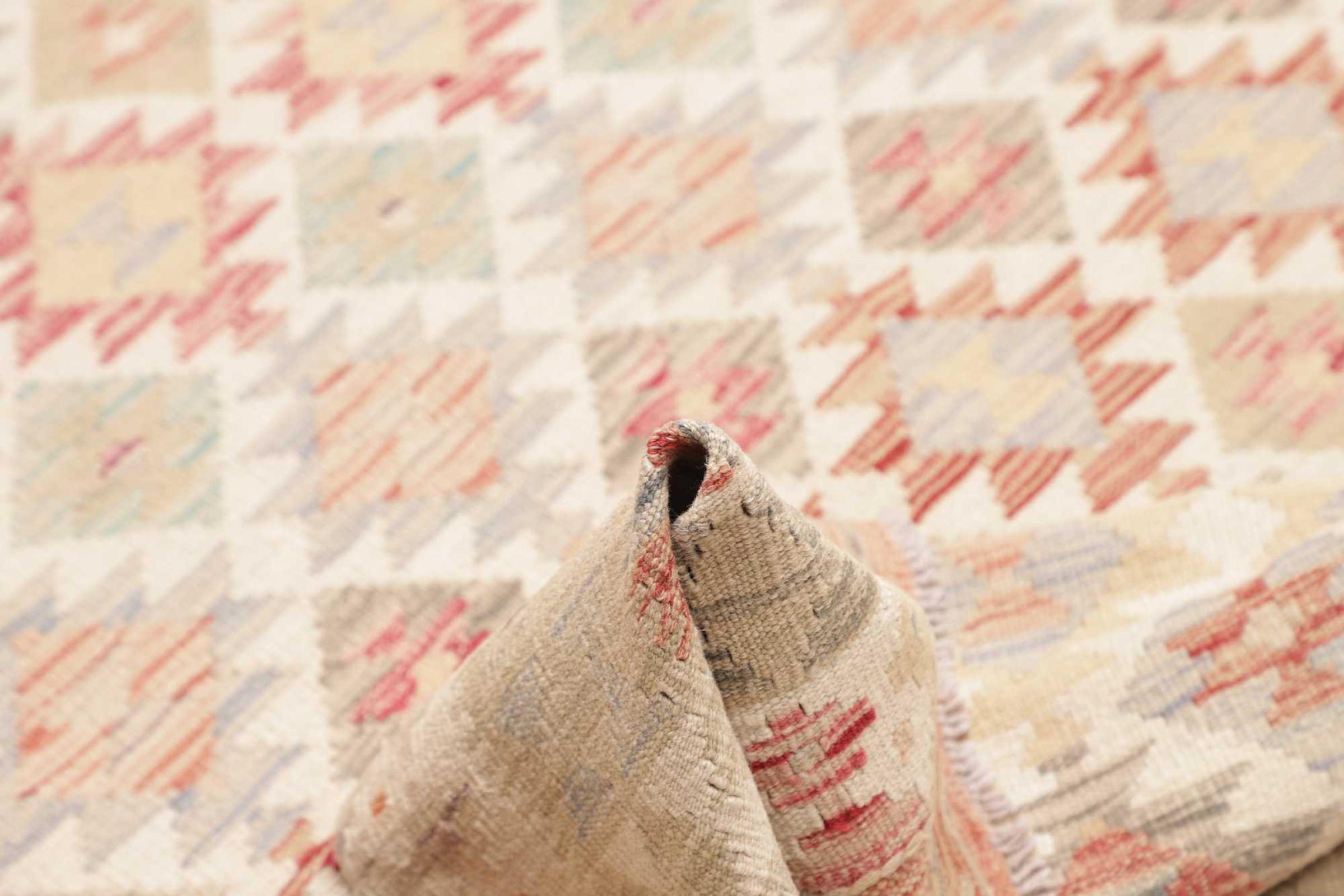 Ce tapis Afghan Kilim tissé main est une merveille, grâce à ses couleurs et à ses motifs caractéristiques. Il a été fabriqué en Afghanistan avec de la laine, et a bien sûr été fait à la main. Il est robuste et durable. Il est un véritable bénéfice pour votre maison.