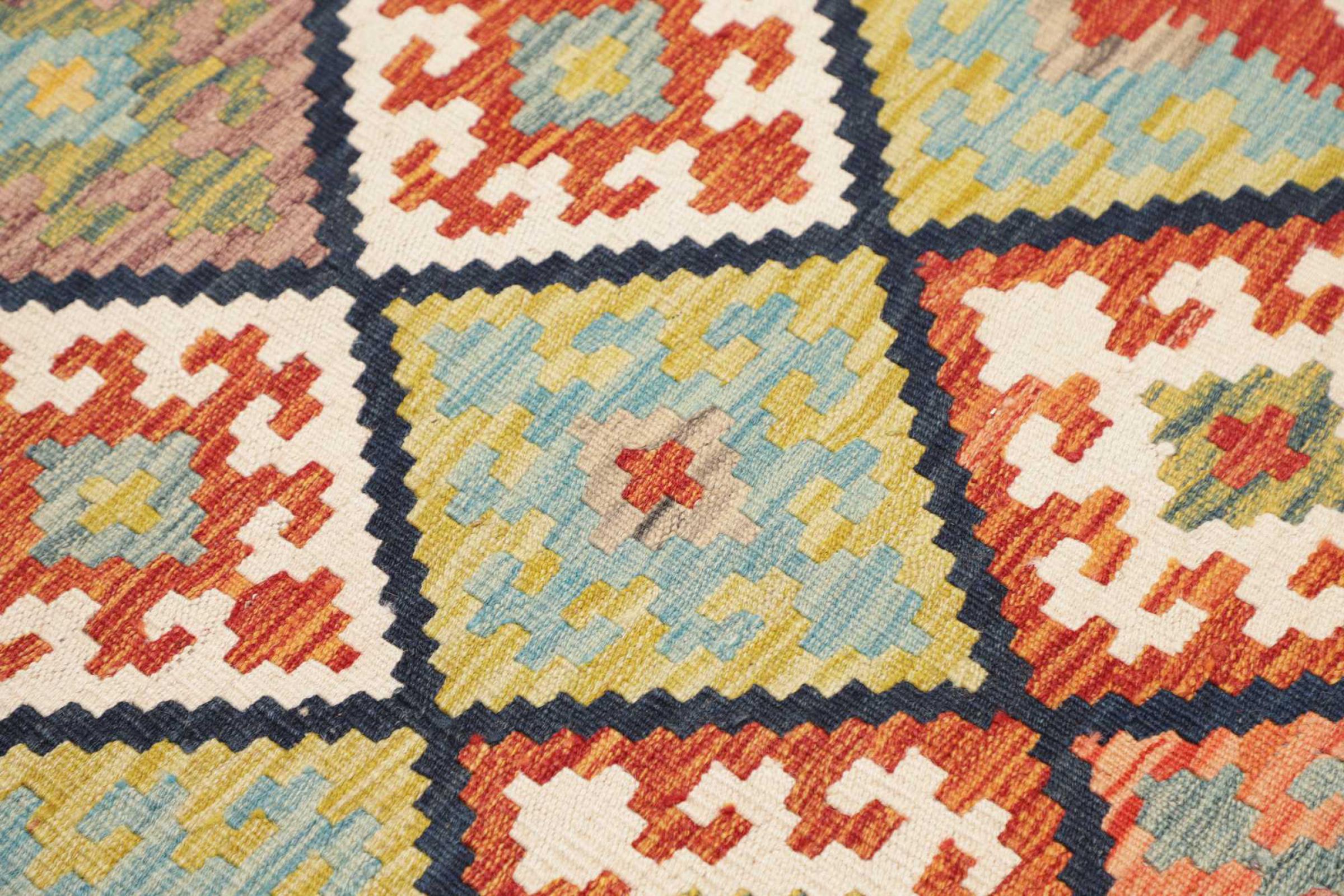 Ce tapis Afghan Kilim tissé main est une merveille, grâce à ses couleurs et à ses motifs caractéristiques. Il a été fabriqué en Afghanistan avec de la laine, et a bien sûr été fait à la main. Il est robuste et durable. Il est un véritable bénéfice pour votre maison.