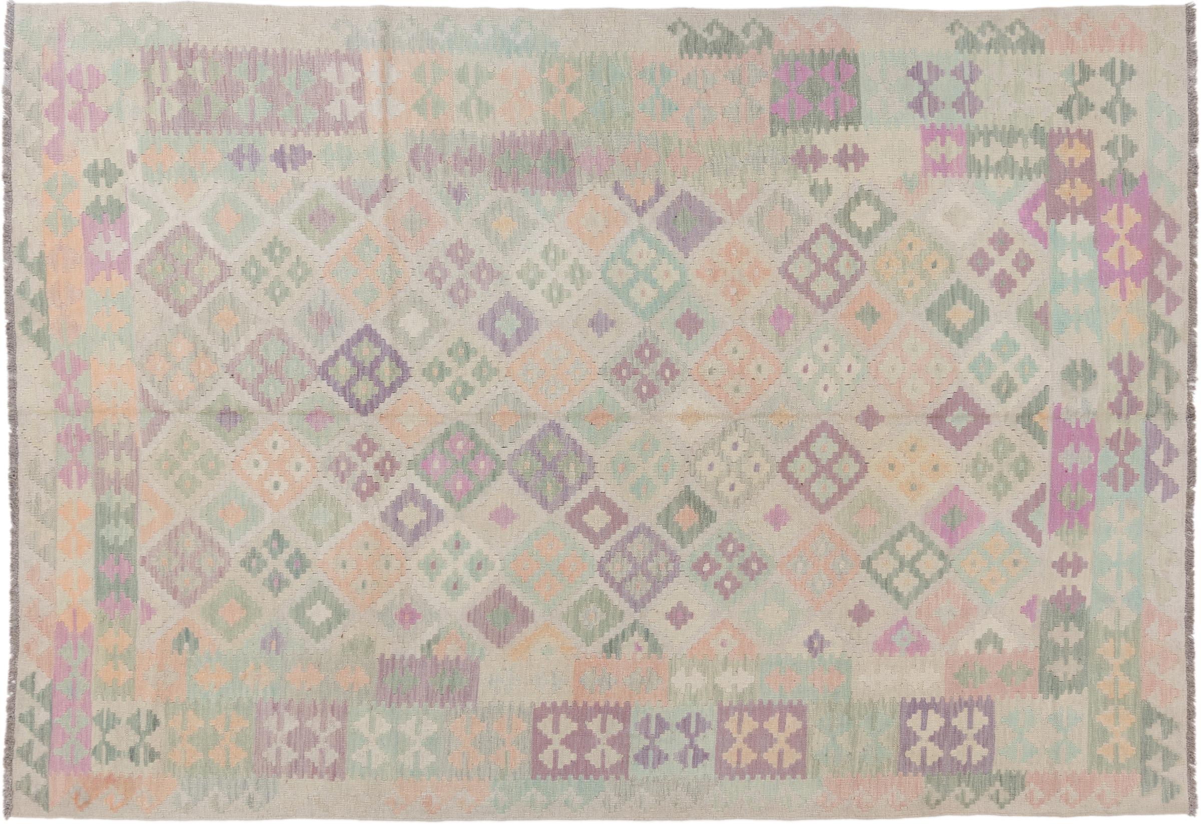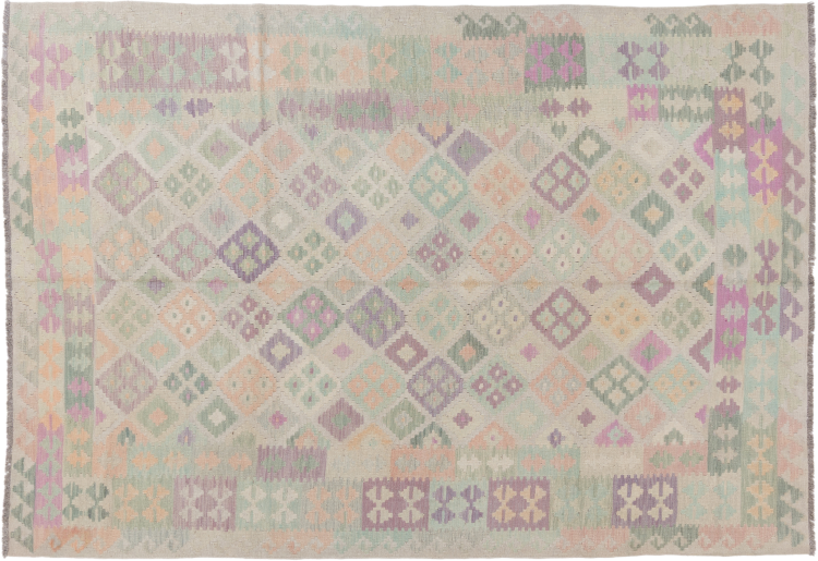 Ce tapis kilim est très spécial car non seulement il est tissé à la main, mais sa laine est également filée à la main. La collection Kilim Heritage offre un design très moderne dans des couleurs pastel et en combinaison avec l'artisanat le plus traditionnel de l'Orient. Grande valeur et totalement abordable. Vous ne trouverez plus une pièce unique comme celle-ci.