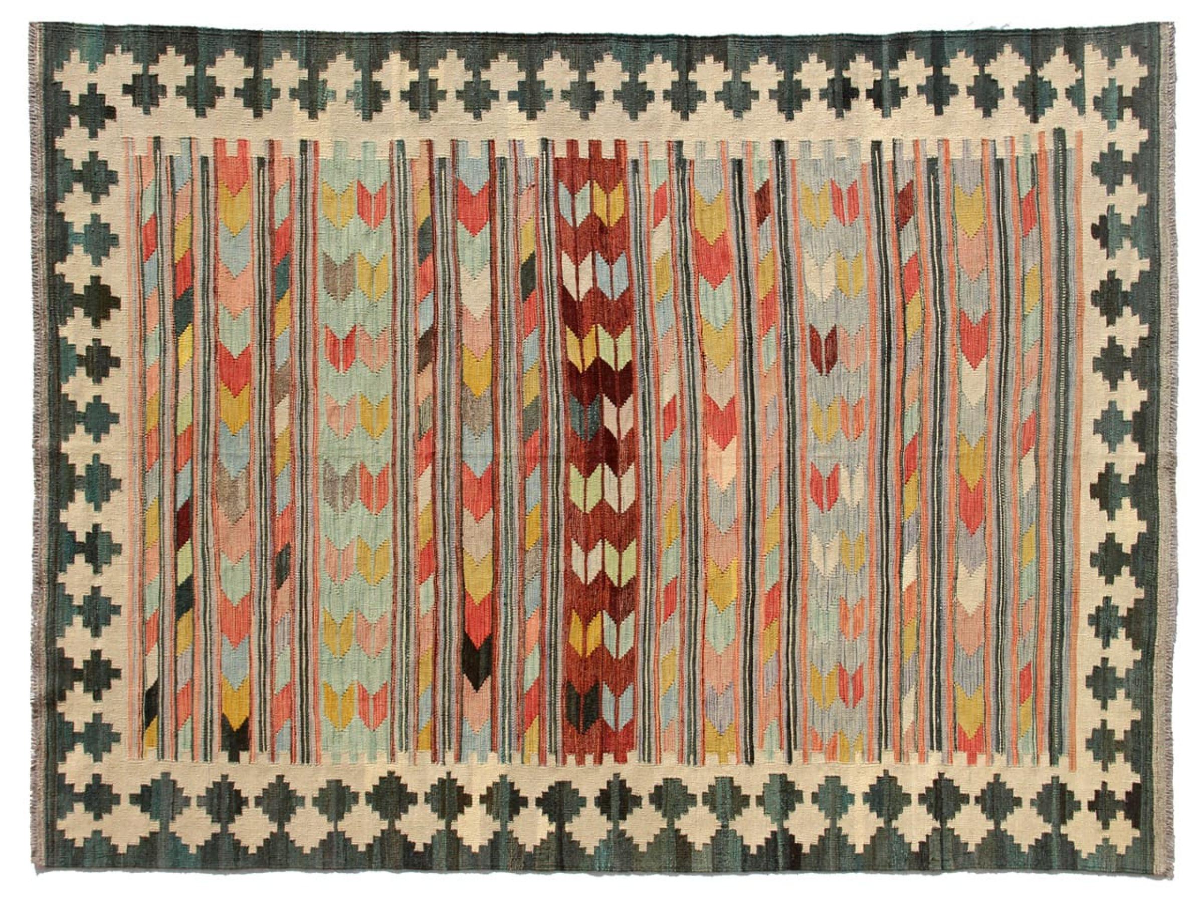Ce tapis Afghan Kilim tissé main est une merveille, grâce à ses couleurs et à ses motifs caractéristiques. Il a été fabriqué en Afghanistan avec de la laine, et a bien sûr été fait à la main. Il est robuste et durable. Il est un véritable bénéfice pour votre maison.