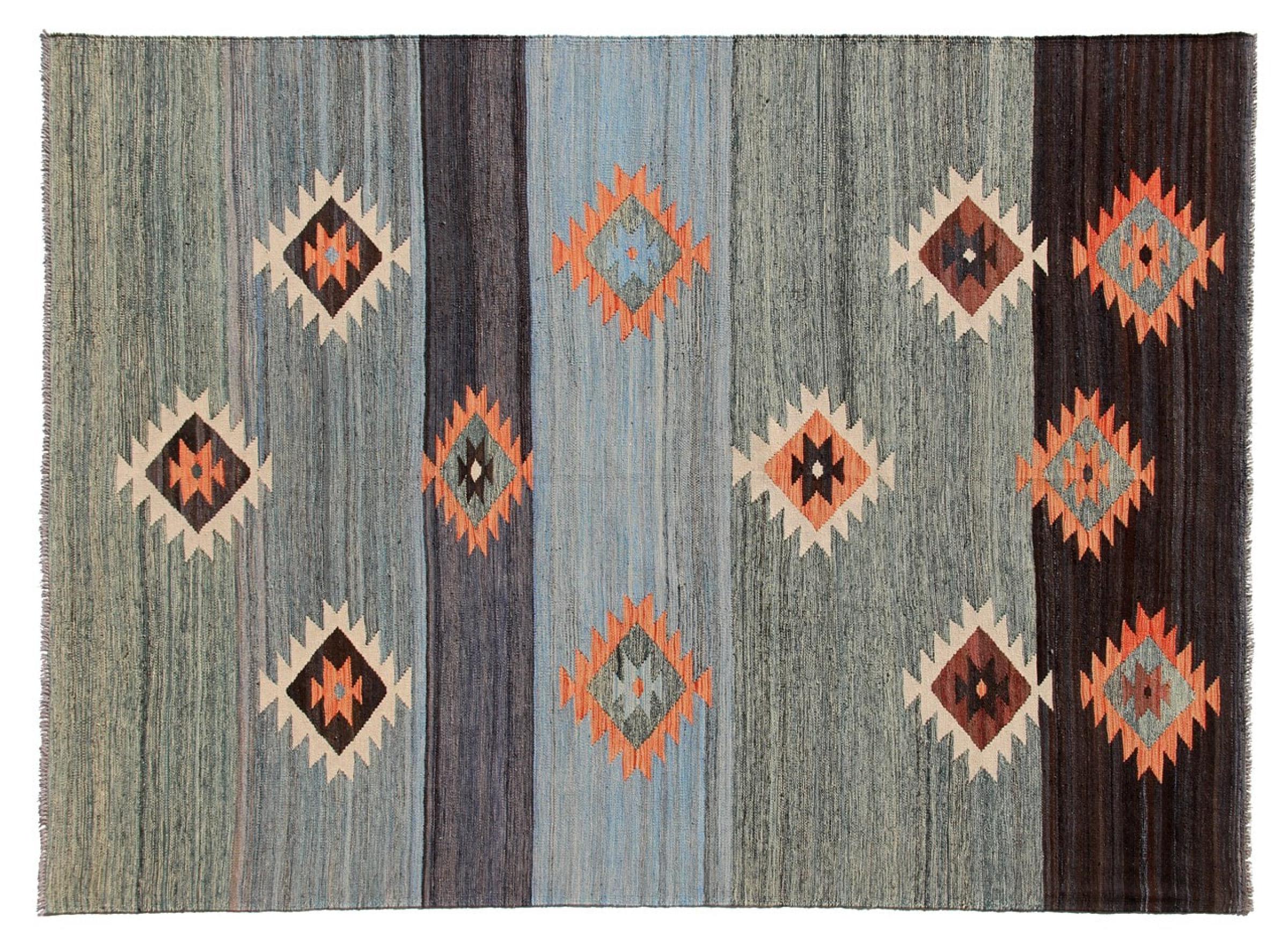 Ces tapis kilim présentent une différence décisive par rapport aux tapis noués à la main - ils sont tissés à la main. Ainsi, ils n'ont pas un haut velours de laine et sont souvent plus plats et plus rugueux que les tapis de laine à nœuds. Leur fabrication est moins élaborée et ils sont donc généralement beaucoup moins chers. Les tapis kilim sont également beaucoup plus légers et peuvent être posés par devant et par derrière. Les kilims tissés à la main proviennent de l'ancienne Perse et sont maintenant souvent fabriqués en Afghanistan. Ils ont des motifs assez simples et directs, qui sont dus à leur technique de tissage.