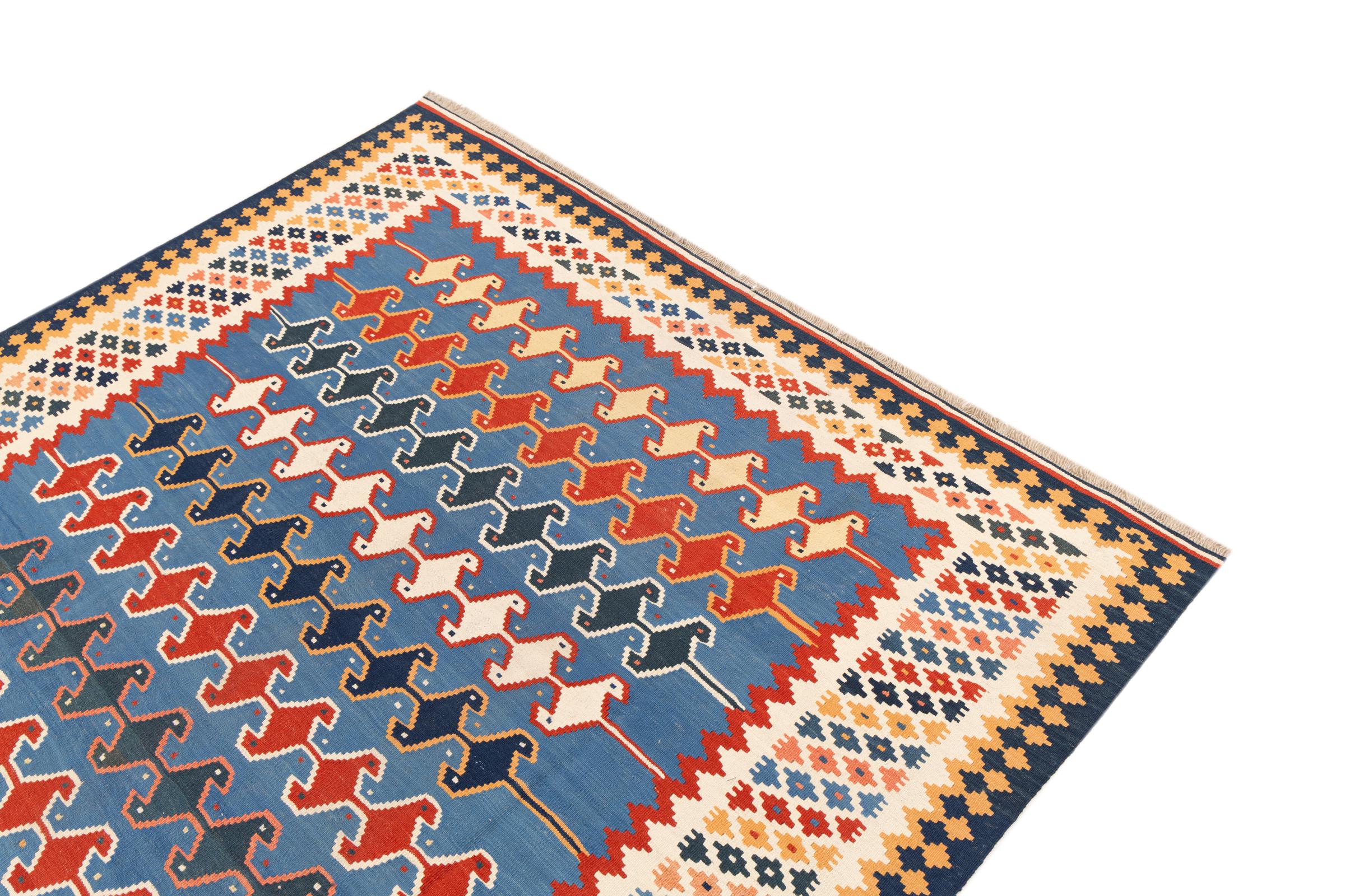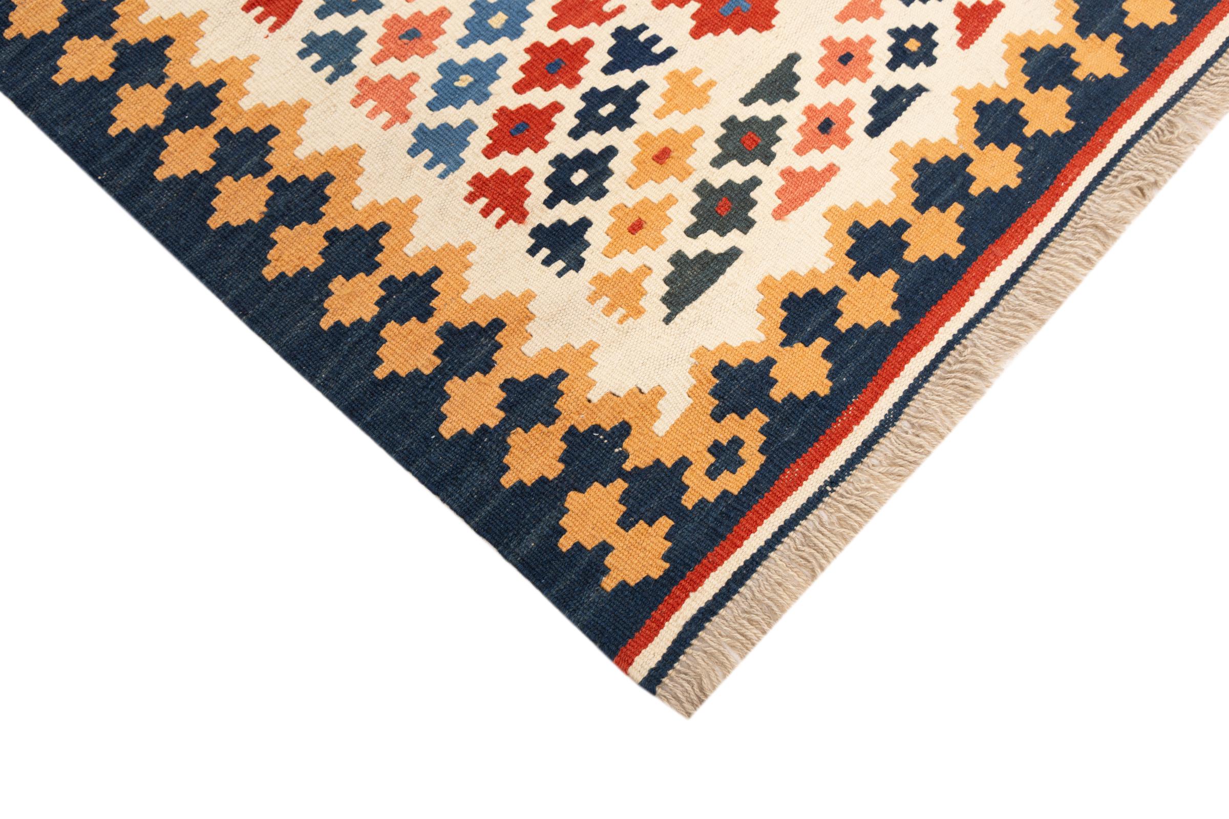 Ce tapis a été fabriqué à la main sur un métier à tisser comme un tissage plat. Le terme 'Flatweave' est utilisé pour décrire les tapis qui n'ont pas de poils. Comme leur nom l'indique, ces tapis sont tissés et non pas noués. Il en résulte un tapis plat avec une surface structurée. Les tissages plats ne sont pas aussi doux et généralement plus fins que les tapis à nœuds. En même temps, ils sont beaucoup moins complexes à fabriquer et peuvent généralement être disposés des deux côtés (avant et arrière). Leurs motifs sont généralement géométriques, ce qui est déterminé par le tissu.