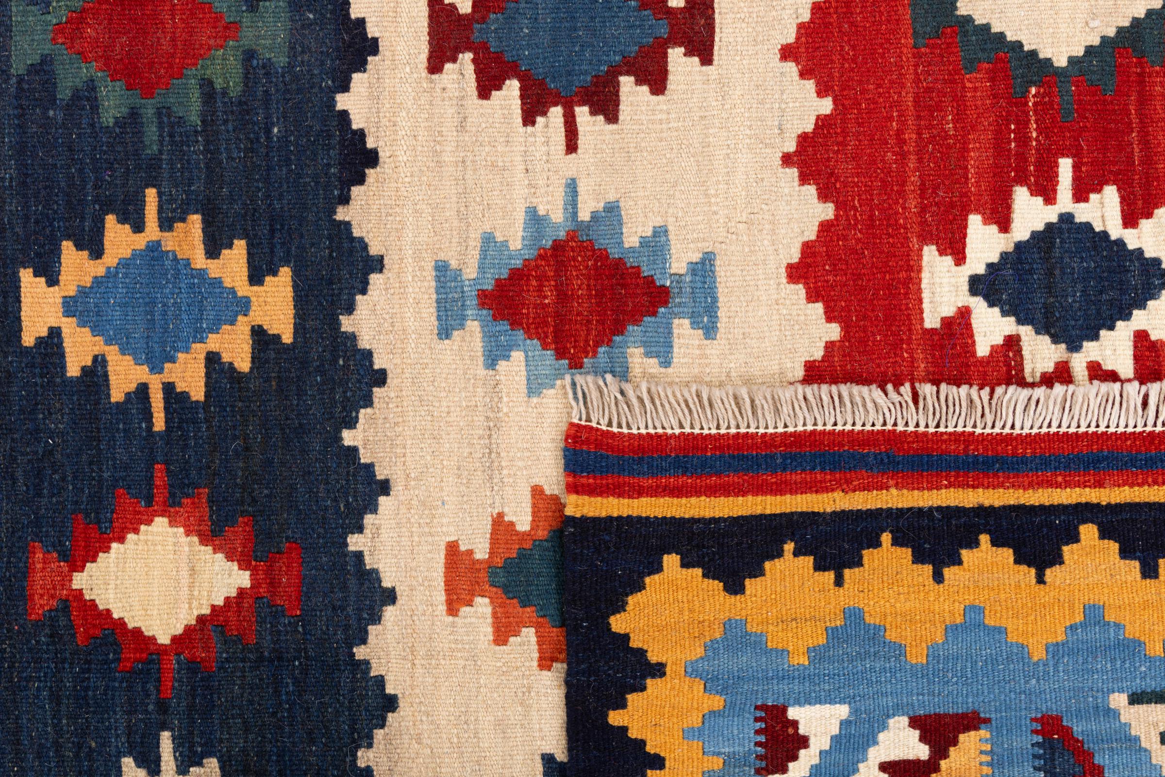Ce tapis a été fabriqué à la main sur un métier à tisser comme un tissage plat. Le terme 'Flatweave' est utilisé pour décrire les tapis qui n'ont pas de poils. Comme leur nom l'indique, ces tapis sont tissés et non pas noués. Il en résulte un tapis plat avec une surface structurée. Les tissages plats ne sont pas aussi doux et généralement plus fins que les tapis à nœuds. En même temps, ils sont beaucoup moins complexes à fabriquer et peuvent généralement être disposés des deux côtés (avant et arrière). Leurs motifs sont généralement géométriques, ce qui est déterminé par le tissu.