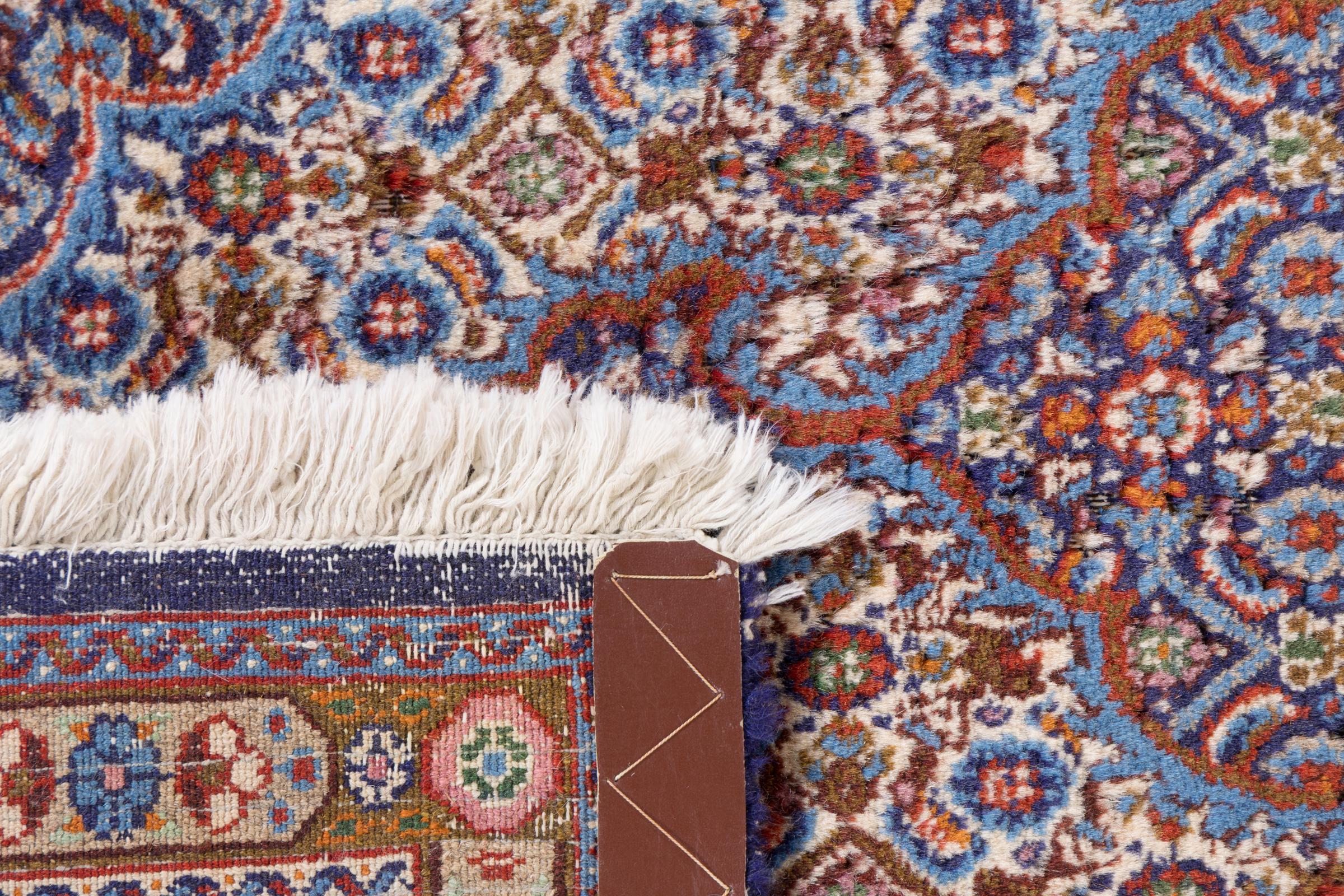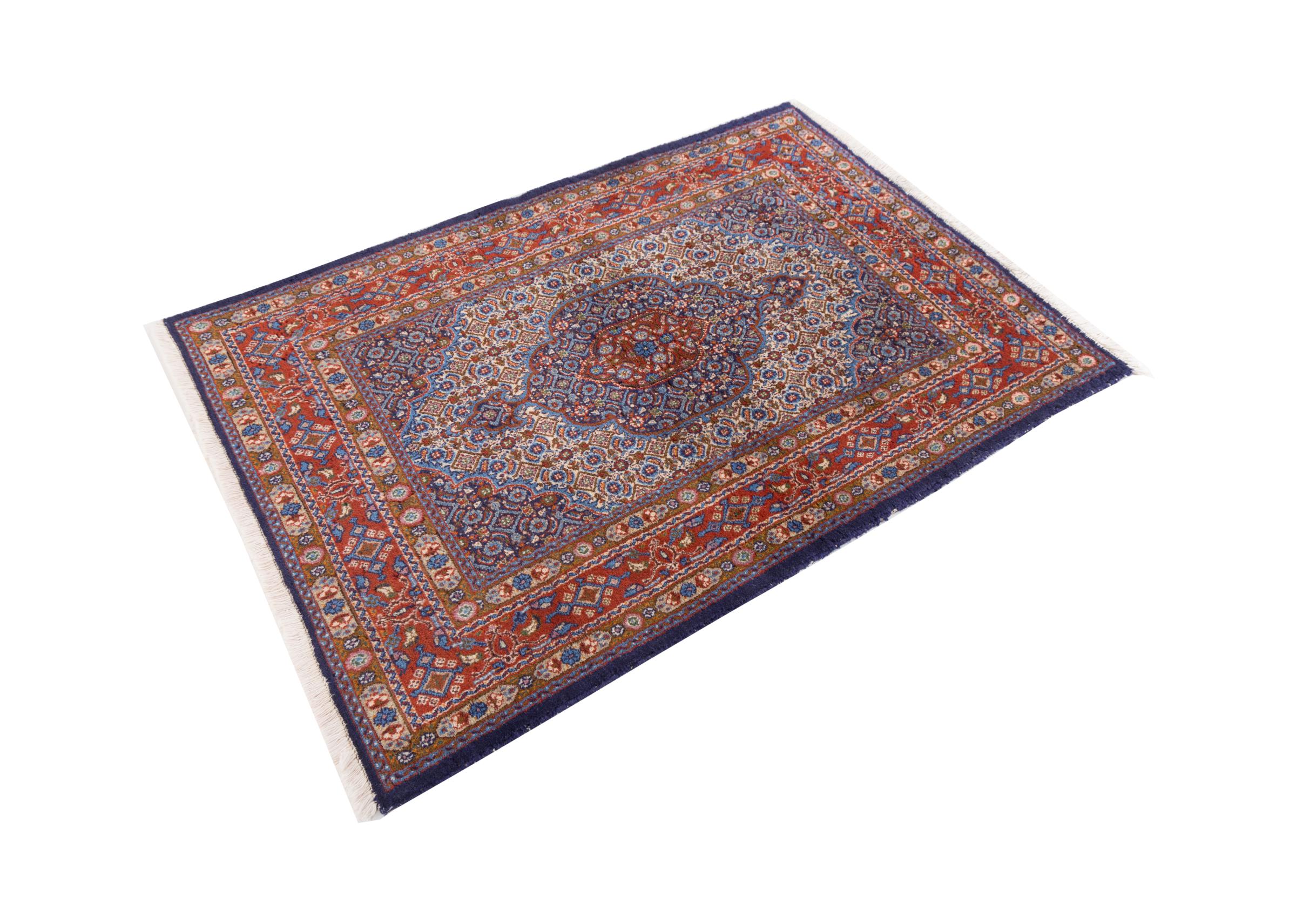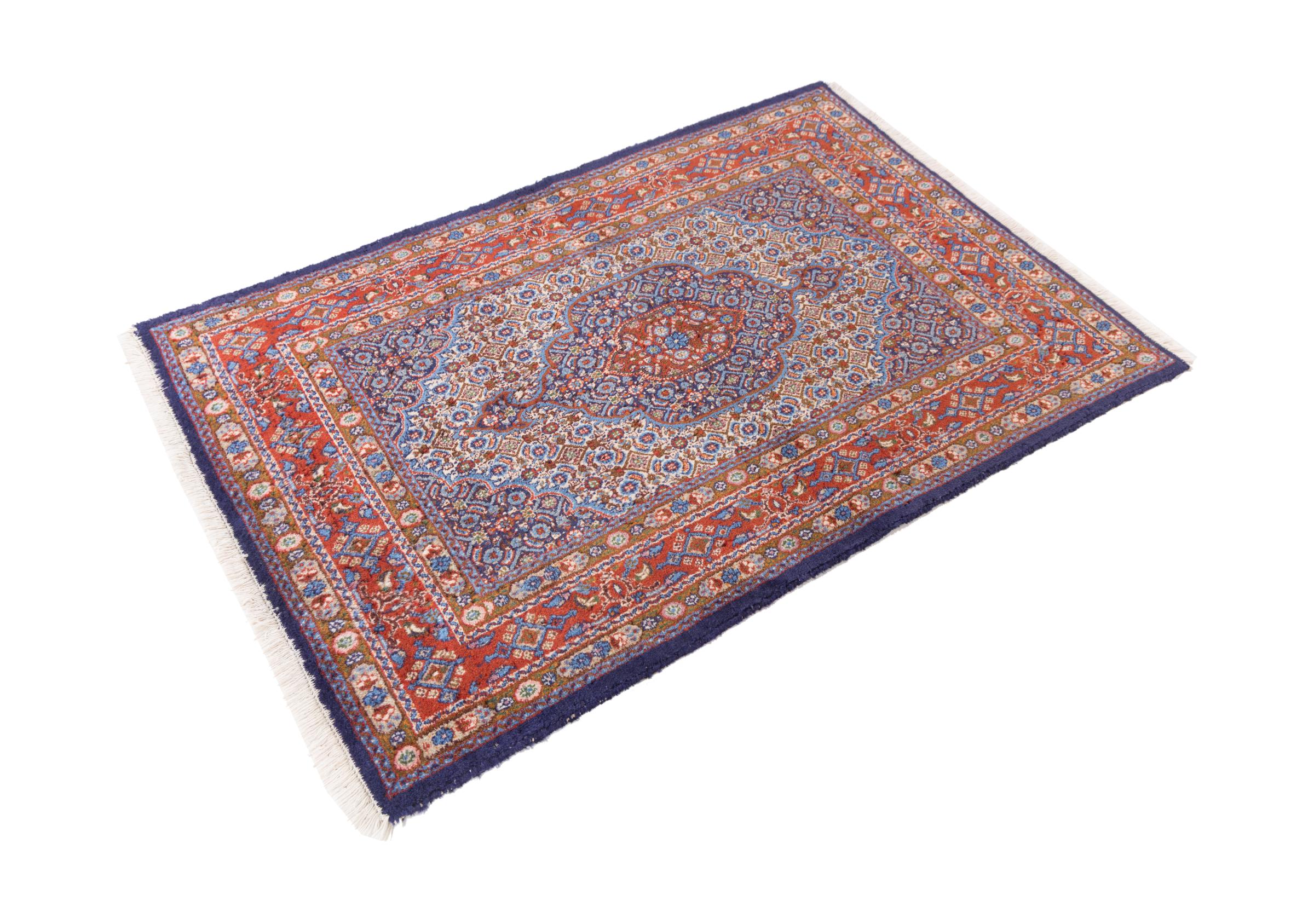 Moud est en Iran, au sud de Mashhad. En tant que ville de l'ancienne Perse, sa tradition de nouage de tapis remonte à plusieurs siècles, voire à des milliers d'années. Les tapis noués à la main de Moud jouissent d'une excellente réputation. Ils sont faits avec le fameux nœud persan. En général, les tapis persans brumeux ont un motif de couverture complète. Le motif Jardin avec des motifs de jardins persans ou le motif Herati.