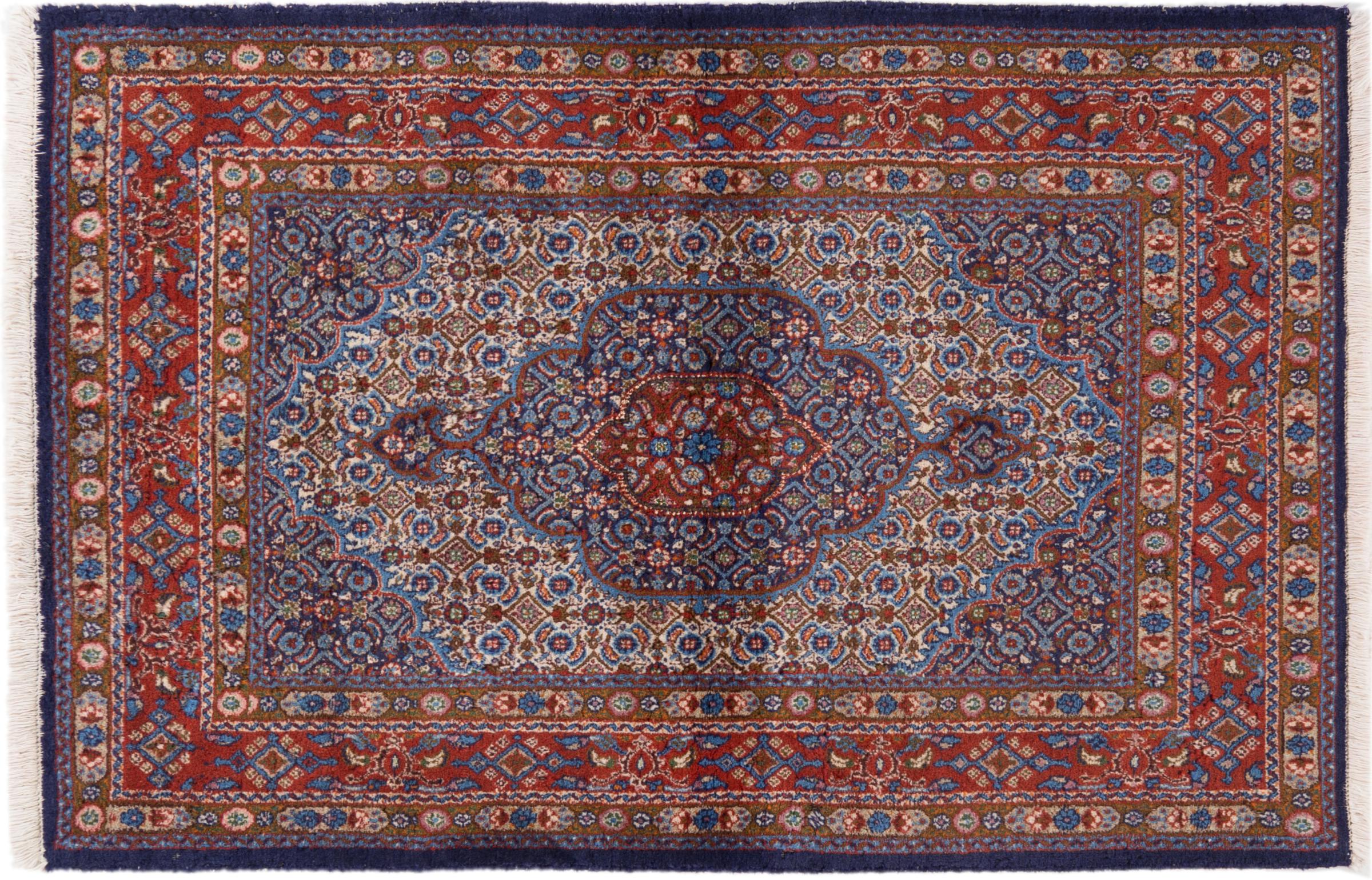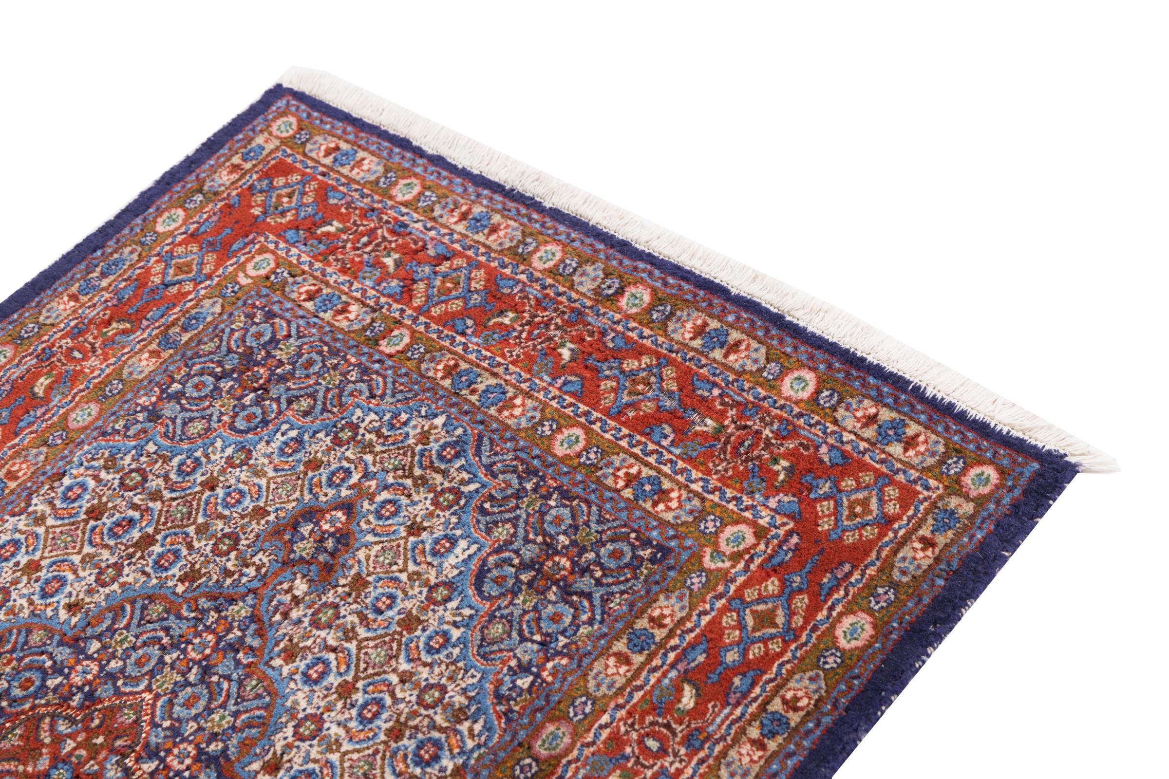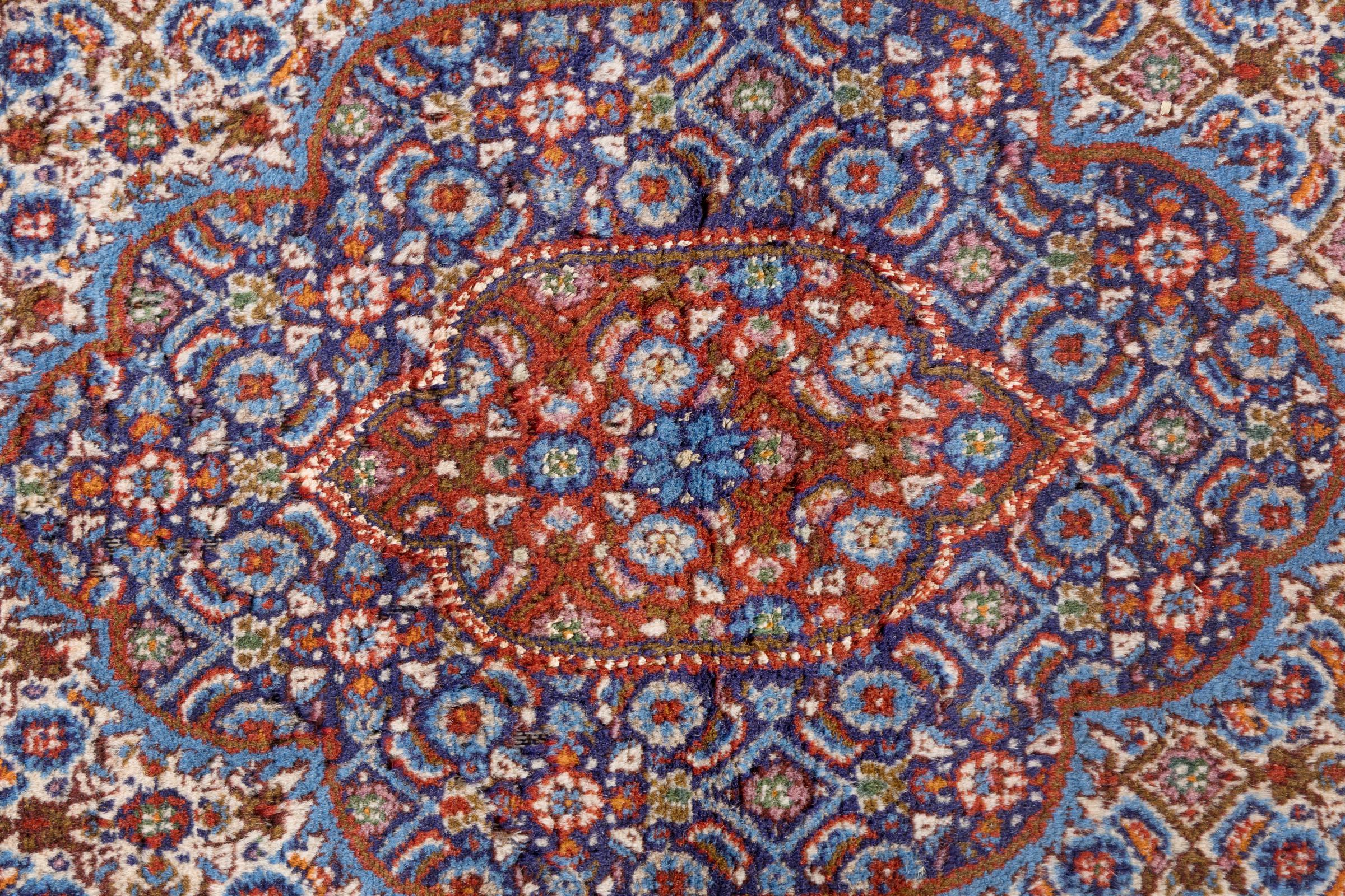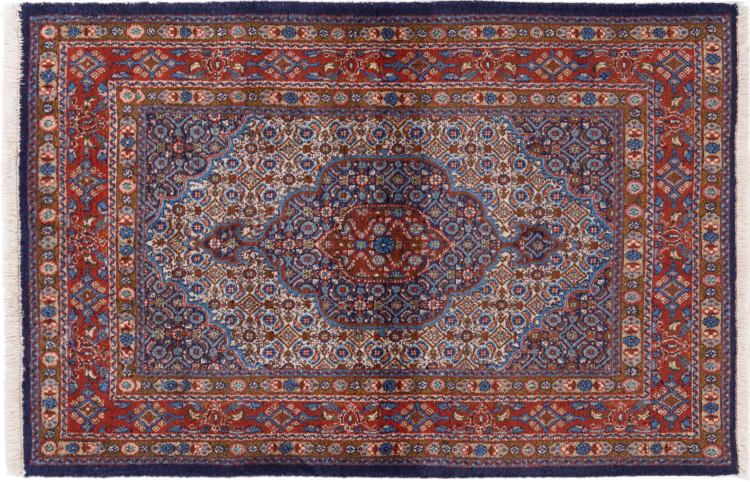 Moud est en Iran, au sud de Mashhad. En tant que ville de l'ancienne Perse, sa tradition de nouage de tapis remonte à plusieurs siècles, voire à des milliers d'années. Les tapis noués à la main de Moud jouissent d'une excellente réputation. Ils sont faits avec le fameux nœud persan. En général, les tapis persans brumeux ont un motif de couverture complète. Le motif Jardin avec des motifs de jardins persans ou le motif Herati.