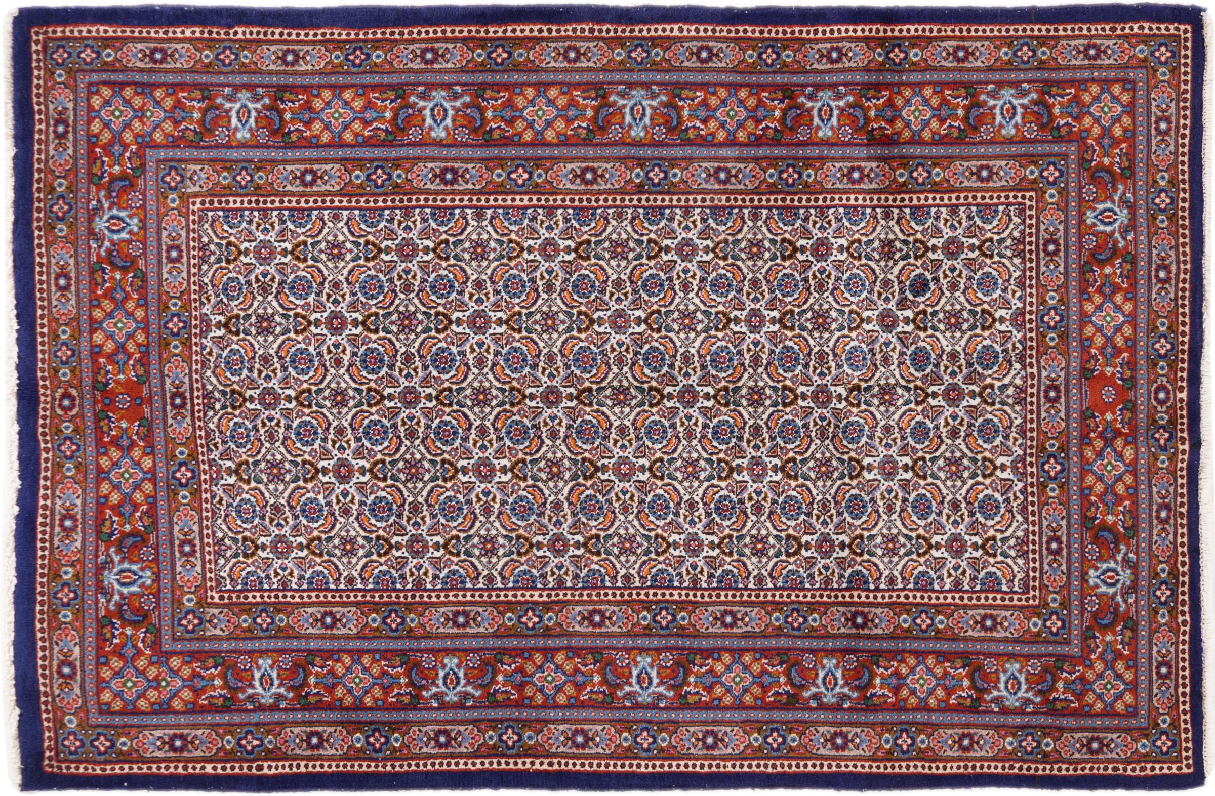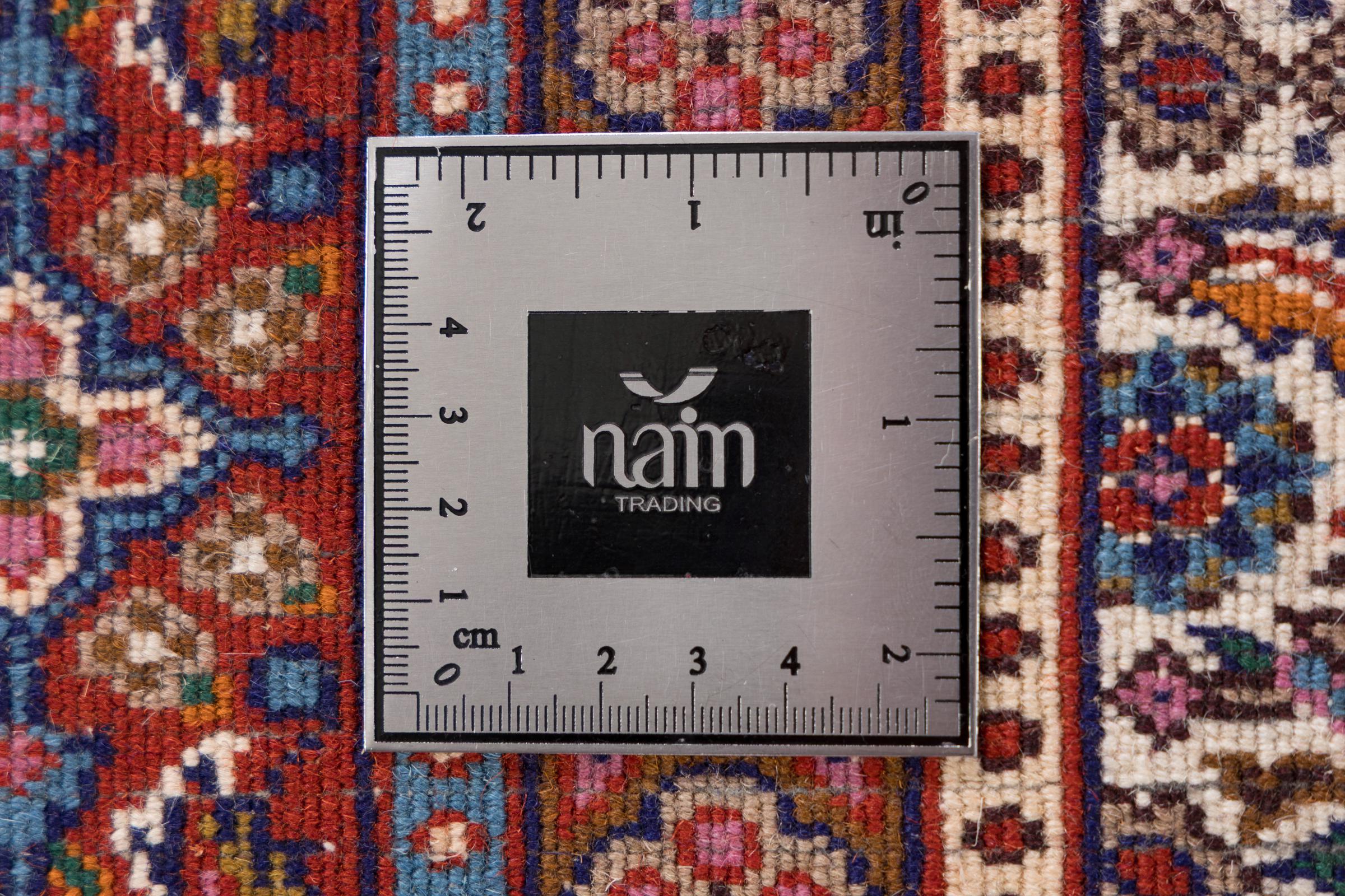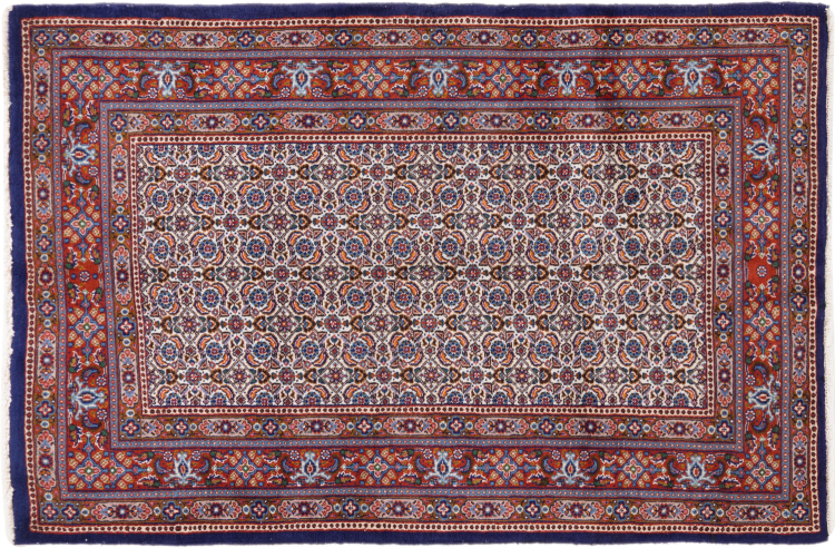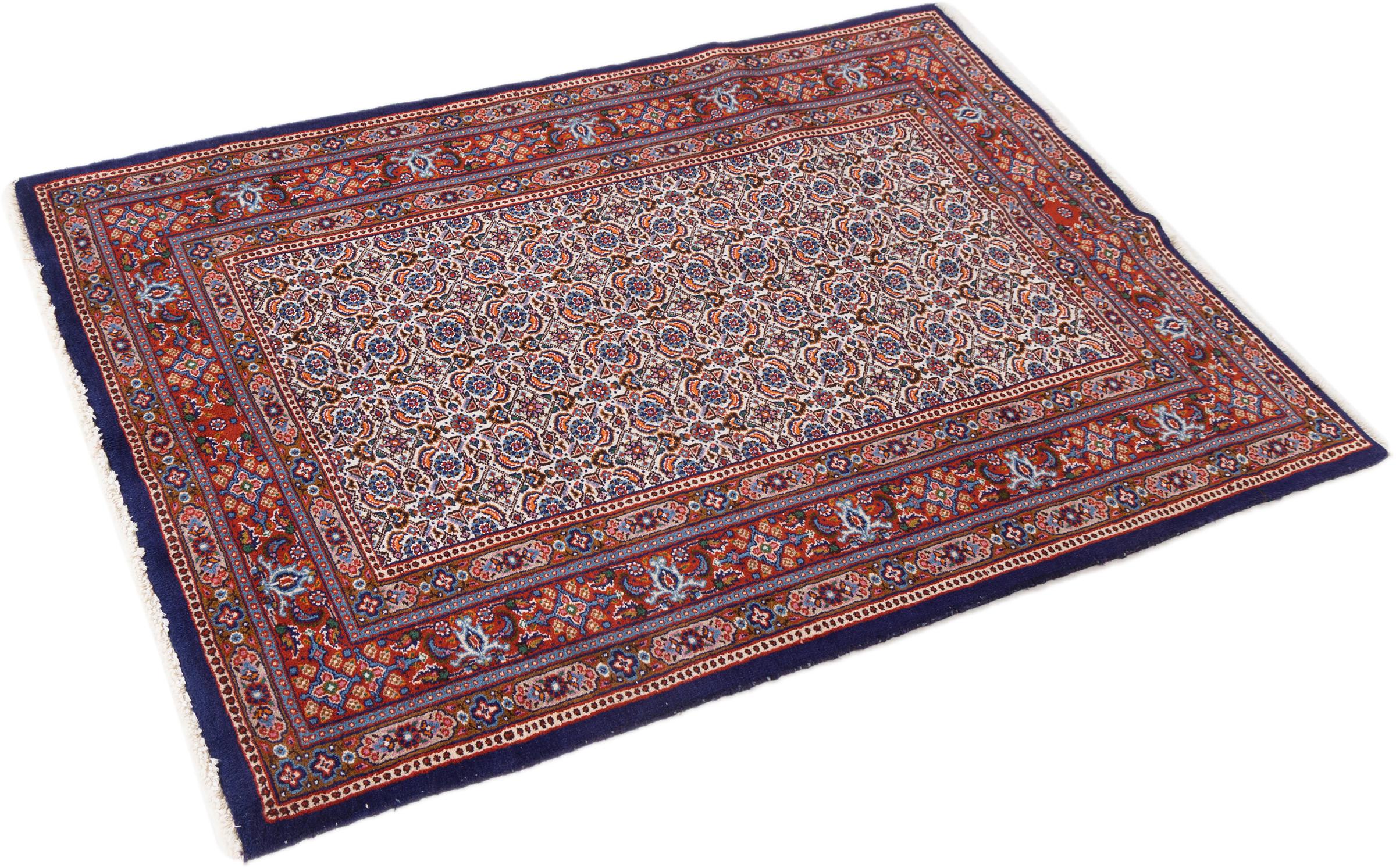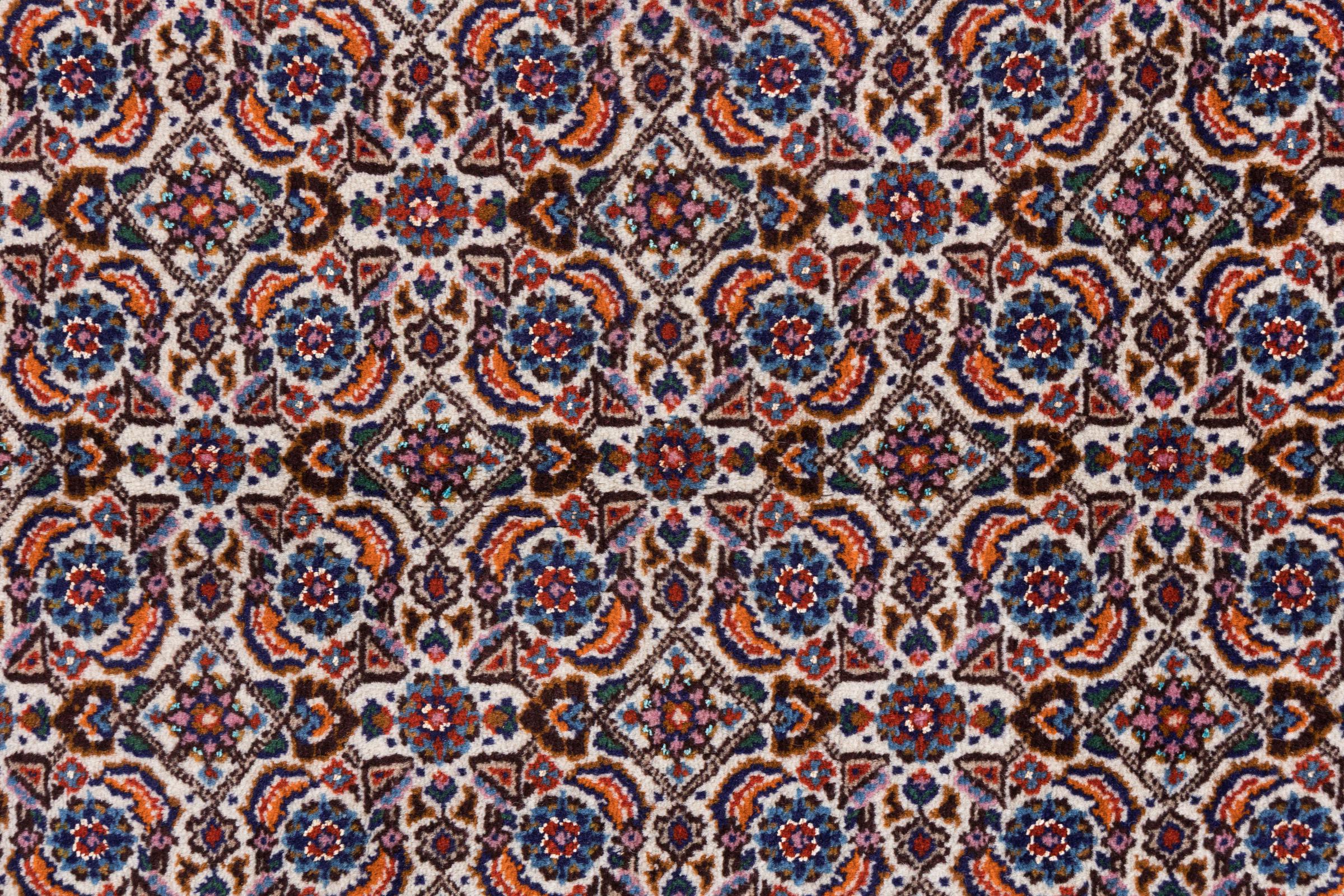 Moud est en Iran, au sud de Mashhad. En tant que ville de l'ancienne Perse, sa tradition de nouage de tapis remonte à plusieurs siècles, voire à des milliers d'années. Les tapis noués à la main de Moud jouissent d'une excellente réputation. Ils sont faits avec le fameux nœud persan. En général, les tapis persans brumeux ont un motif de couverture complète. Le motif Jardin avec des motifs de jardins persans ou le motif Herati.
