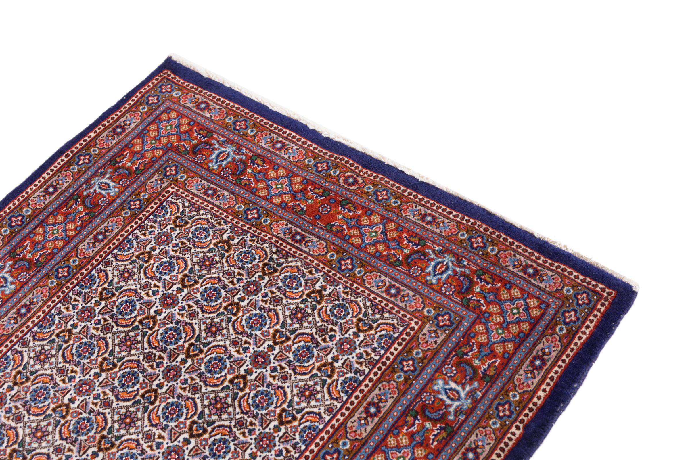 Ce tapis originaire de Moud, une ville située à 300 km au sud de Mashhad, sait comment convaincre. Son motif Herati est honorable. Quiconque recherche un tapis de fine qualité pour différents usages sera satisfait avec ce tapis.