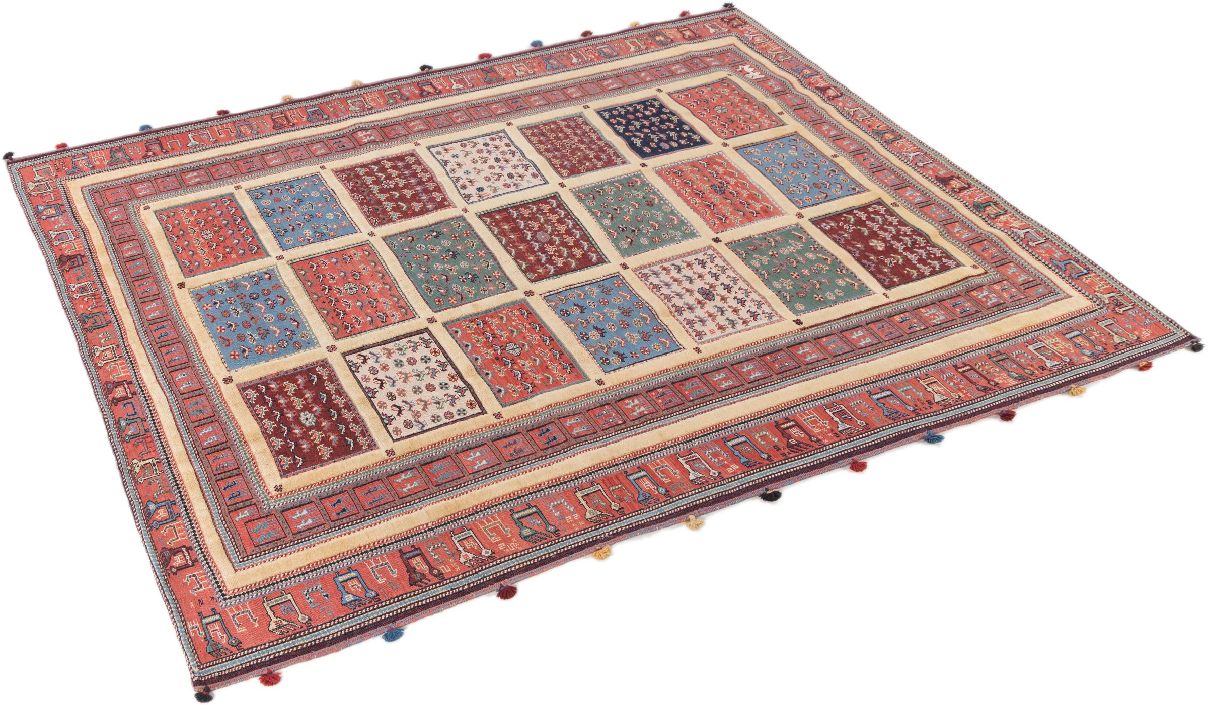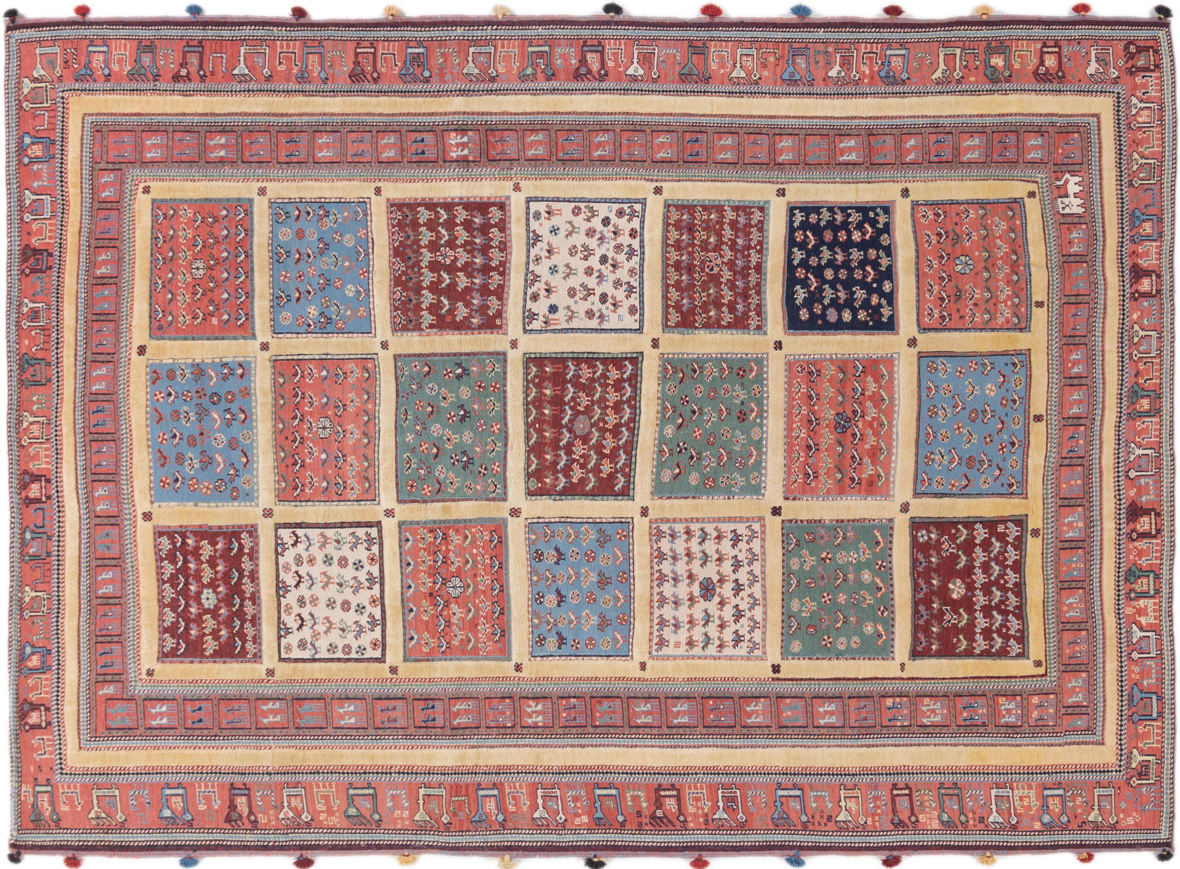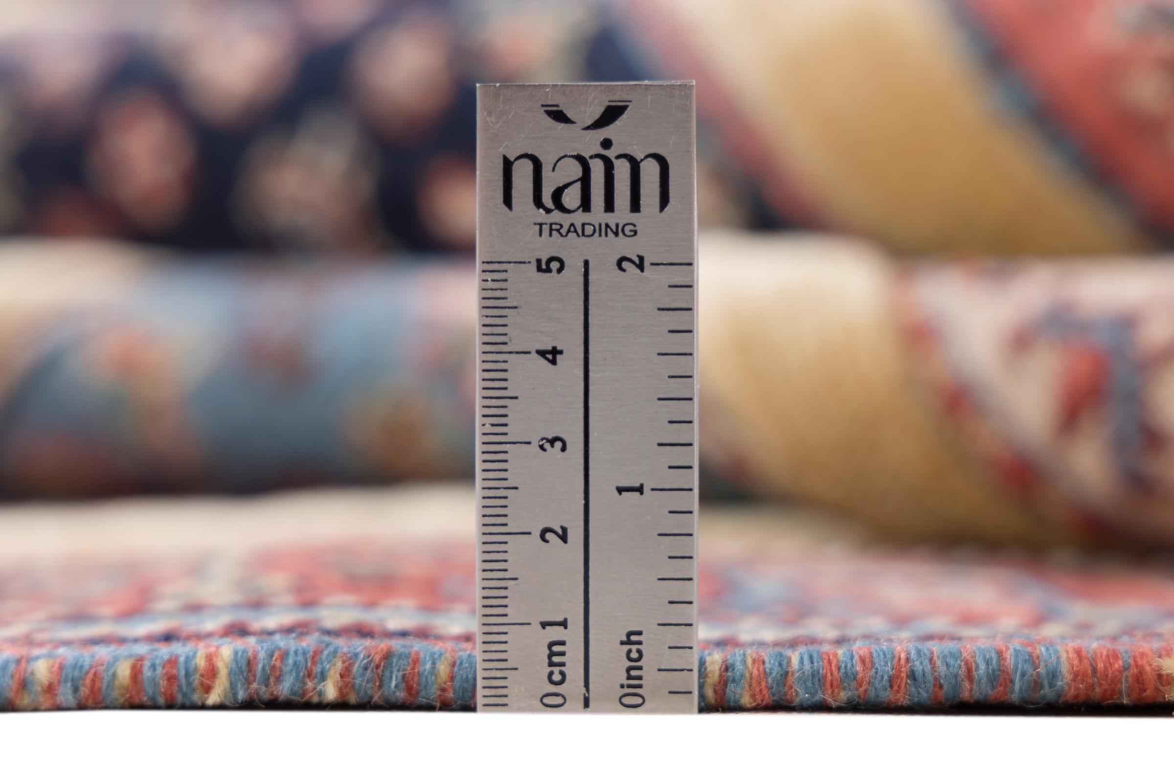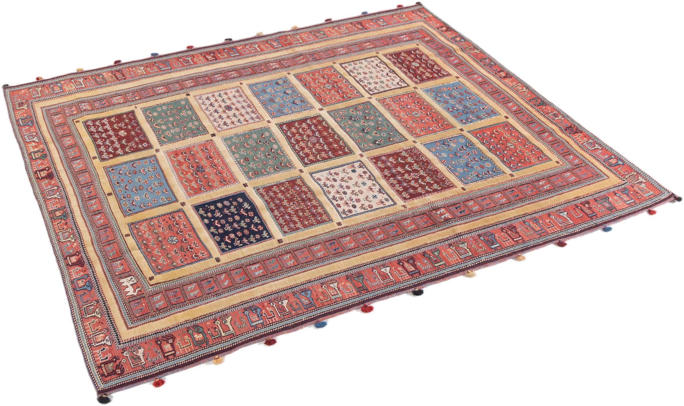 Ce tapis Nimbaft noué à la main mais également tissé à la main est un parfait exemple de savoir-faire et de l’union de deux extrêmement différents processus de fabrication de tapis d’Orient.