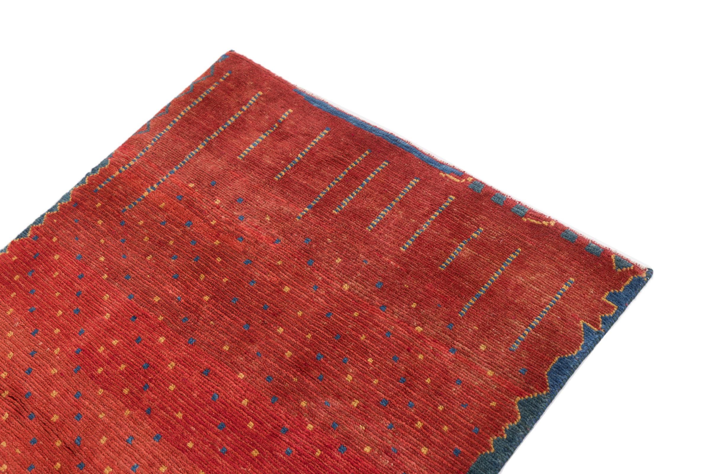 Ce magnifique tapis est un Gabbeh persan et fait donc partie des tapis Gabbeh de la plus haute qualité. Les tapis sont noués par des nomades ou des semi-nomades en Iran selon un savoir-faire traditionnel. Les motifs simples sont pour la plupart inspirés par l'environnement local des nomades. Par exemple, on peut trouver des chameaux, des arbres ou des buissons sur les tapis traditionnels. Les tapis de Gabbeh persan sont faits de laine provenant de troupeaux de moutons élevés localement. La laine est donc encore en grande partie filée à la main. Ainsi, chacun de ces tapis orientaux incarne un caractère unique de culture ancienne.