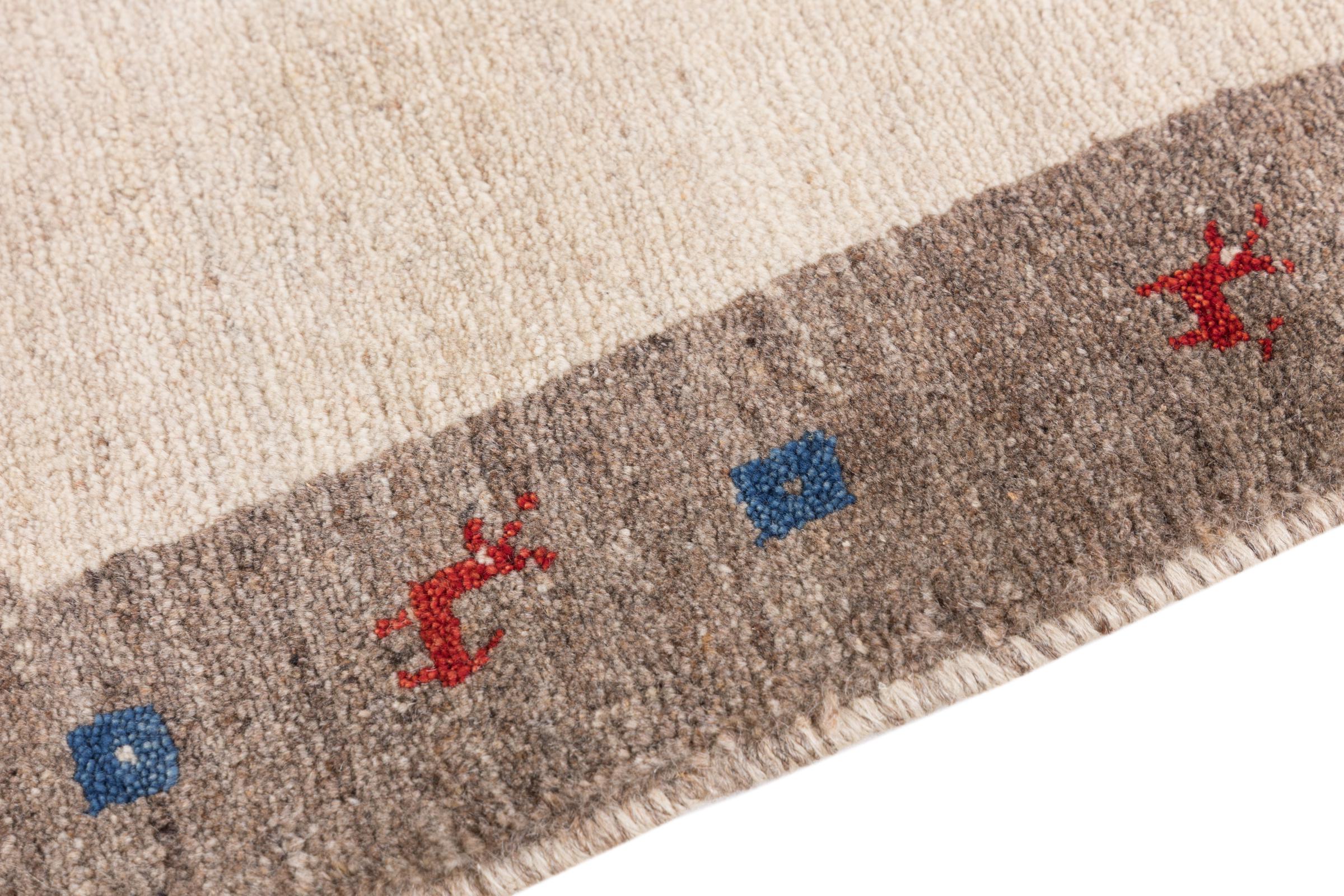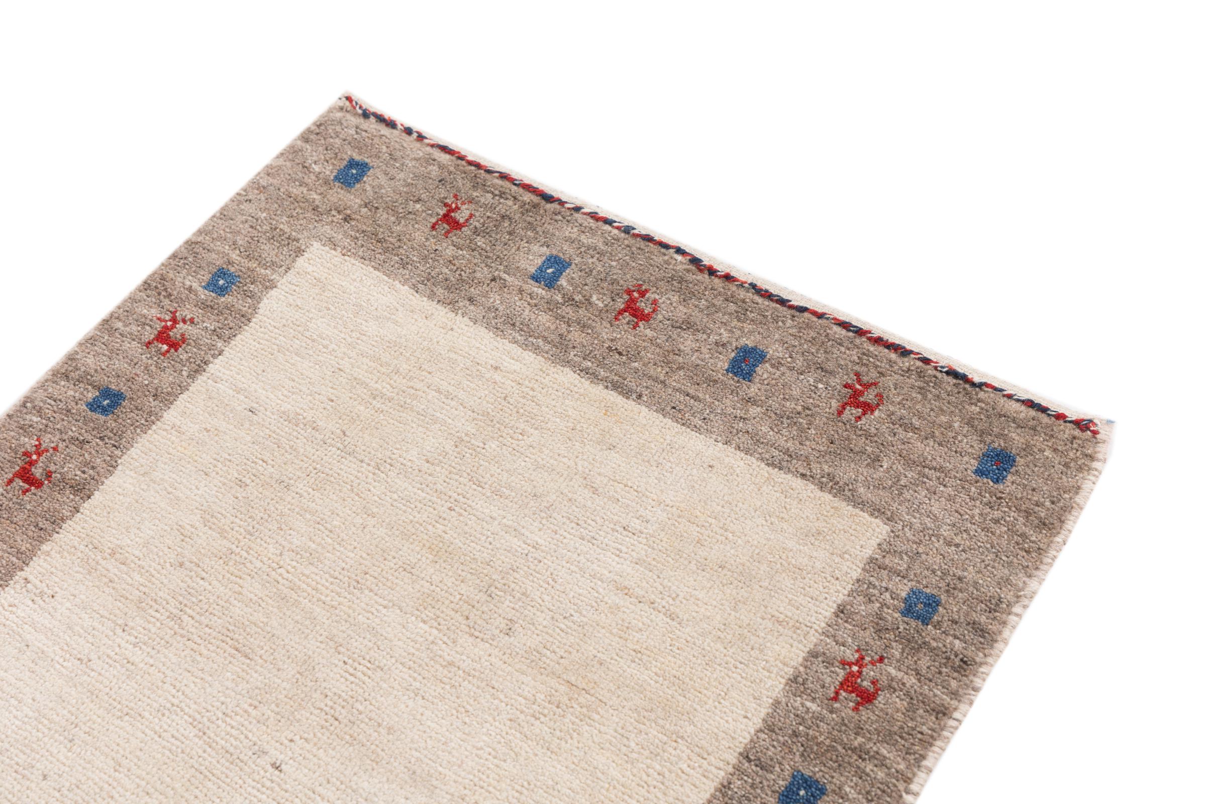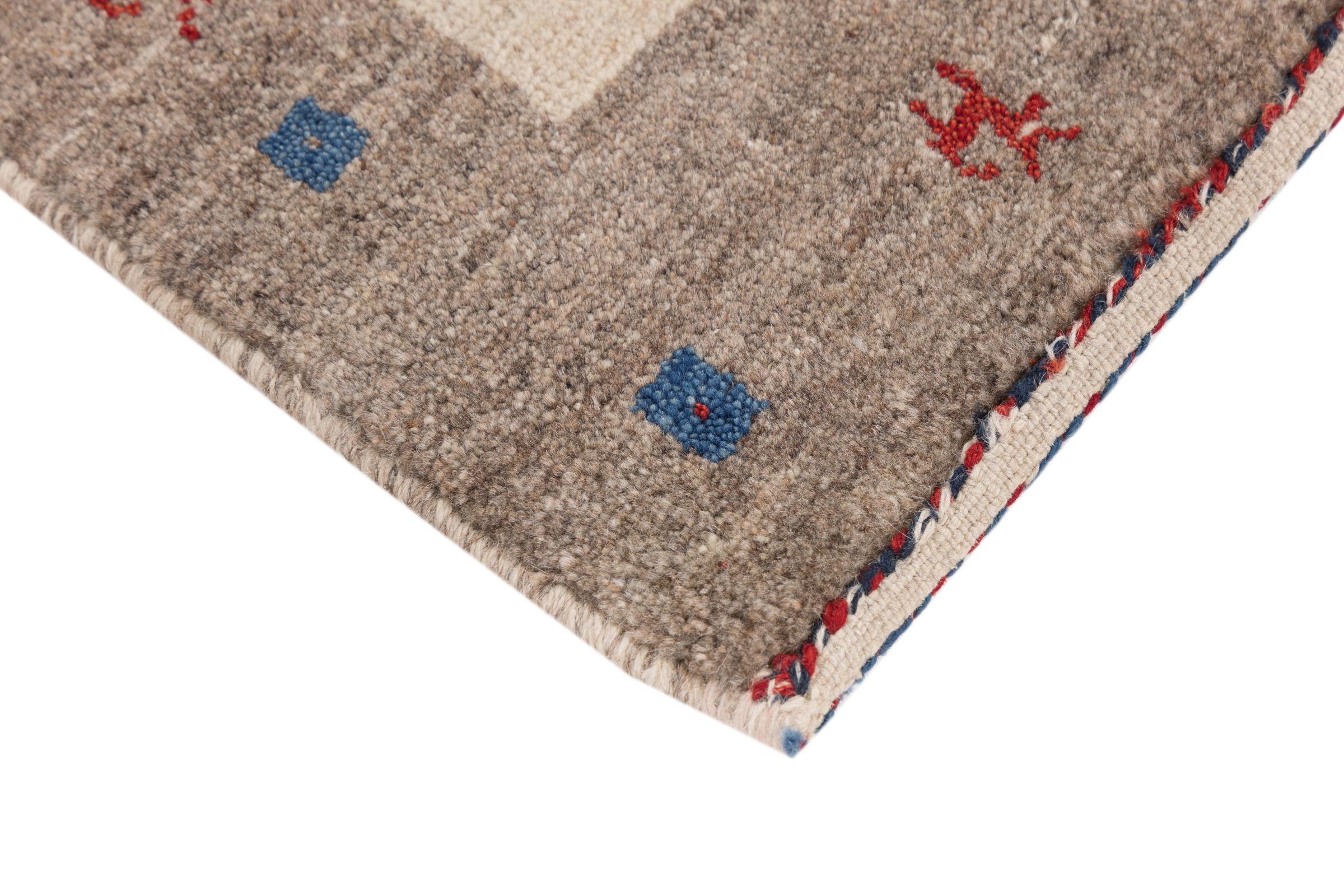 Ce tapis persan gabbeh est capable de séduire immédiatement n’importe qui grâce à sa haute qualité et à son robuste velours. Il a été fabriqué artisanalement par les nomades Ghasghai dans la région de Fars au sud de la Perse, à partir de la meilleure laine de mouton. Ils utilisent seulement des couleurs naturelles pour colorer la laine.