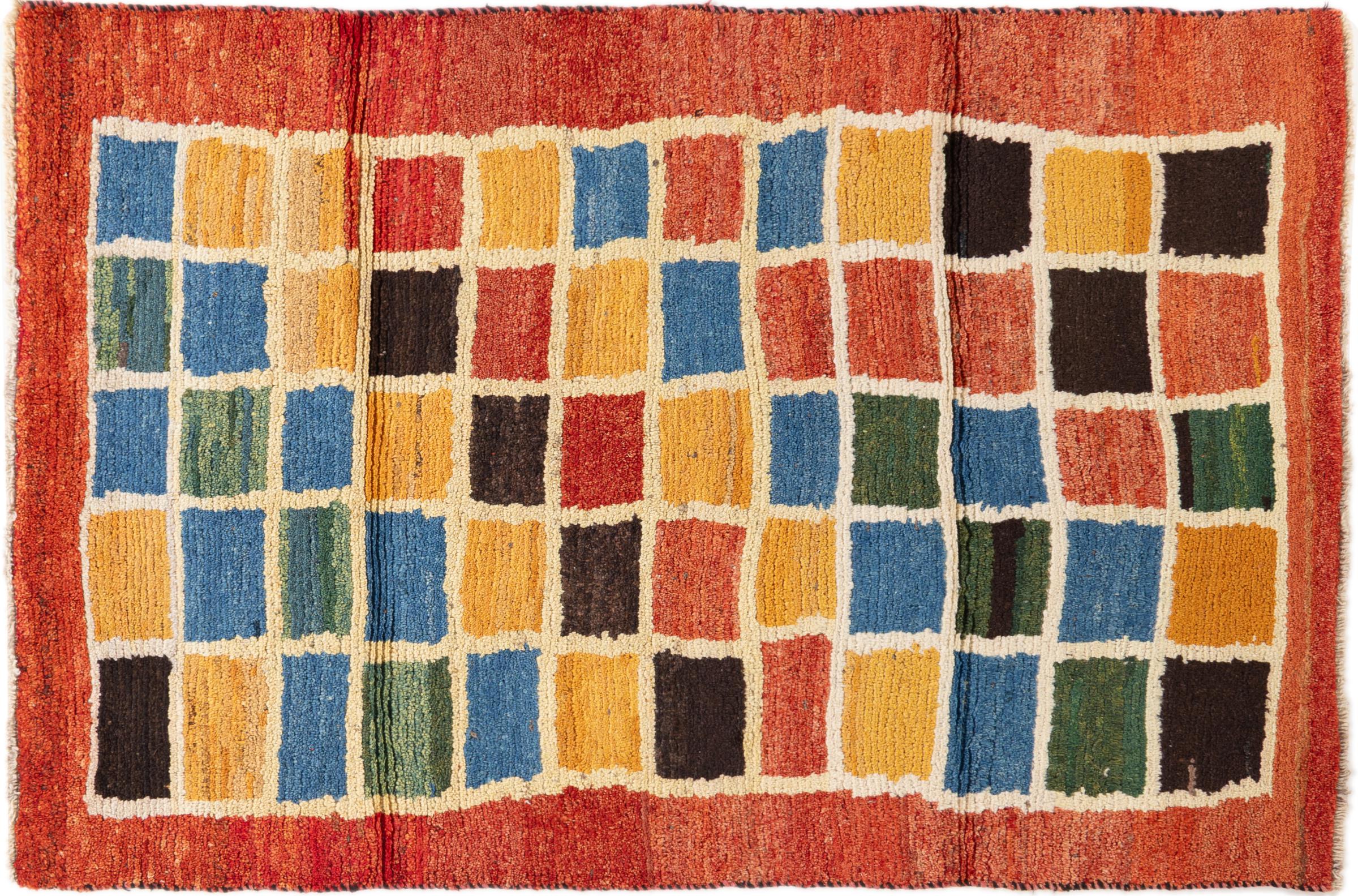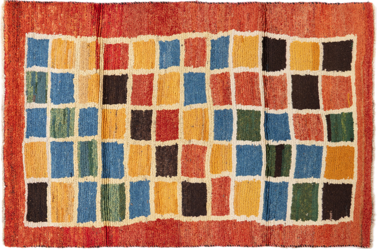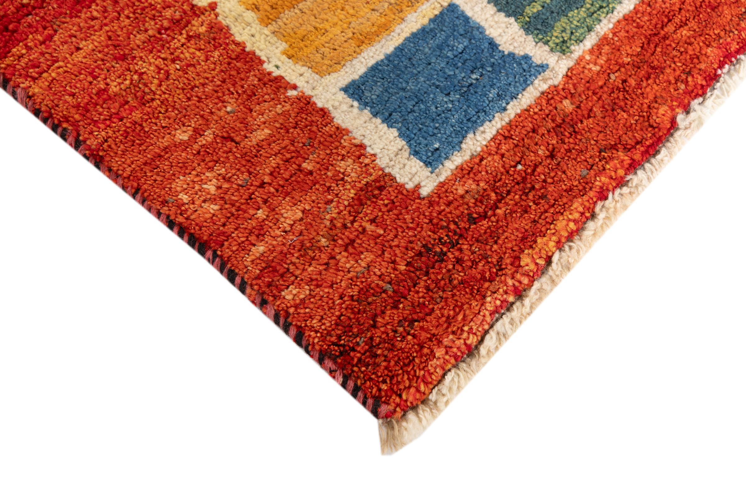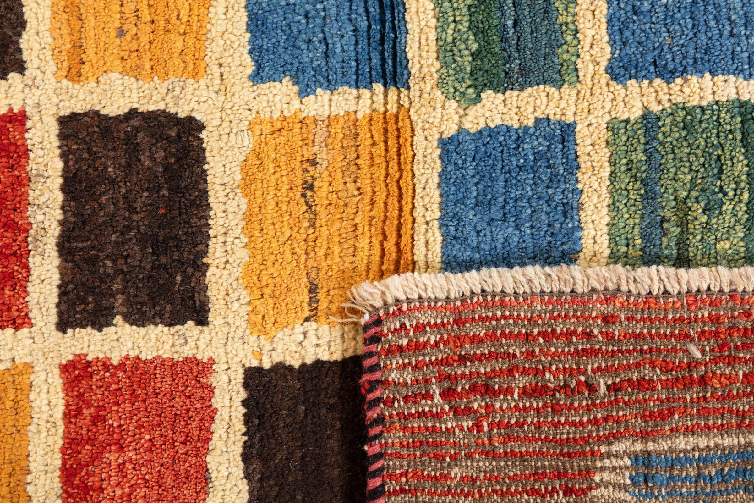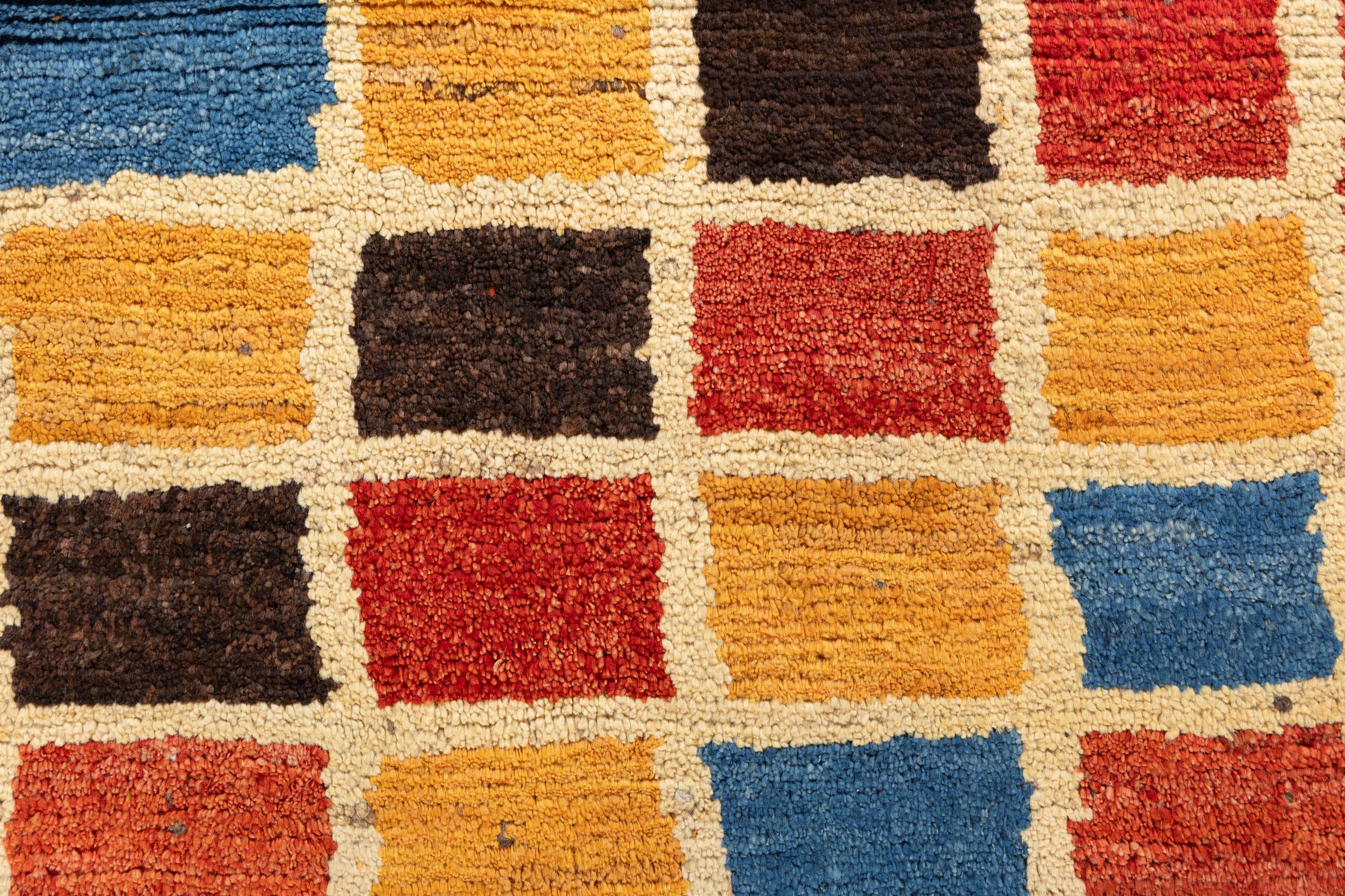 Ce tapis persan gabbeh est capable de séduire immédiatement n’importe qui grâce à sa haute qualité et à son robuste velours. Il a été fabriqué artisanalement par les nomades Ghasghai dans la région de Fars au sud de la Perse, à partir de la meilleure laine de mouton. Ils utilisent seulement des couleurs naturelles pour colorer la laine.