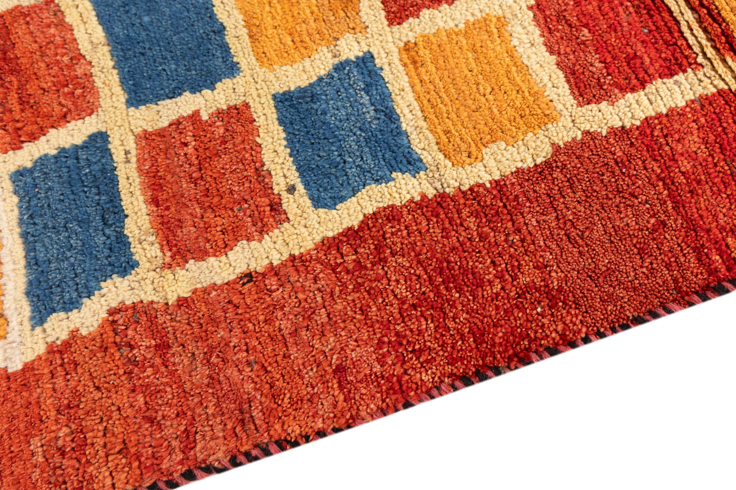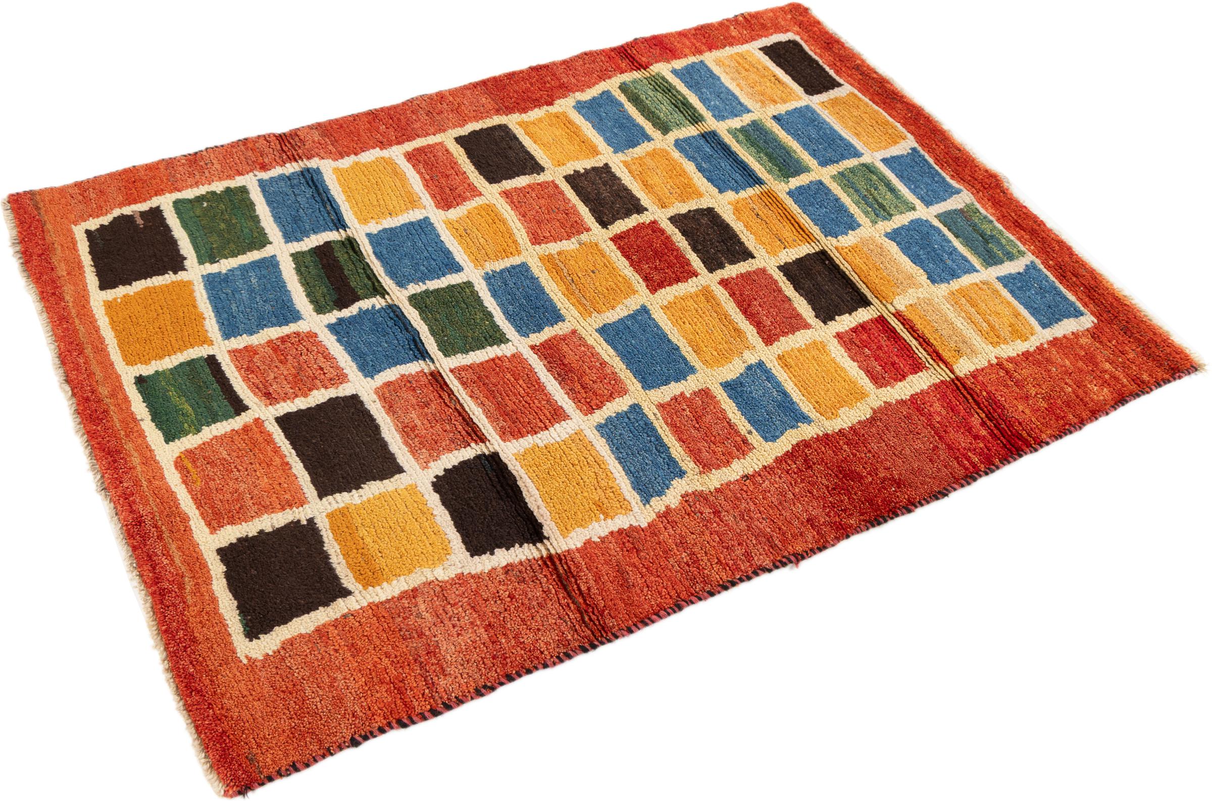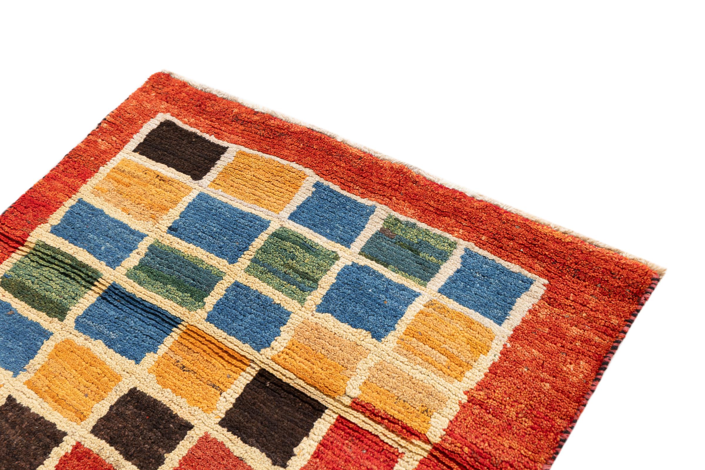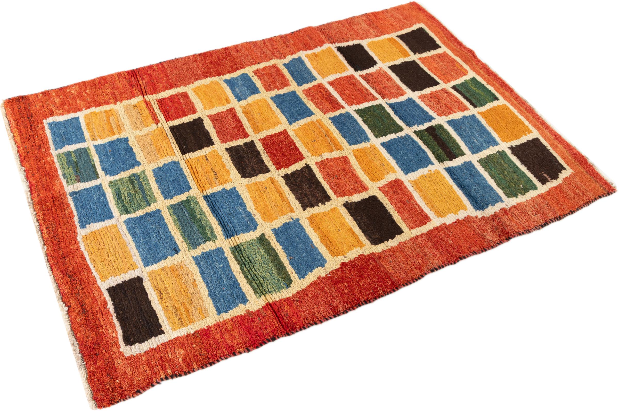 Ce tapis persan gabbeh est capable de séduire immédiatement n’importe qui grâce à sa haute qualité et à son robuste velours. Il a été fabriqué artisanalement par les nomades Ghasghai dans la région de Fars au sud de la Perse, à partir de la meilleure laine de mouton. Ils utilisent seulement des couleurs naturelles pour colorer la laine.