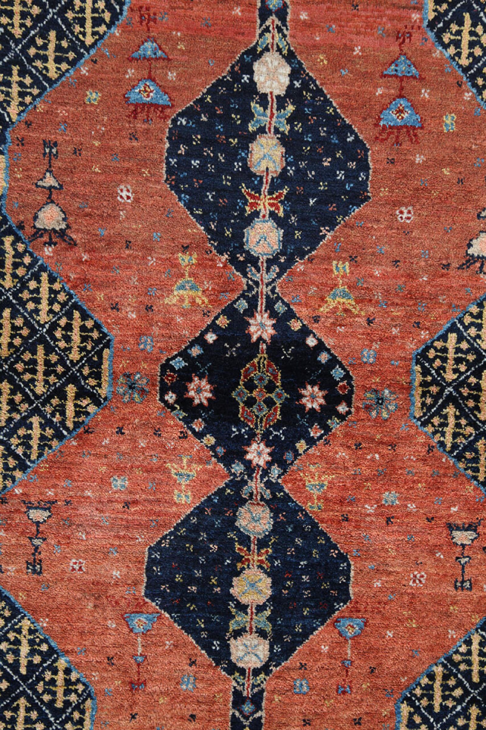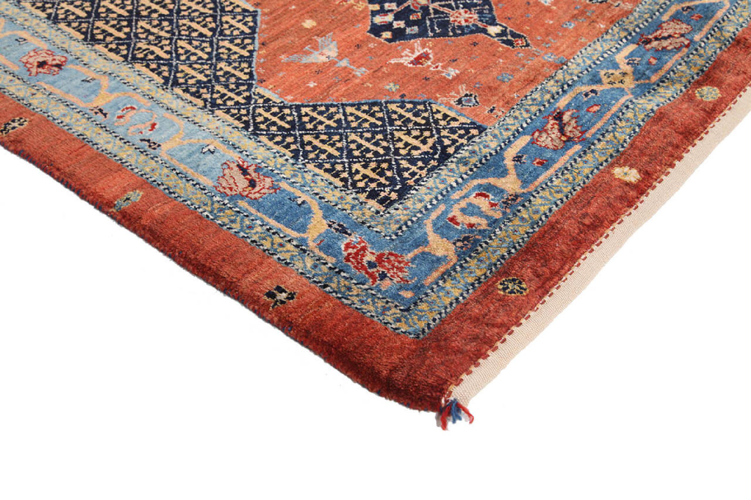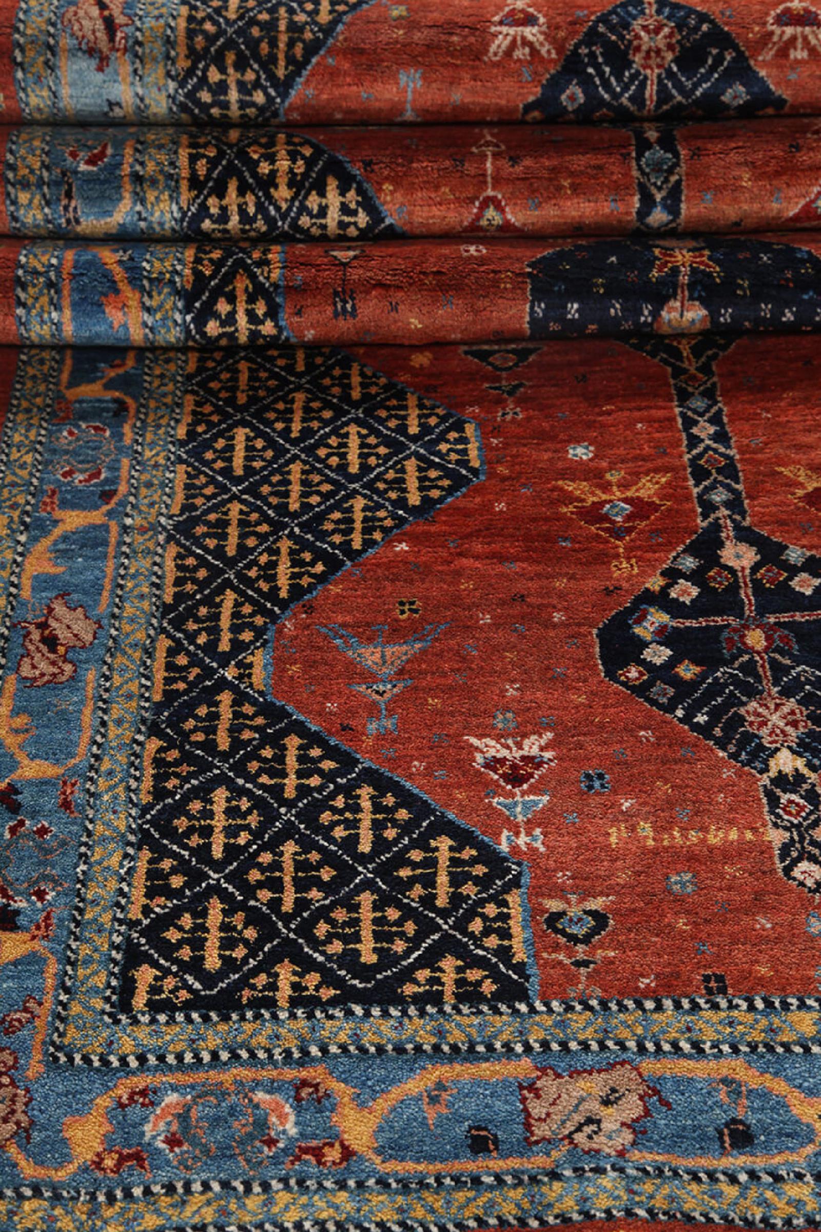 Ce magnifique tapis est un Gabbeh persan et fait donc partie des tapis Gabbeh de la plus haute qualité. Les tapis sont noués par des nomades ou des semi-nomades en Iran selon un savoir-faire traditionnel. Les motifs simples sont pour la plupart inspirés par l'environnement local des nomades. Par exemple, on peut trouver des chameaux, des arbres ou des buissons sur les tapis traditionnels. Les tapis de Gabbeh persan sont faits de laine provenant de troupeaux de moutons élevés localement. La laine est donc encore en grande partie filée à la main. Ainsi, chacun de ces tapis orientaux incarne un caractère unique de culture ancienne.