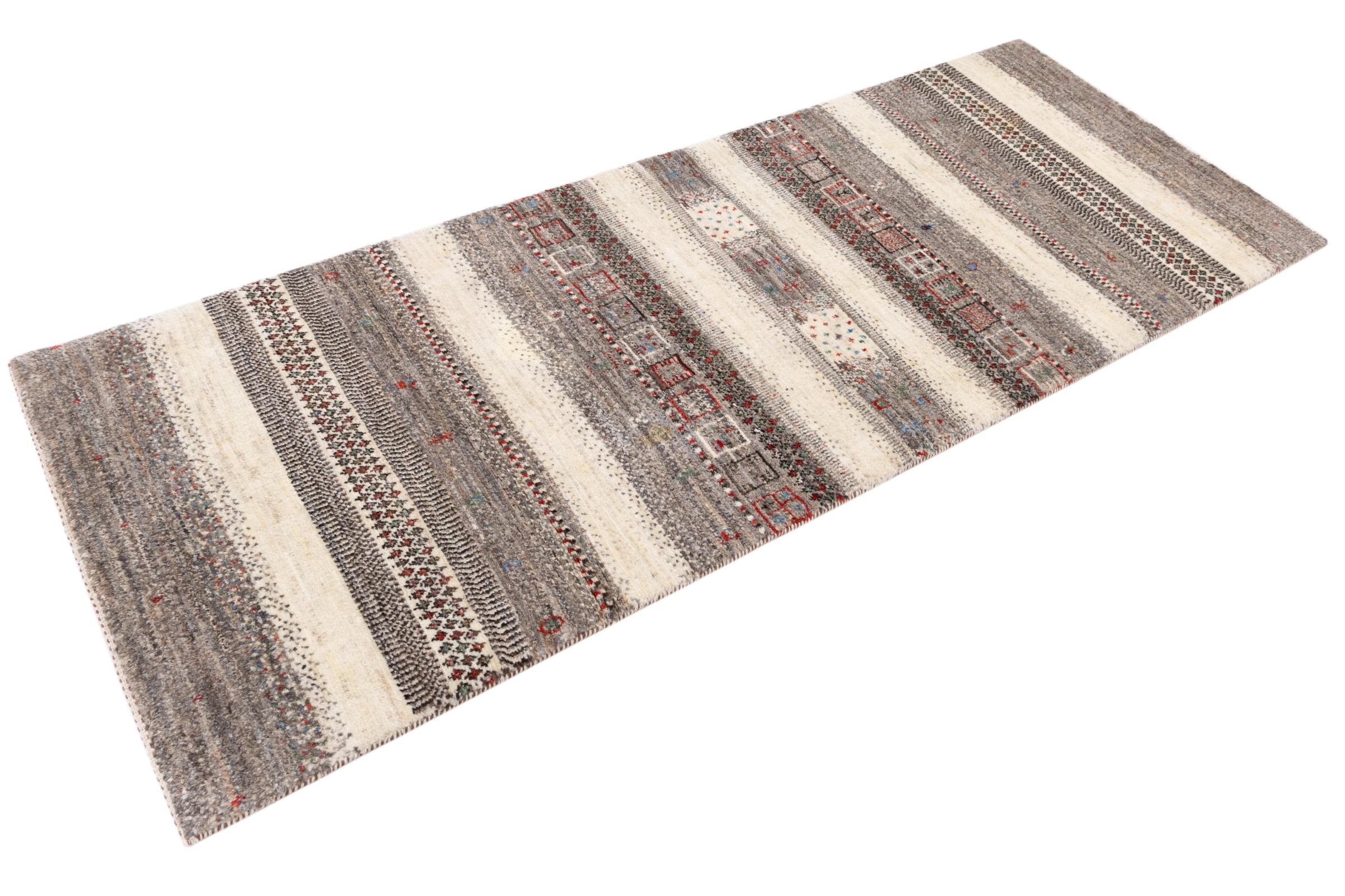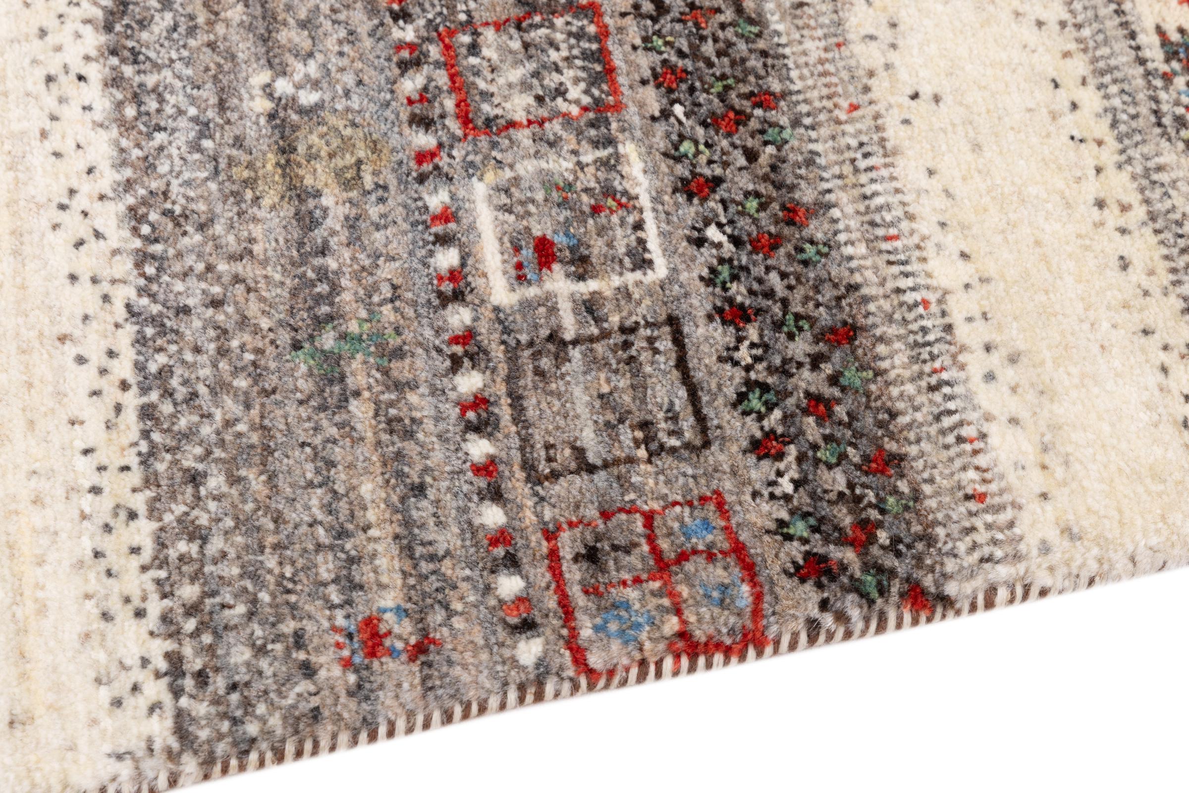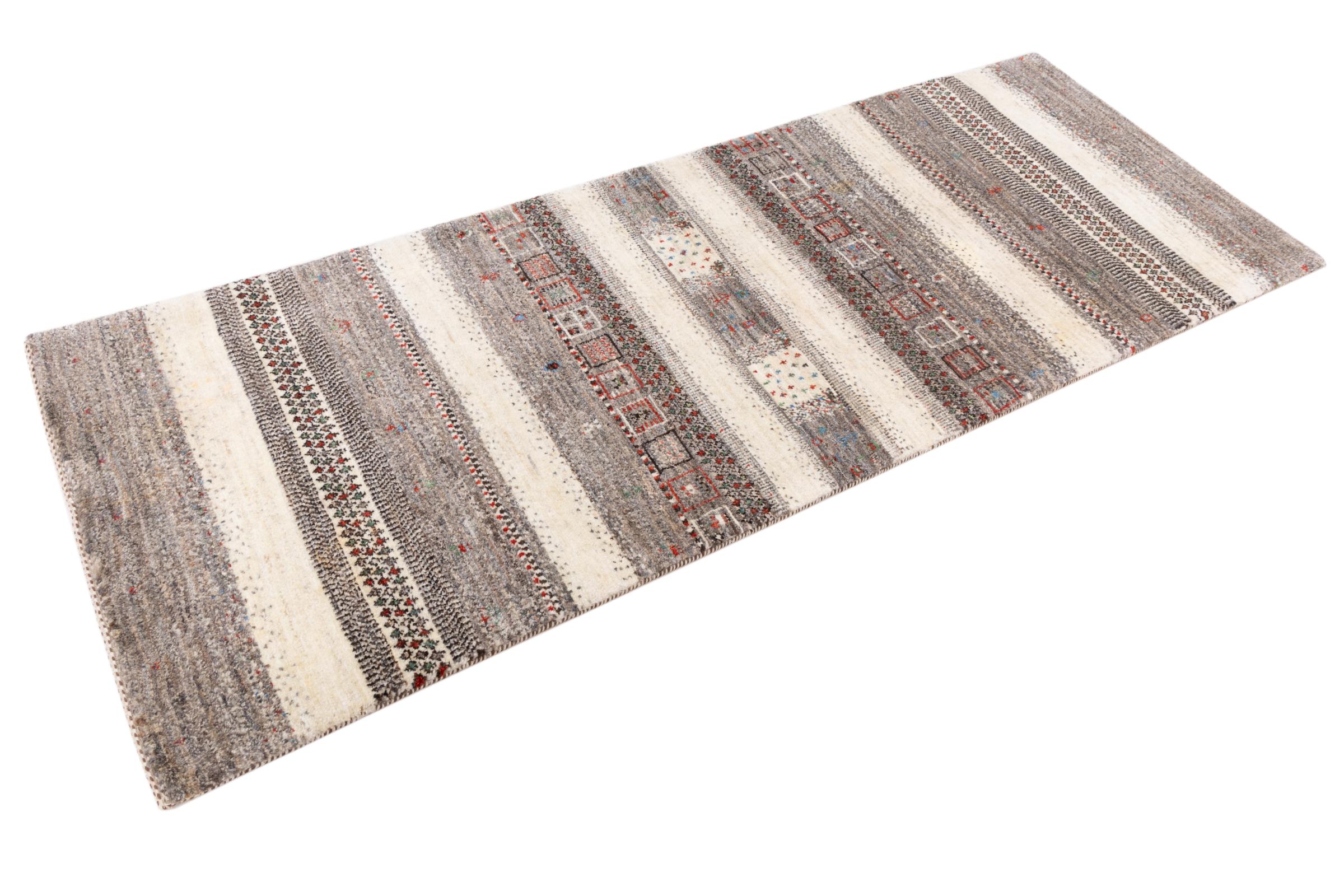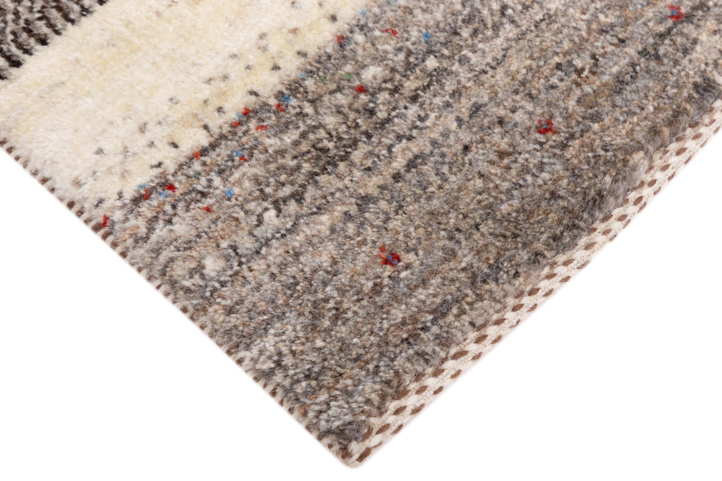 Ce magnifique tapis est un Gabbeh persan et fait donc partie des tapis Gabbeh de la plus haute qualité. Les tapis sont noués par des nomades ou des semi-nomades en Iran selon un savoir-faire traditionnel. Les motifs simples sont pour la plupart inspirés par l'environnement local des nomades. Par exemple, on peut trouver des chameaux, des arbres ou des buissons sur les tapis traditionnels. Les tapis de Gabbeh persan sont faits de laine provenant de troupeaux de moutons élevés localement. La laine est donc encore en grande partie filée à la main. Ainsi, chacun de ces tapis orientaux incarne un caractère unique de culture ancienne.