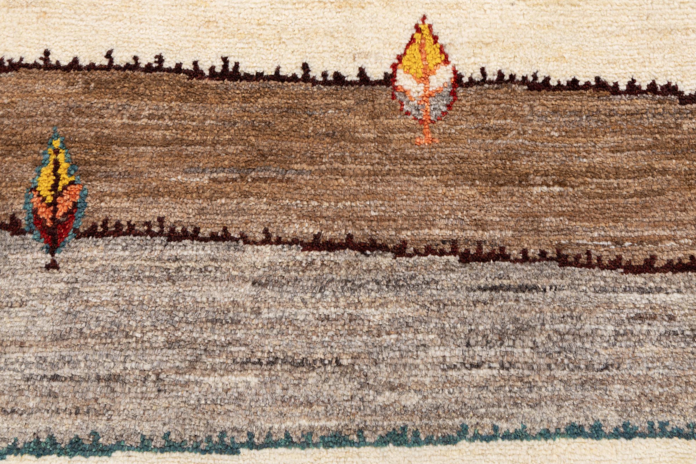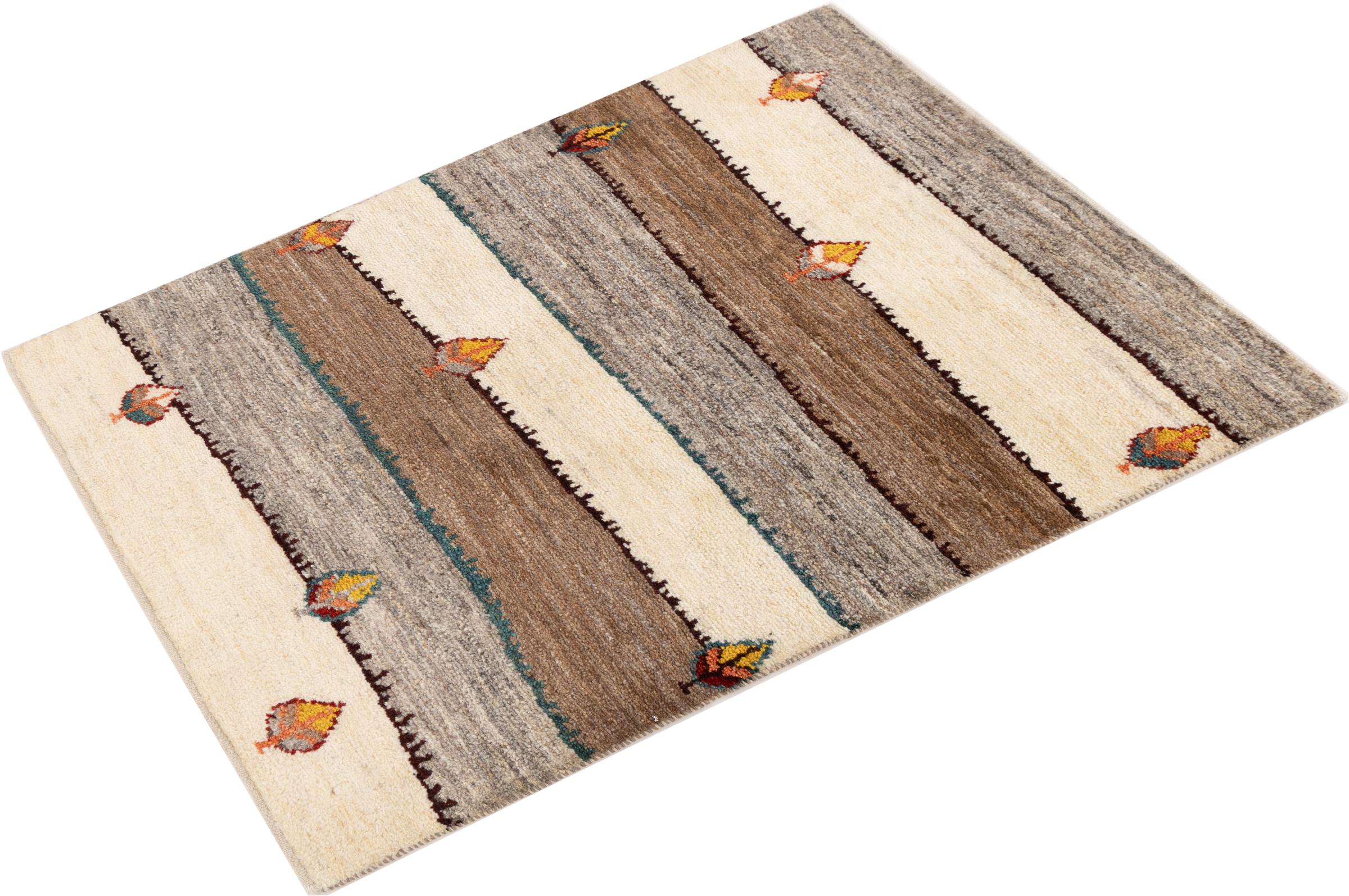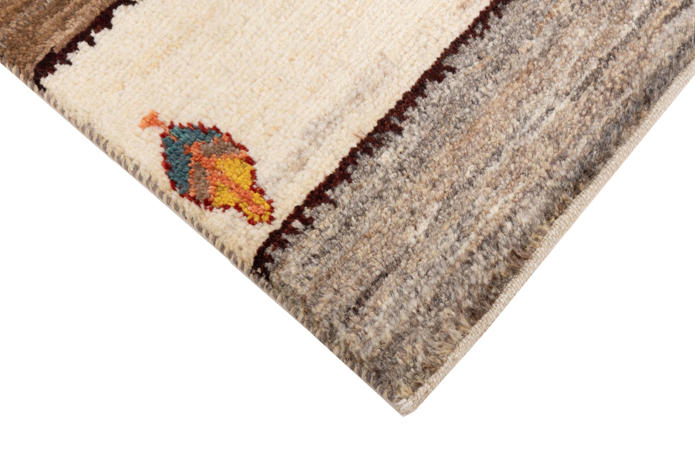 Ce tapis persan gabbeh est capable de séduire immédiatement n’importe qui grâce à sa haute qualité et à son robuste velours. Il a été fabriqué artisanalement par les nomades Ghasghai dans la région de Fars au sud de la Perse, à partir de la meilleure laine de mouton. Ils utilisent seulement des couleurs naturelles pour colorer la laine.