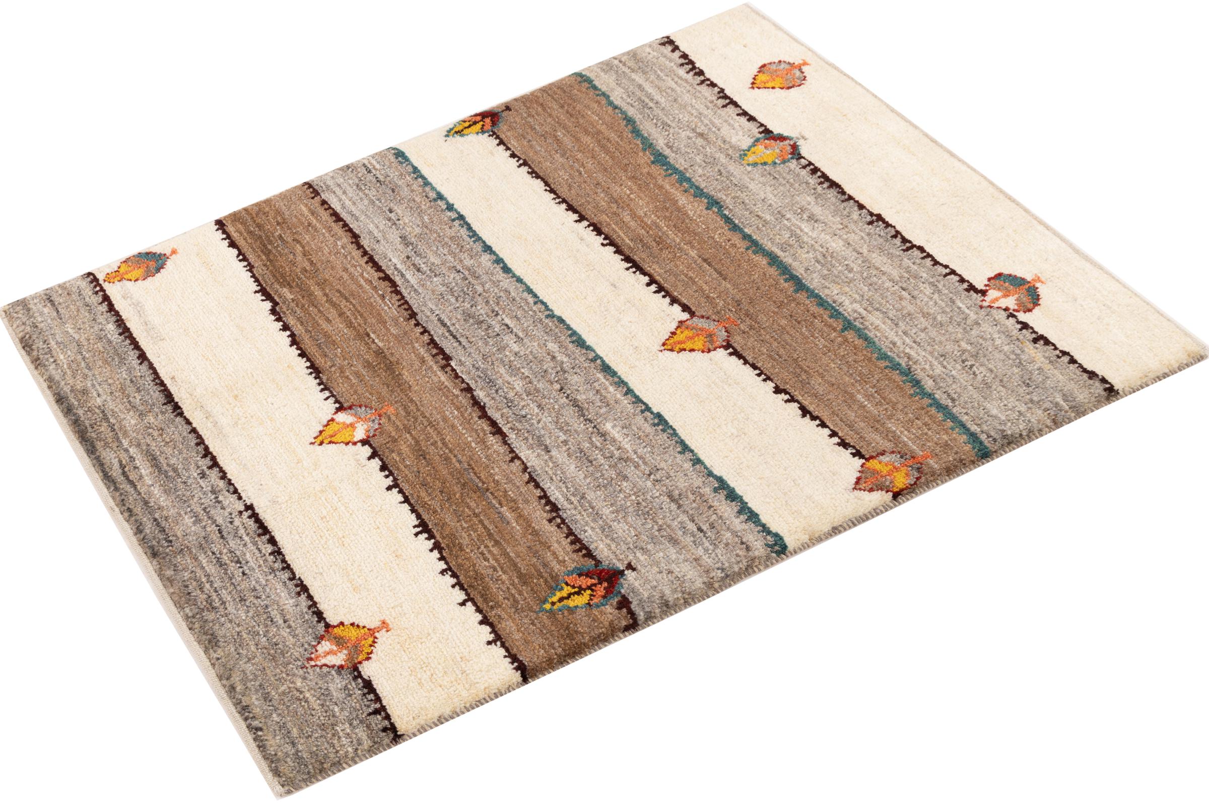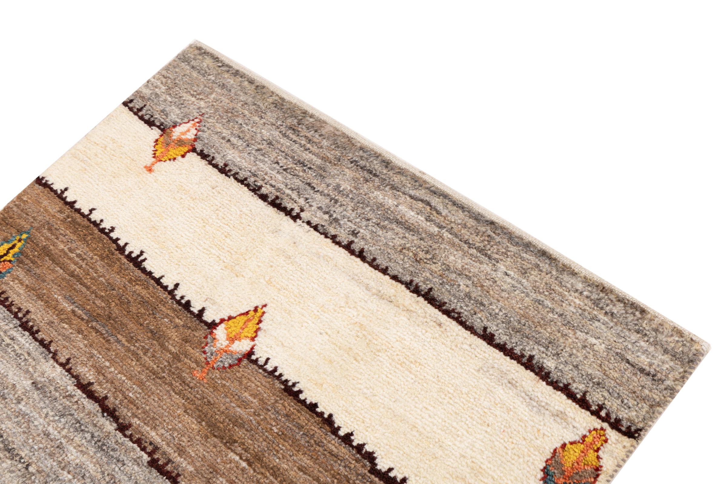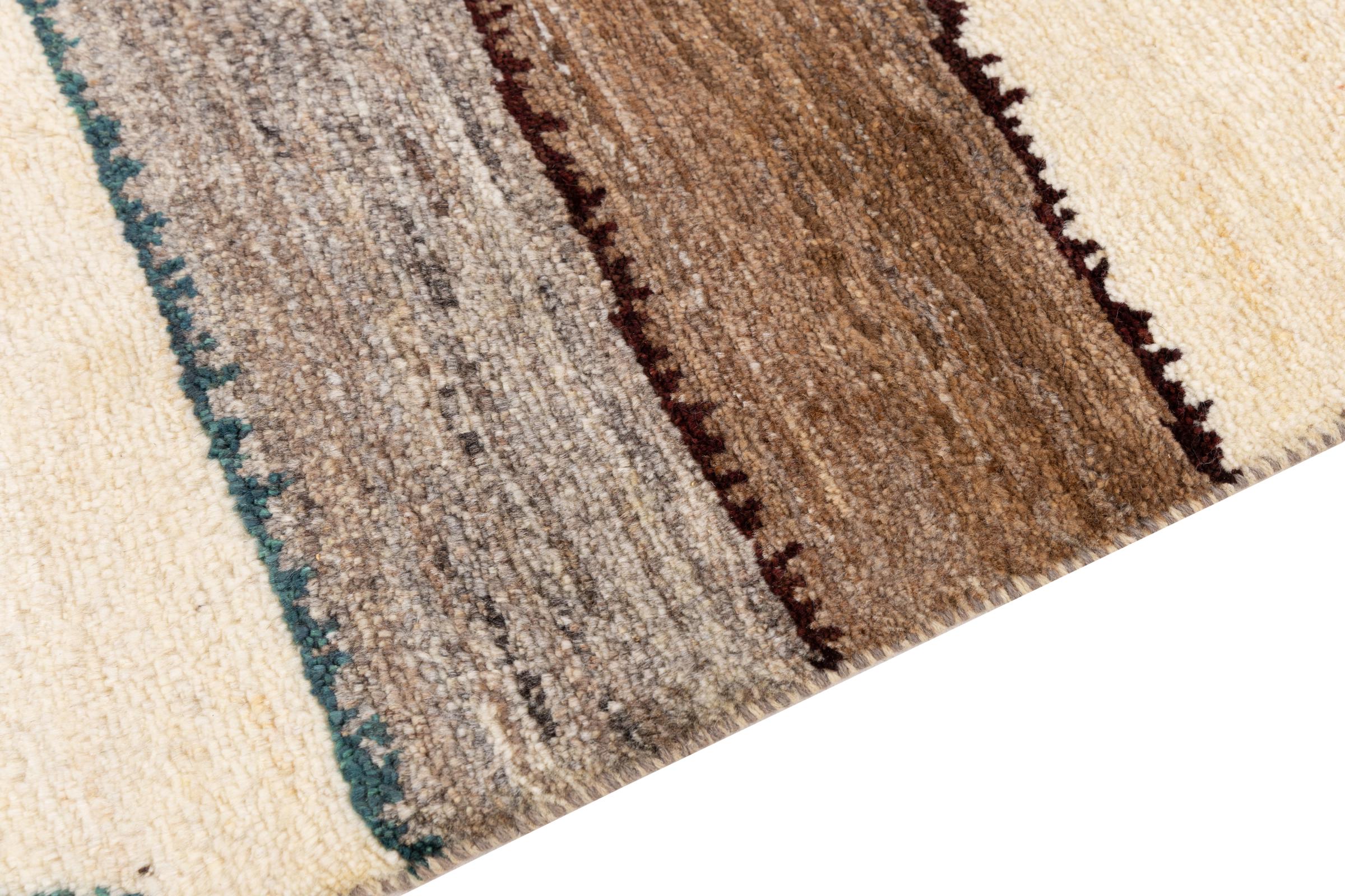 Ce tapis persan gabbeh est capable de séduire immédiatement n’importe qui grâce à sa haute qualité et à son robuste velours. Il a été fabriqué artisanalement par les nomades Ghasghai dans la région de Fars au sud de la Perse, à partir de la meilleure laine de mouton. Ils utilisent seulement des couleurs naturelles pour colorer la laine.
