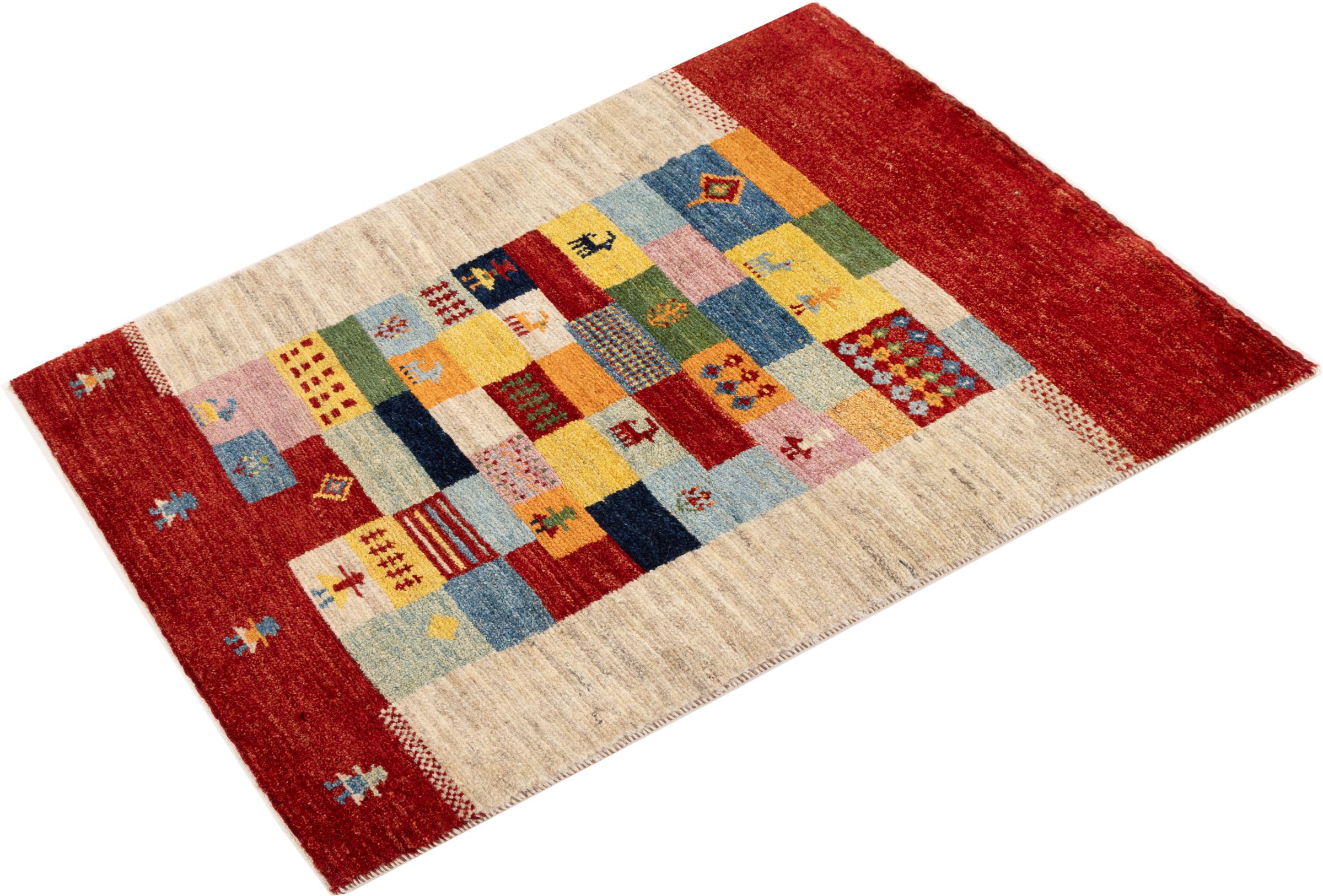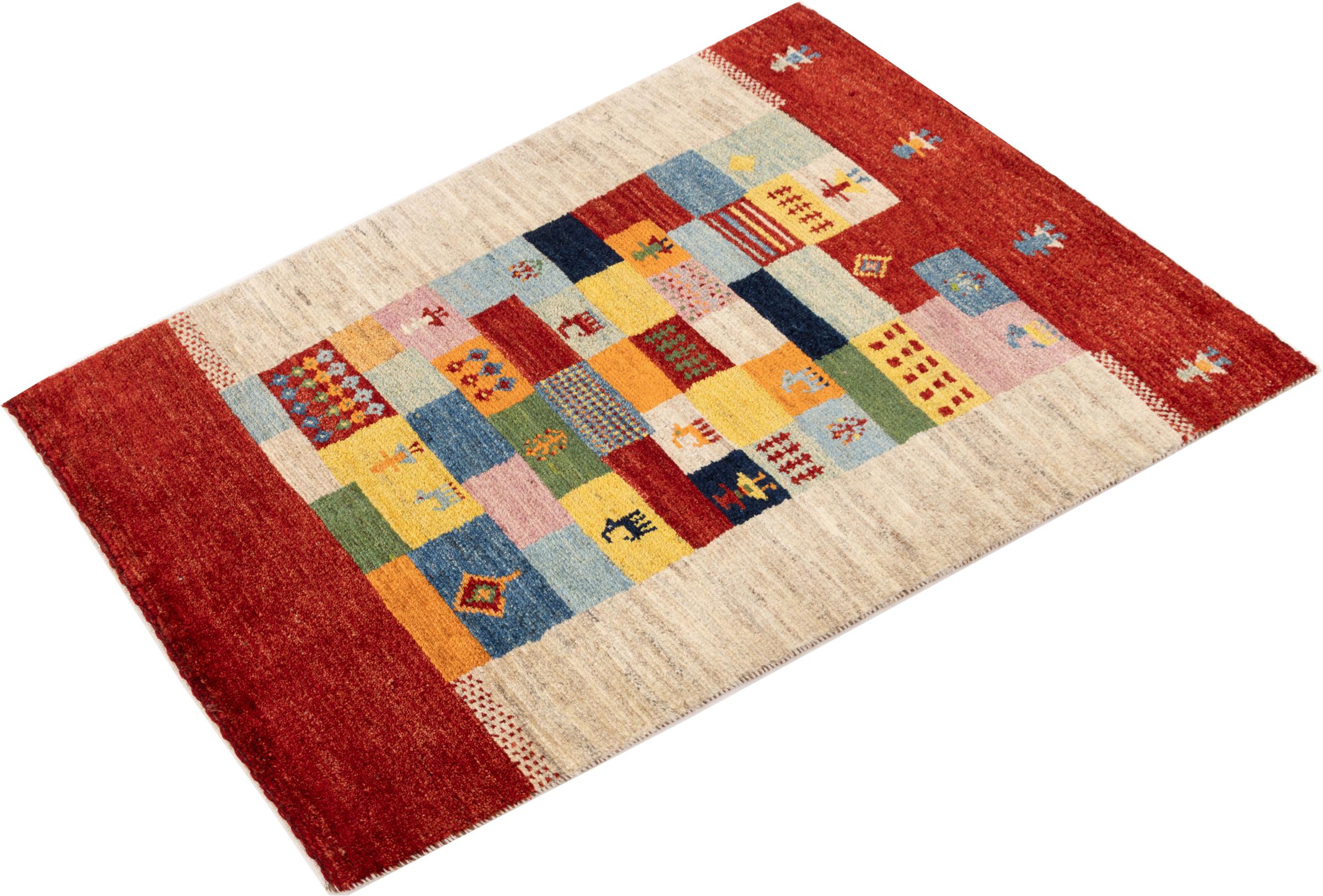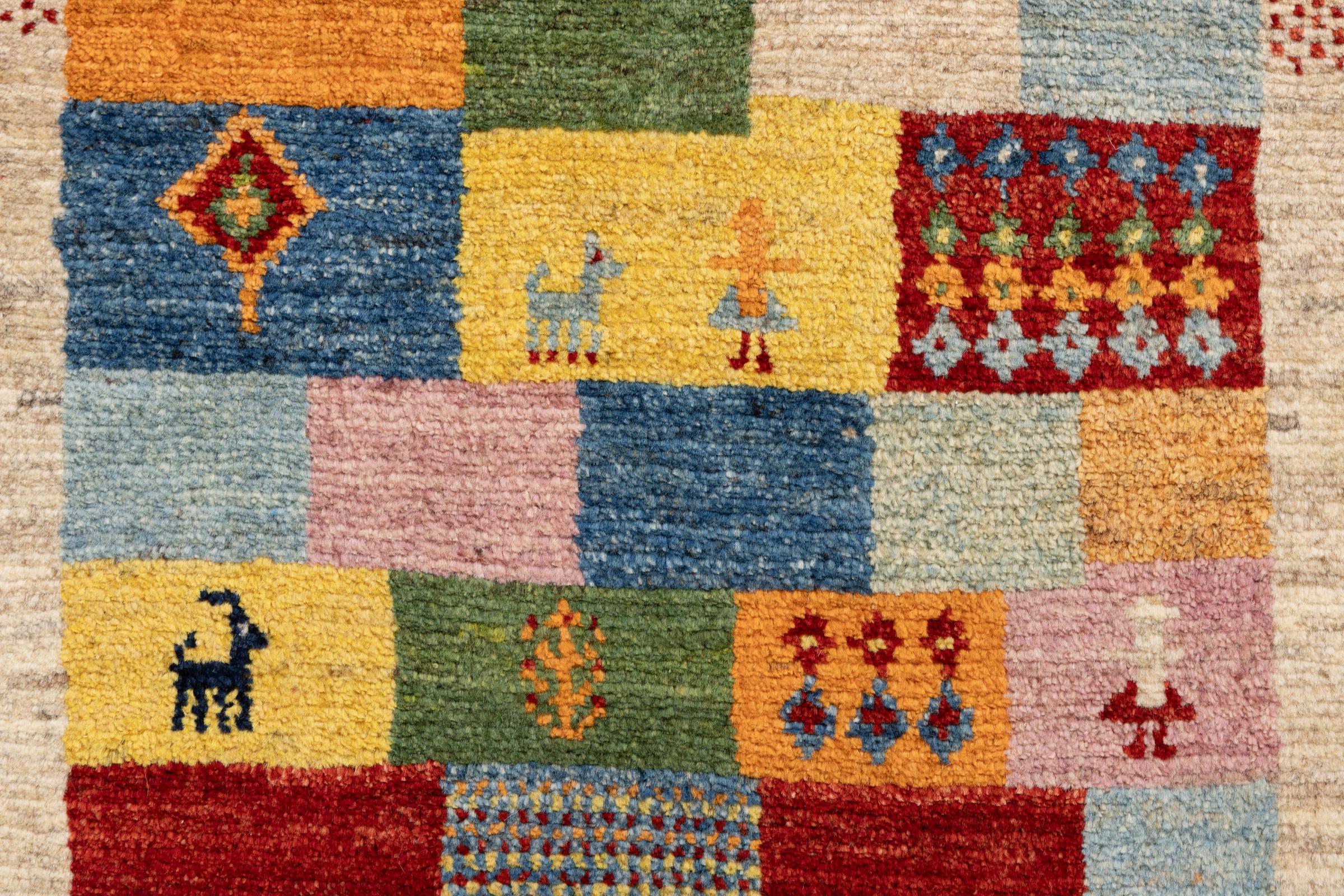 Ce tapis persan gabbeh est capable de séduire immédiatement n’importe qui grâce à sa haute qualité et à son robuste velours. Il a été fabriqué artisanalement par les nomades Ghasghai dans la région de Fars au sud de la Perse, à partir de la meilleure laine de mouton. Ils utilisent seulement des couleurs naturelles pour colorer la laine.