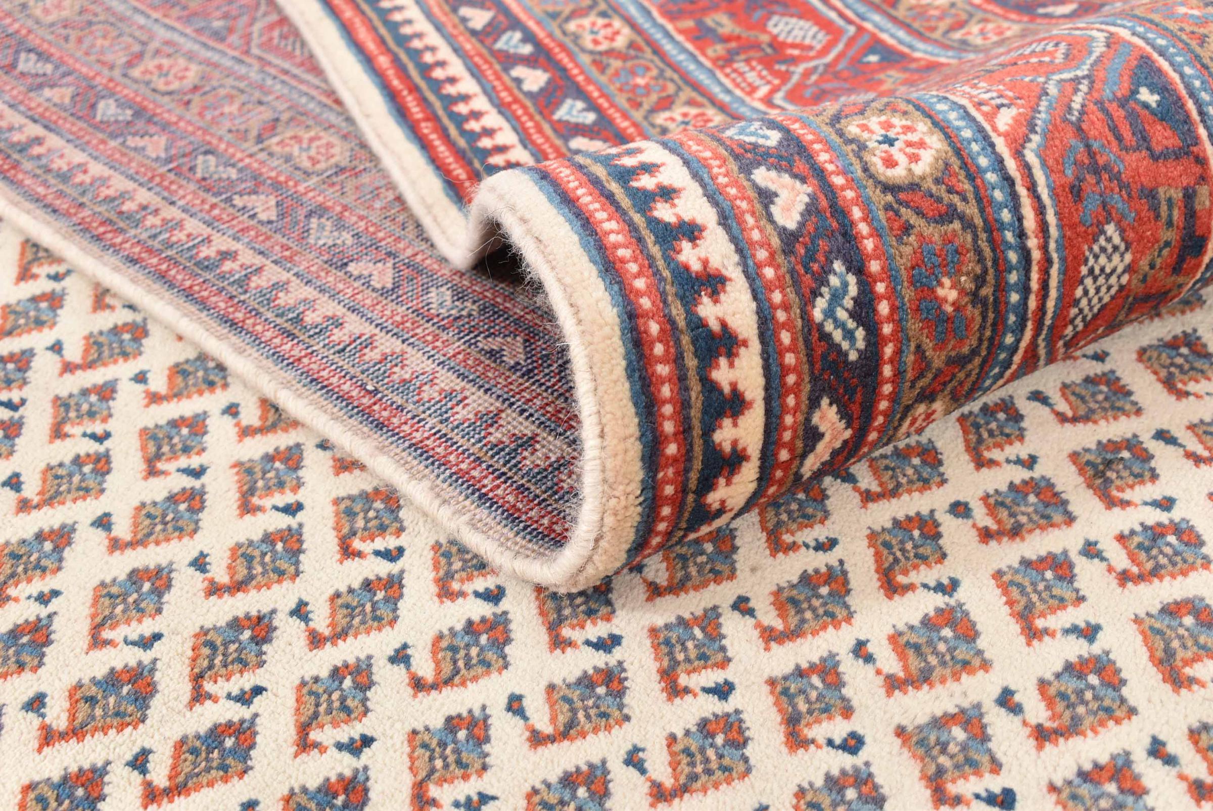 Ce tapis est fait de laine de mouton filée à la main de la plus haute qualité. En Iran (ancienne Perse), en Afghanistan et au Pakistan notamment, la laine est encore filée à la main avant que ne commence le nouage proprement dit du tapis. La laine a fait ses preuves en tant que matière naturelle et extrêmement résistante au fil des siècles. Il a notamment des propriétés antisalissures et d'isolation thermique. En même temps, la laine est incomparablement douce et a un éclat naturel.