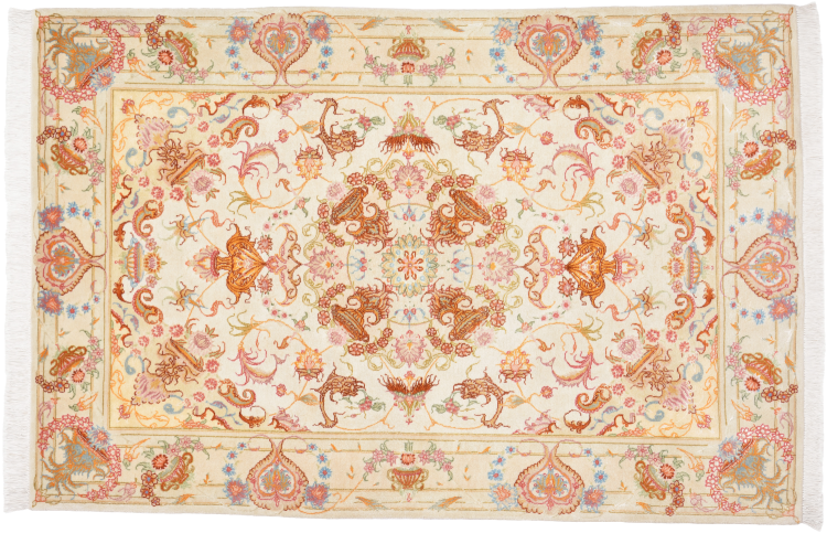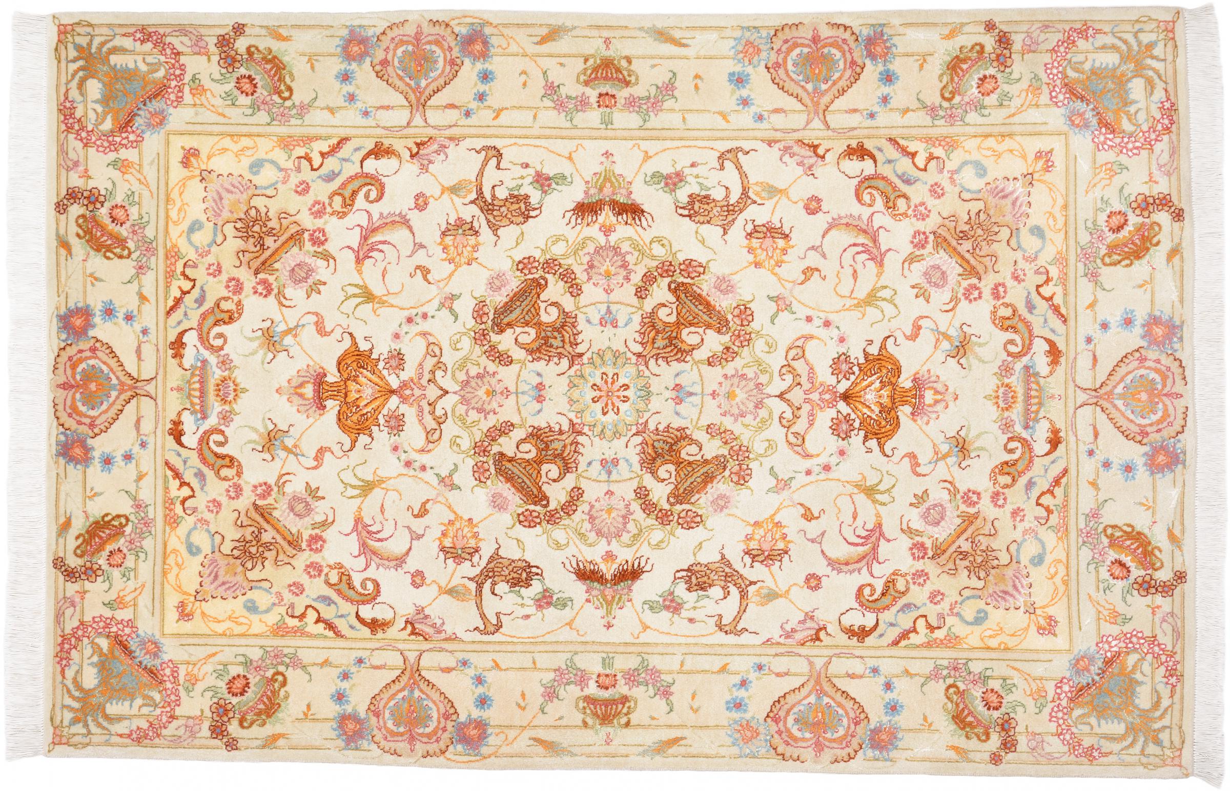 Réf. Article: 67020006281075 Taille: 152x102 cm Épaisseur: ap. 7 mm Densité de nouage: 450 000 - 500 000 / m² Fabrication: Noué à la main Velours: Laine avec de la soie Chaîne: Coton Origine: Persie / Iran Âge: Nouveau Poids: ap. 5 kg Également connu sous Tabriz, Tabris, Täbris, Tebriz, Tebris, 40Raj, 50Raj Nombre en stock: Unique - Seulement 1 en stock