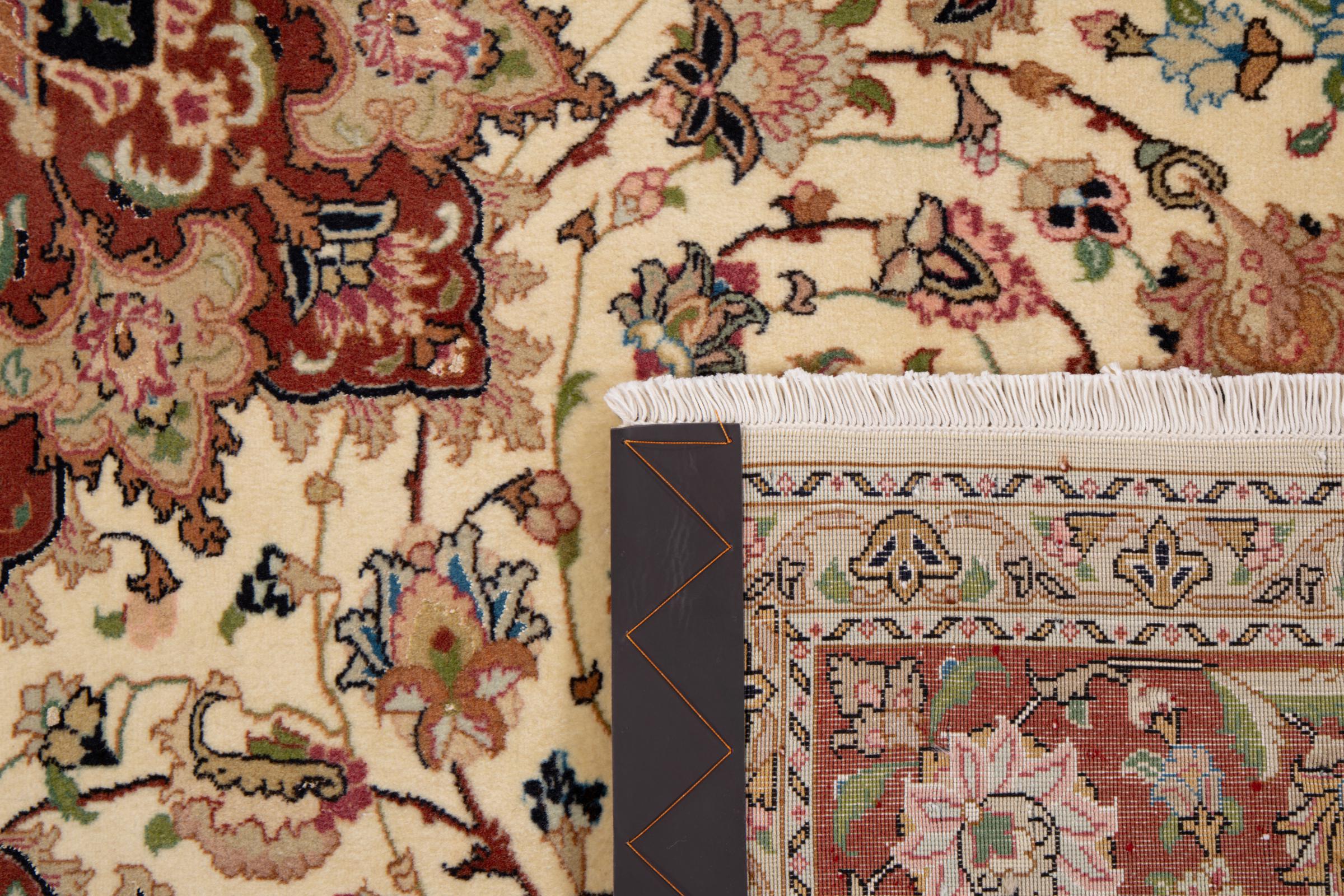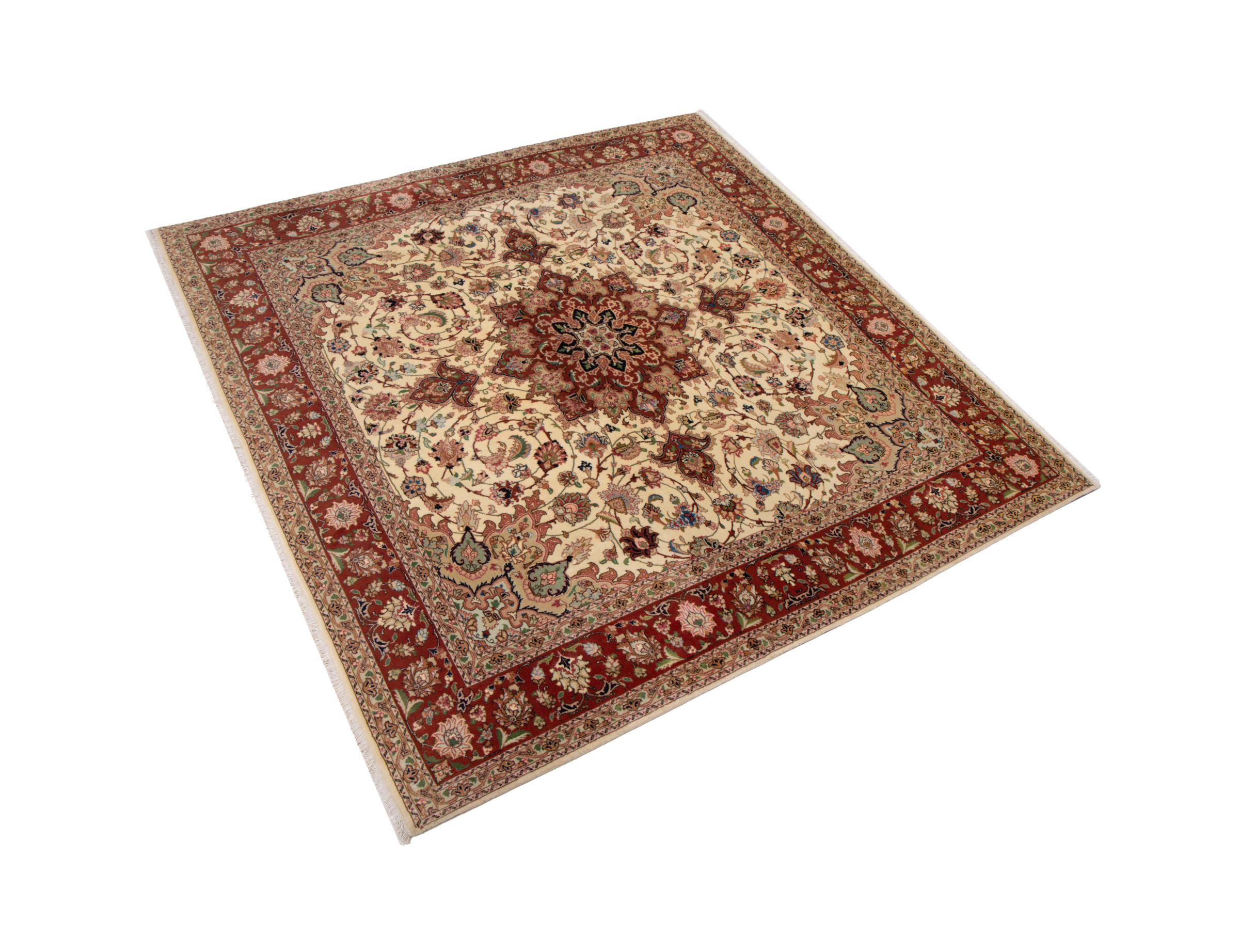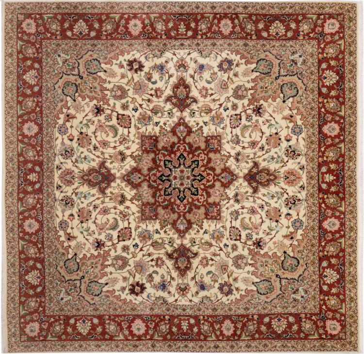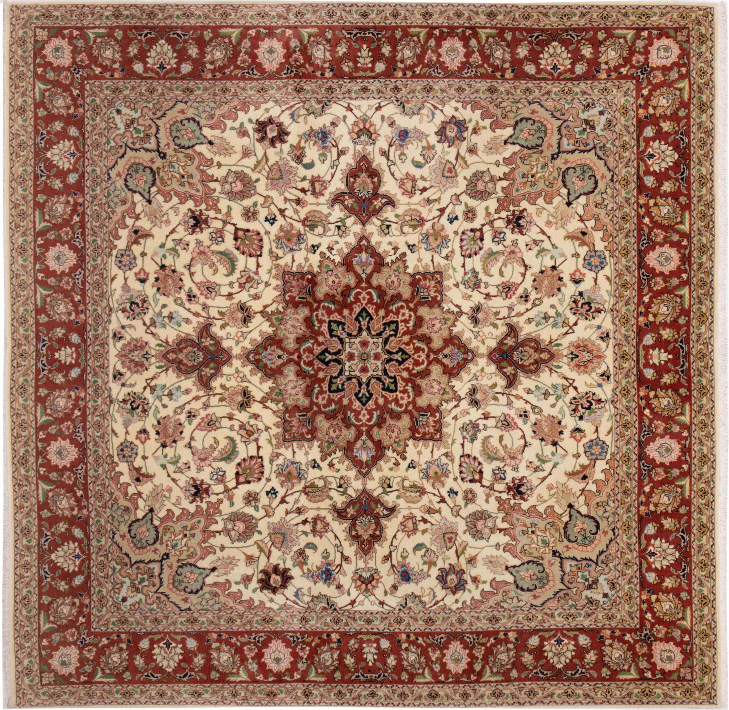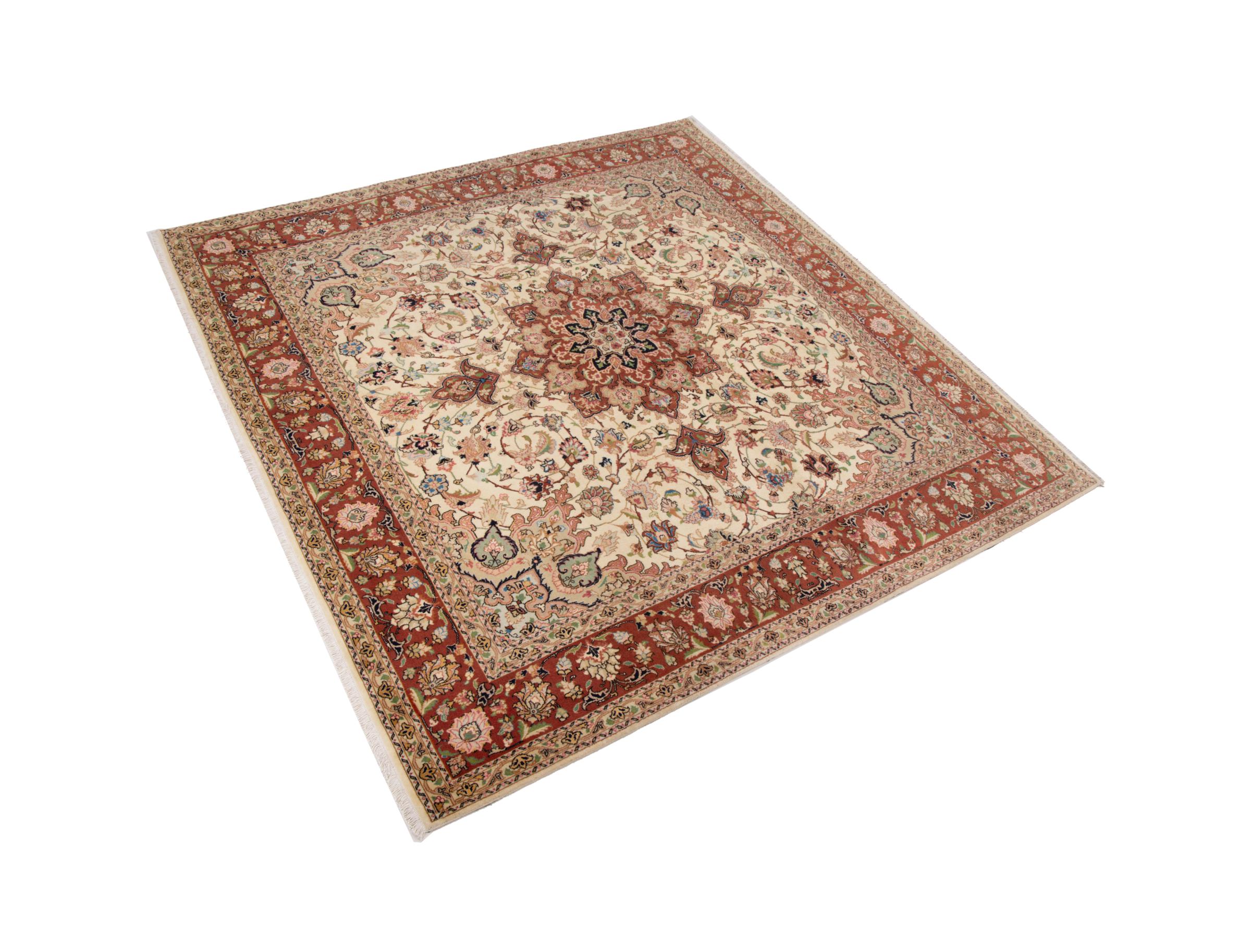 Réf. Article: 293026005657764 Taille: 201x199 cm Épaisseur: ap. 7 mm Densité de nouage: 440 000 - 490 000 / m² Fabrication: Noué à la main Velours: Laine avec de la soie Chaîne: Coton Origine: Persie / Iran Âge: Nouveau Poids: ap. 12 kg Également connu sous Tabriz, Tabris, Täbris, Tebriz, Tebris, 40Raj, 50Raj Nombre en stock: Unique - Seulement 1 en stock